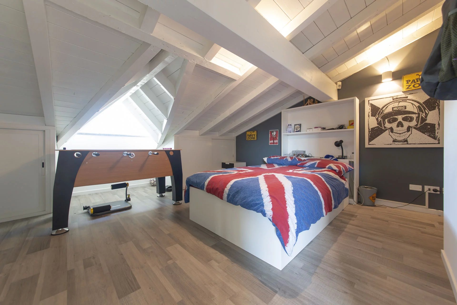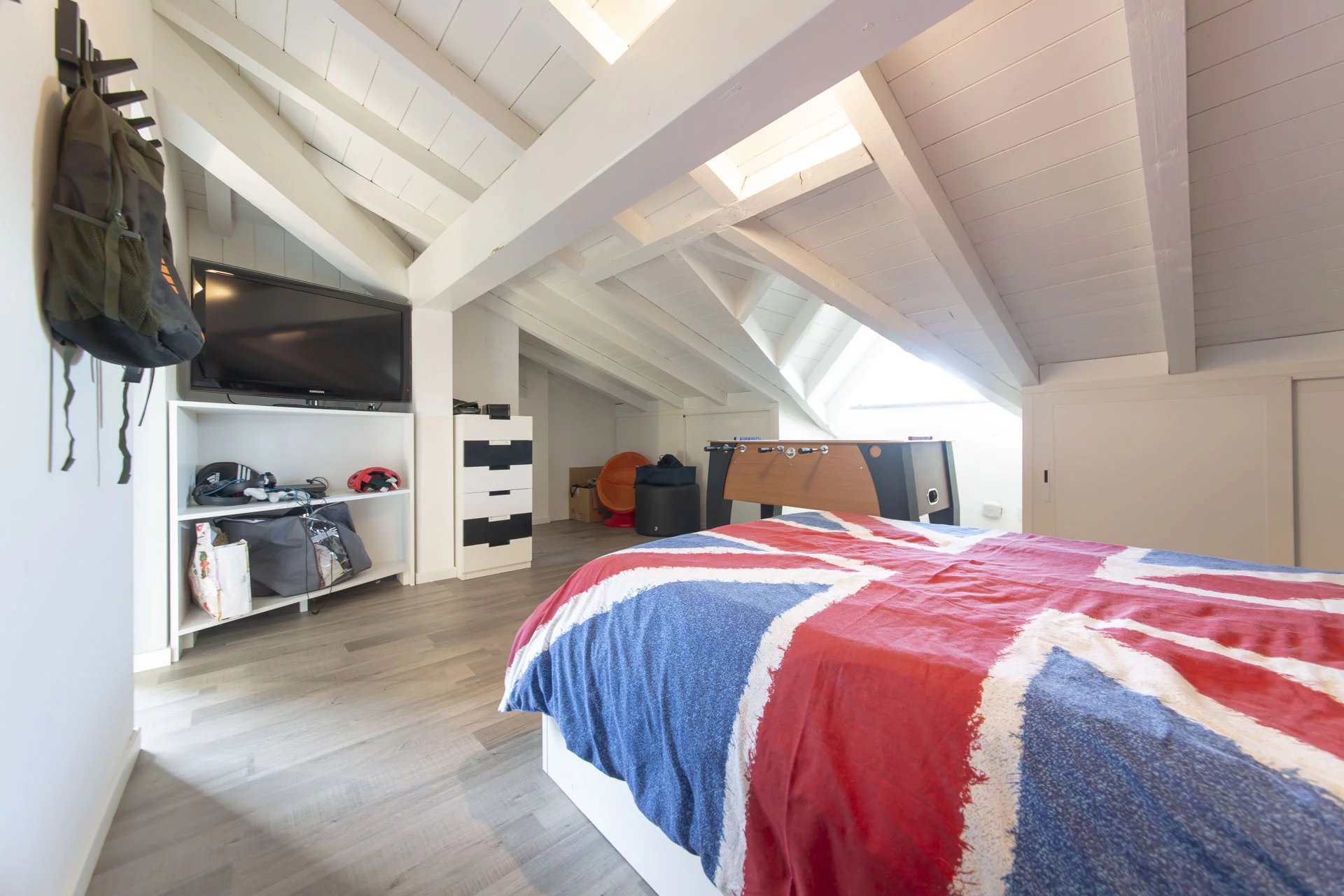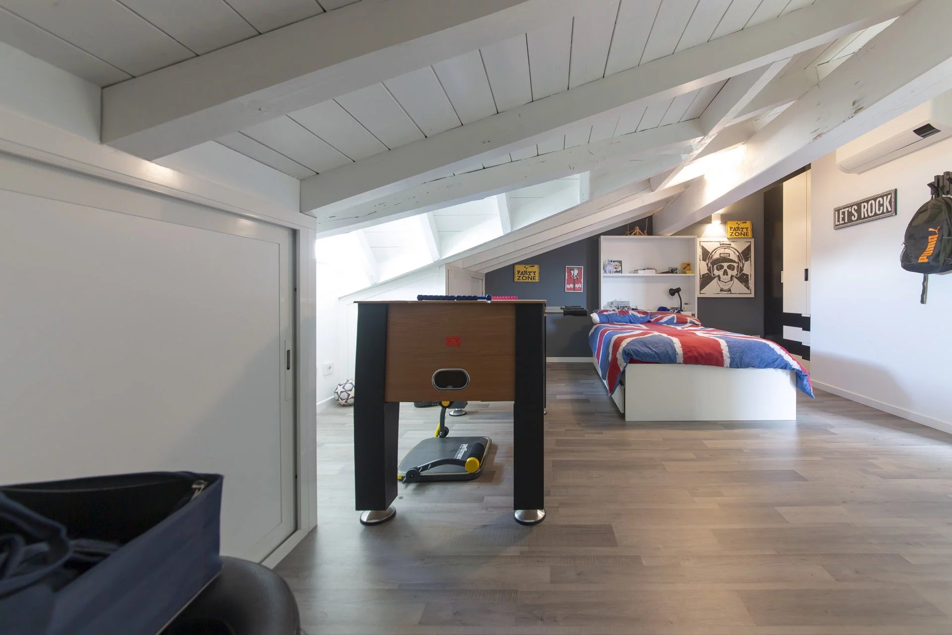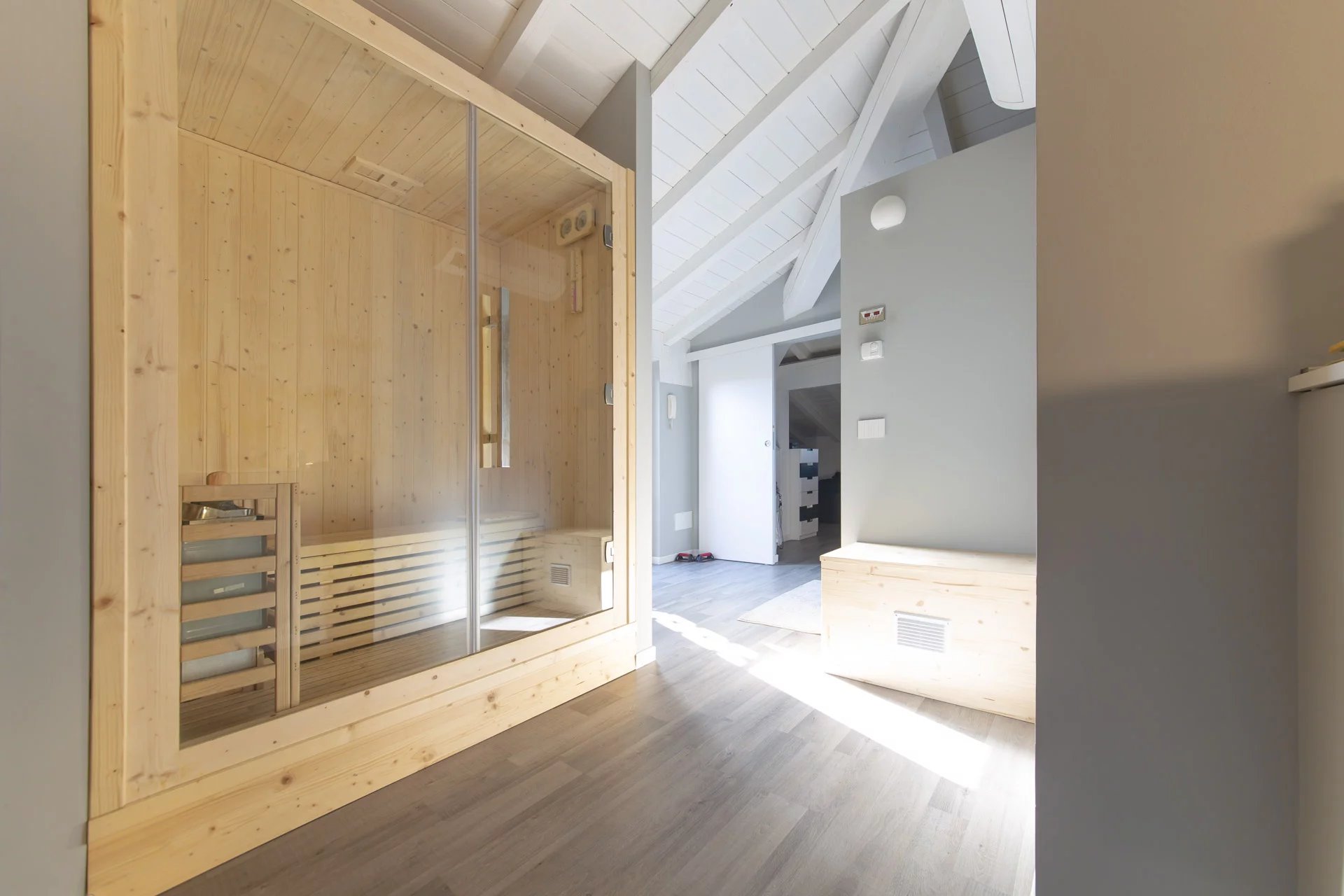 Al piano superiore, mansardato con travi a vista, è presente una camera, un bagno/lavanderia oltre a zona wellness con sauna e bagno turco. Terrazzo dotato di vasca idromassaggio da tre persone per un ambiente piacevole ed adatto ad ospitare le occasioni conviviali durante la bella stagione.