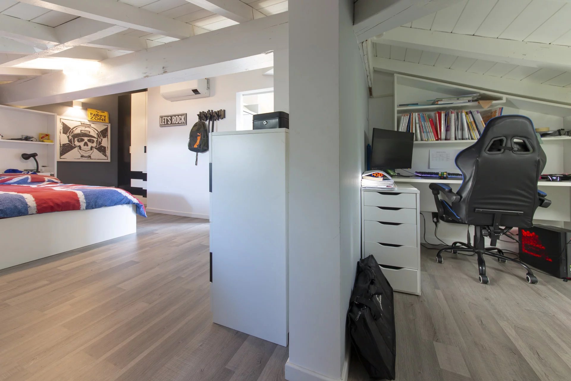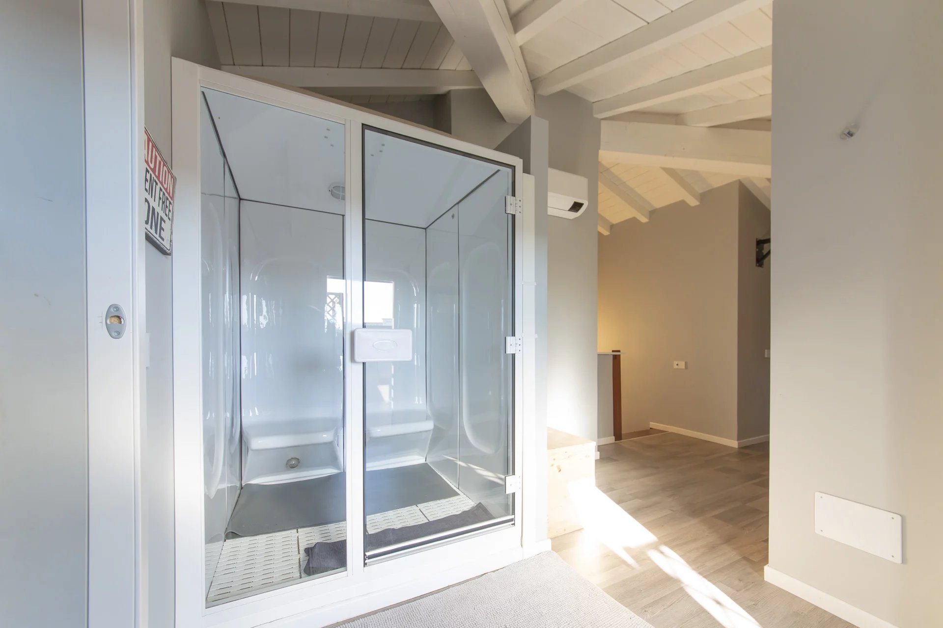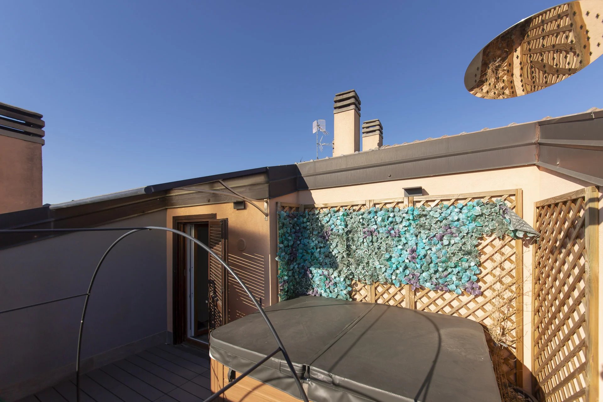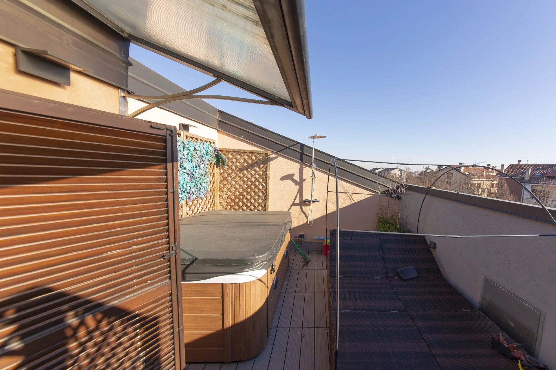 Al piano superiore, mansardato con travi a vista, è presente una camera, un bagno/lavanderia oltre a zona wellness con sauna e bagno turco. Terrazzo dotato di vasca idromassaggio da tre persone per un ambiente piacevole ed adatto ad ospitare le occasioni conviviali durante la bella stagione.