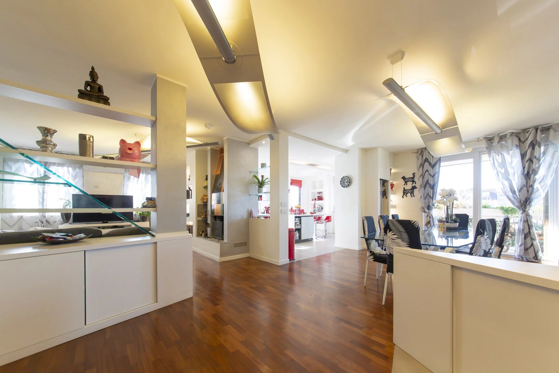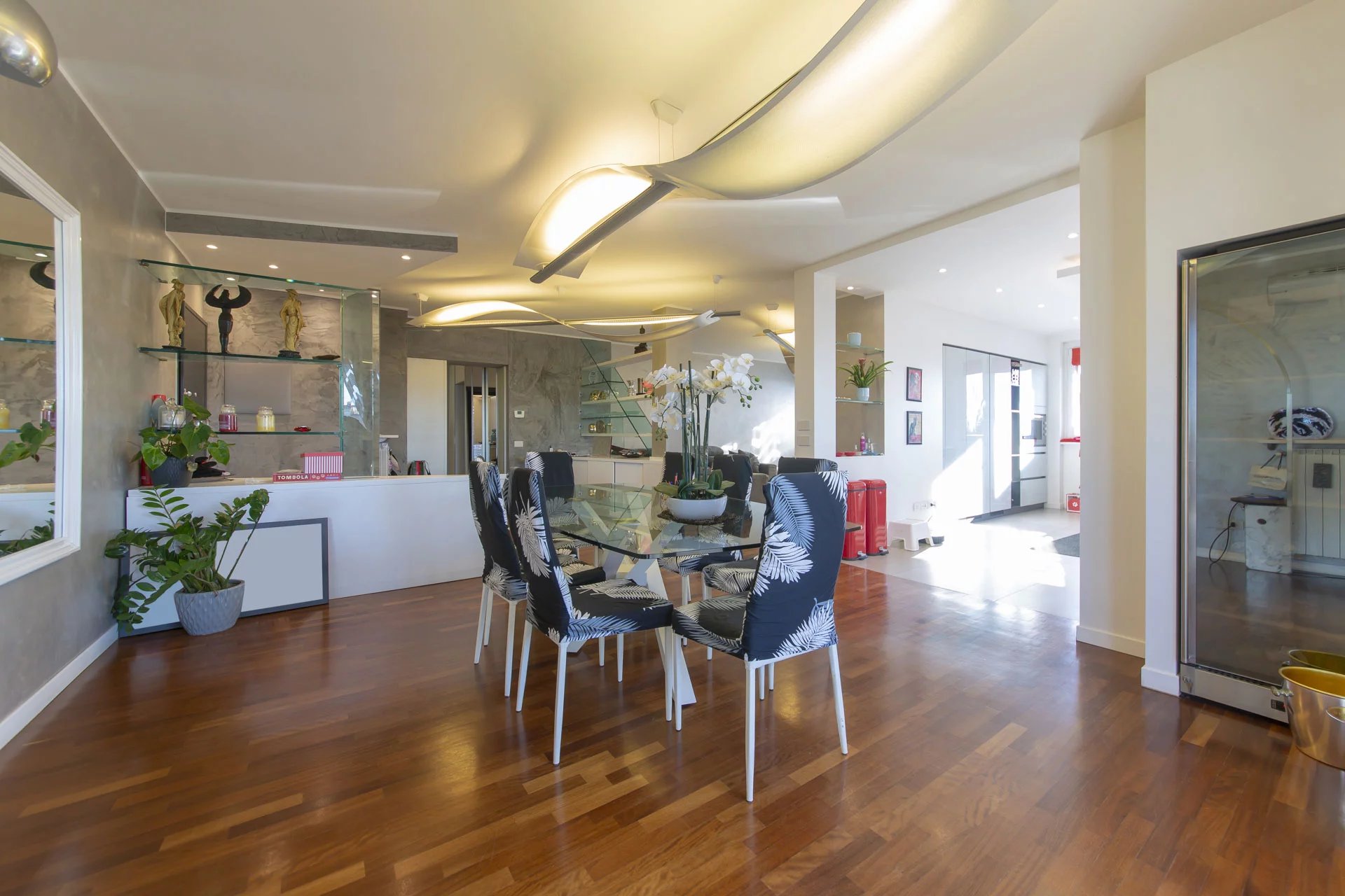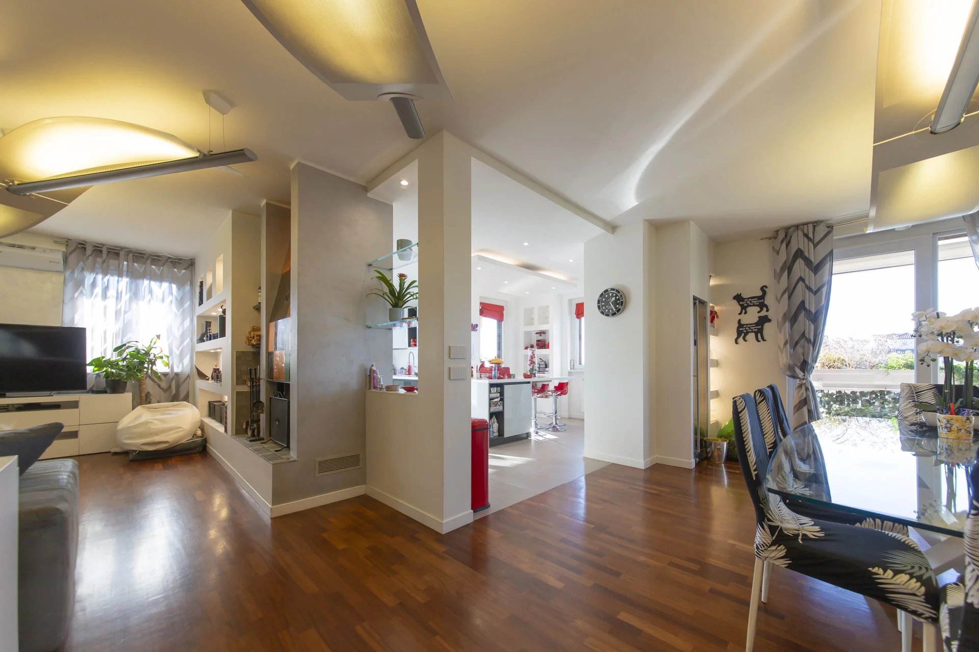 I volumi dell'attico sono stati sapientemente distribuiti: la proprietà gode di spazi ampi e luminosi, primo tra tutti la zona LIVING di 90mq che è caratterizzato dalla sua disposizione particolare e impreziosita dal camino.