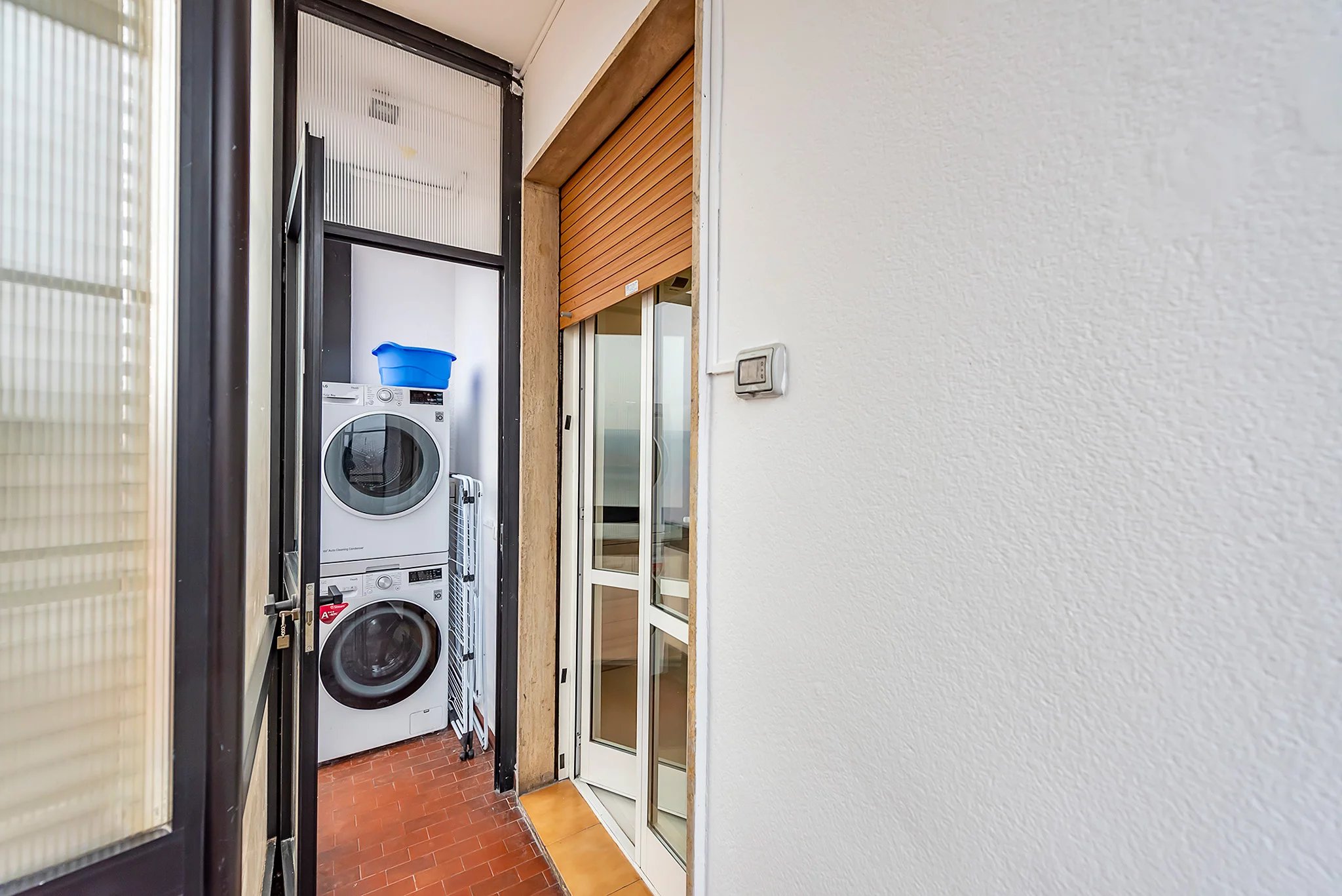 L’appartamento è composto da un ingresso, cucina abitabile con accesso al primo balcone, un ampio soggiorno, anch’esso con uscita sul balcone, la camera matrimoniale con accesso al terrazzino, dove è stata ricavata una comoda zona lavanderia con lavatrice e asciugatrice incluse. Bagno finestrato con doccia. La proprietà comprende inoltre una cantina al piano interrato.