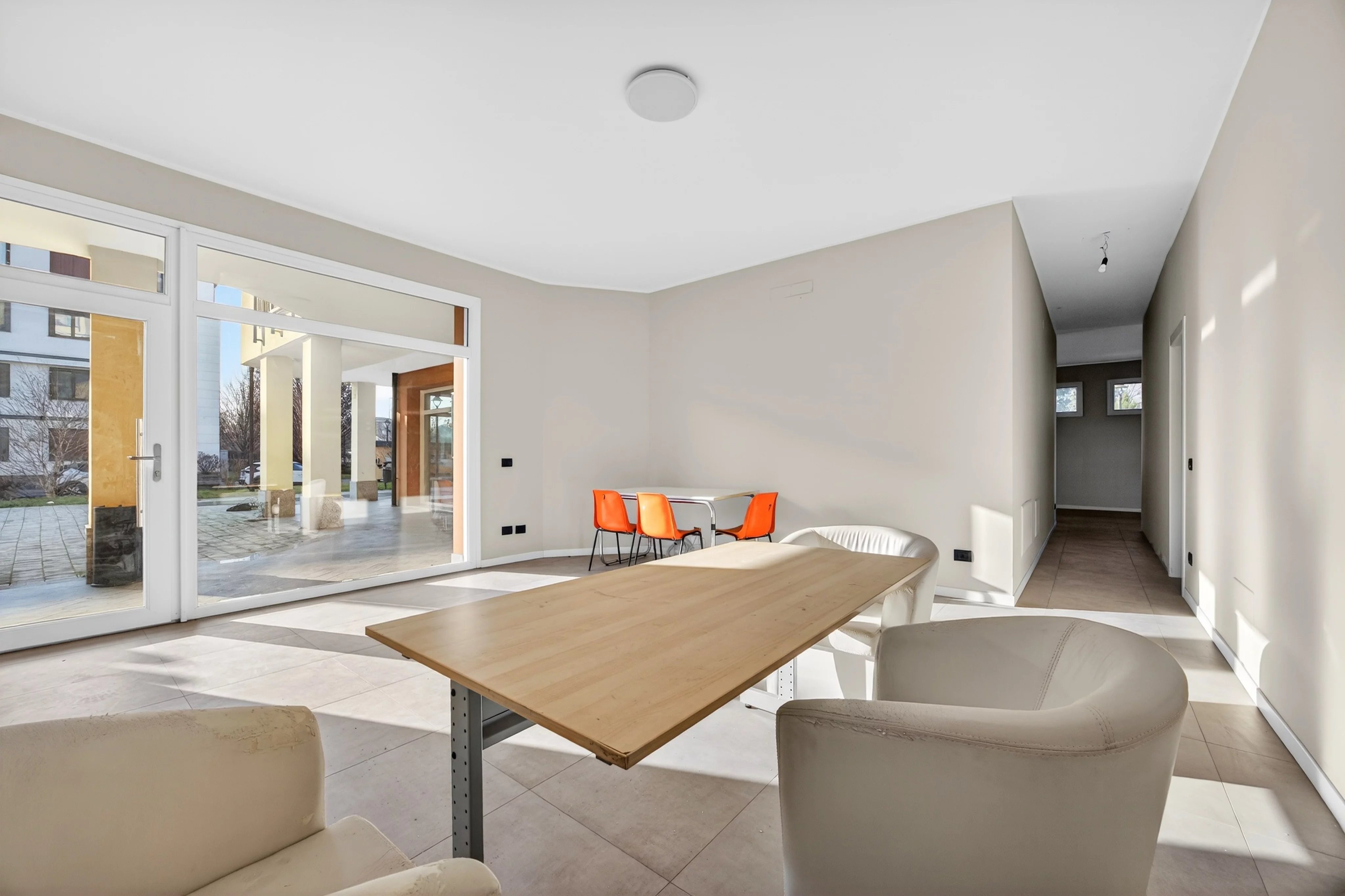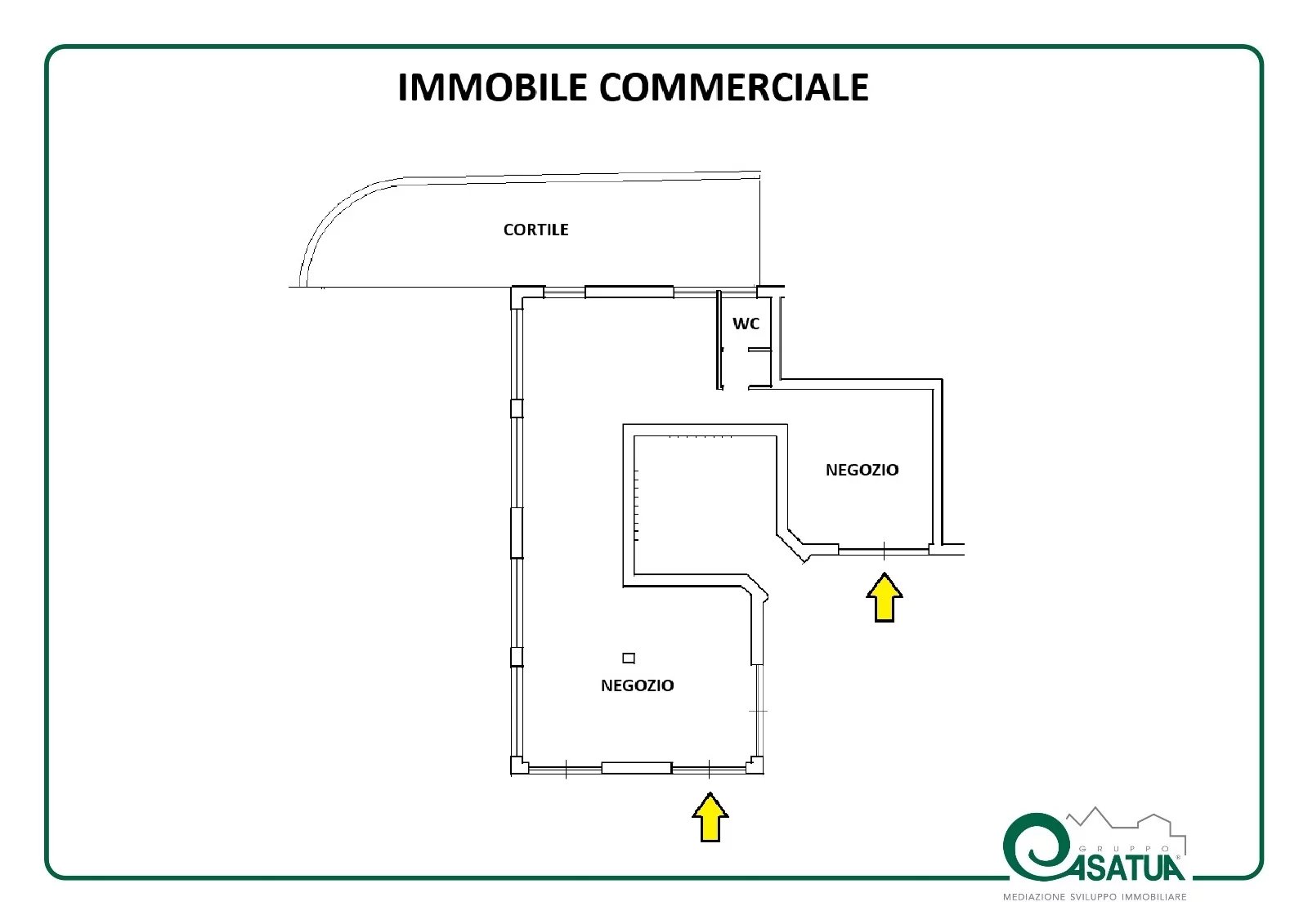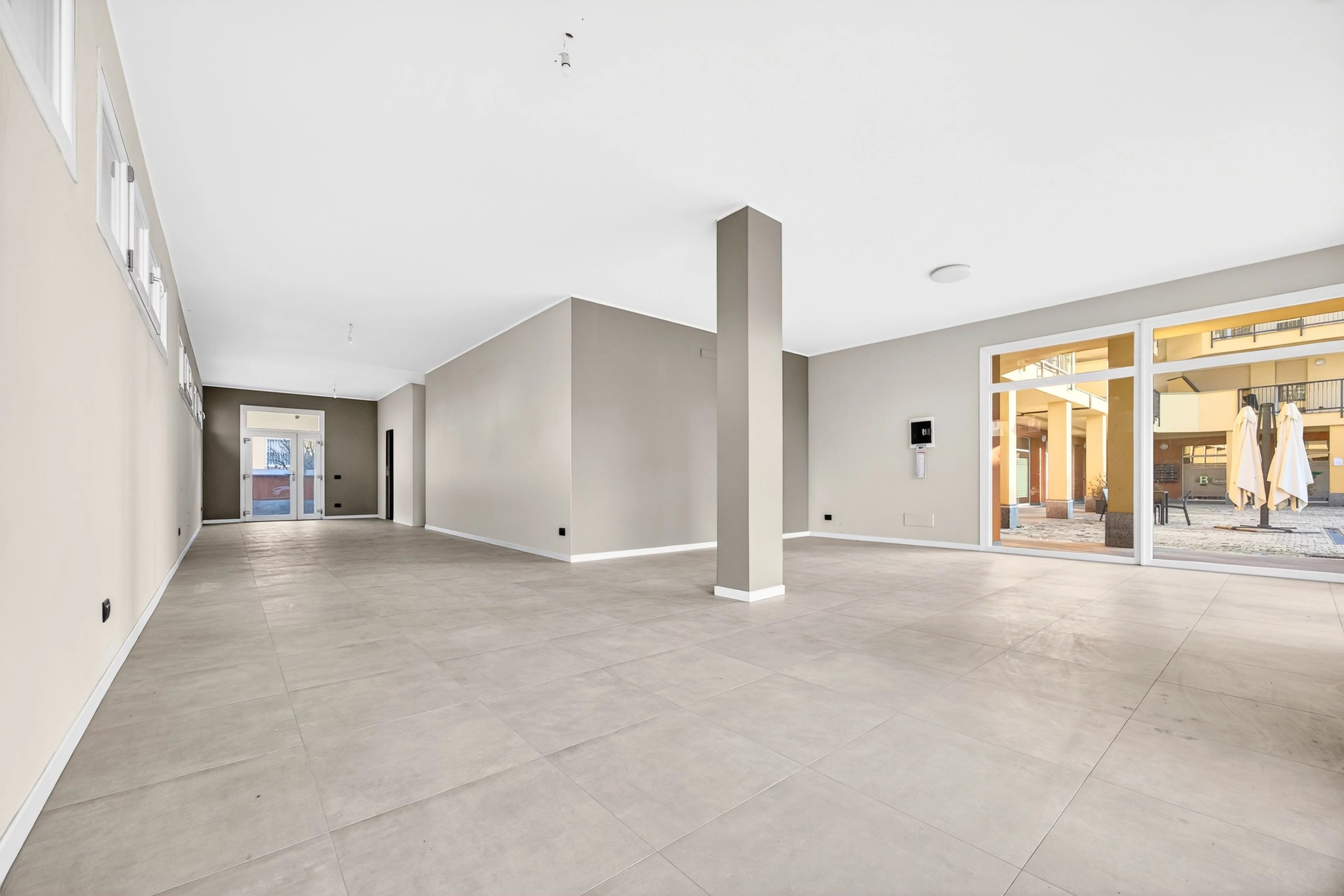 Il negozio si distingue per la presenza di quattro ampie vetrine e due ingressi indipendenti, elementi che garantiscono luminosità, visibilità e flessibilità nella gestione degli spazi. La proprietà comprende anche un cortile privato, un pratico locale archivio/deposito, oltre ad antibagno e bagno.