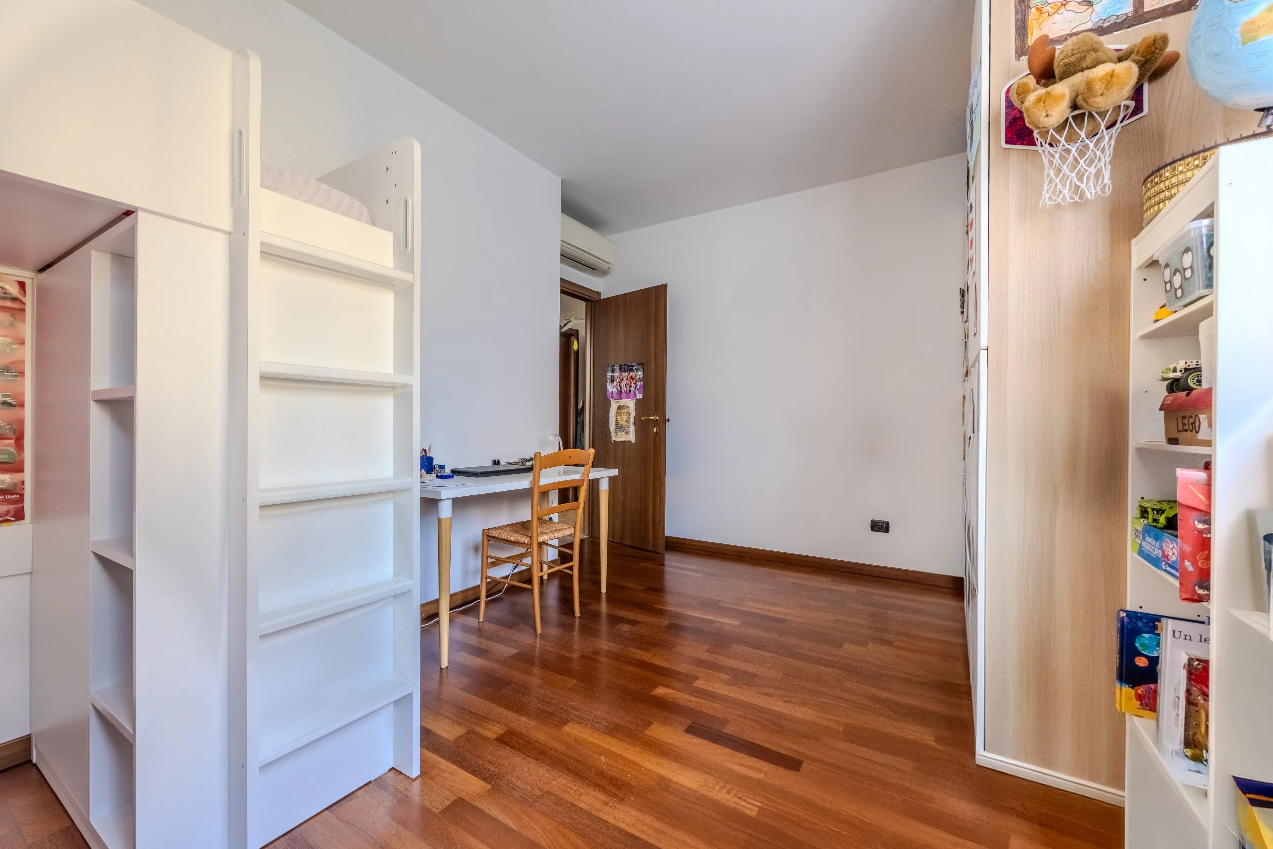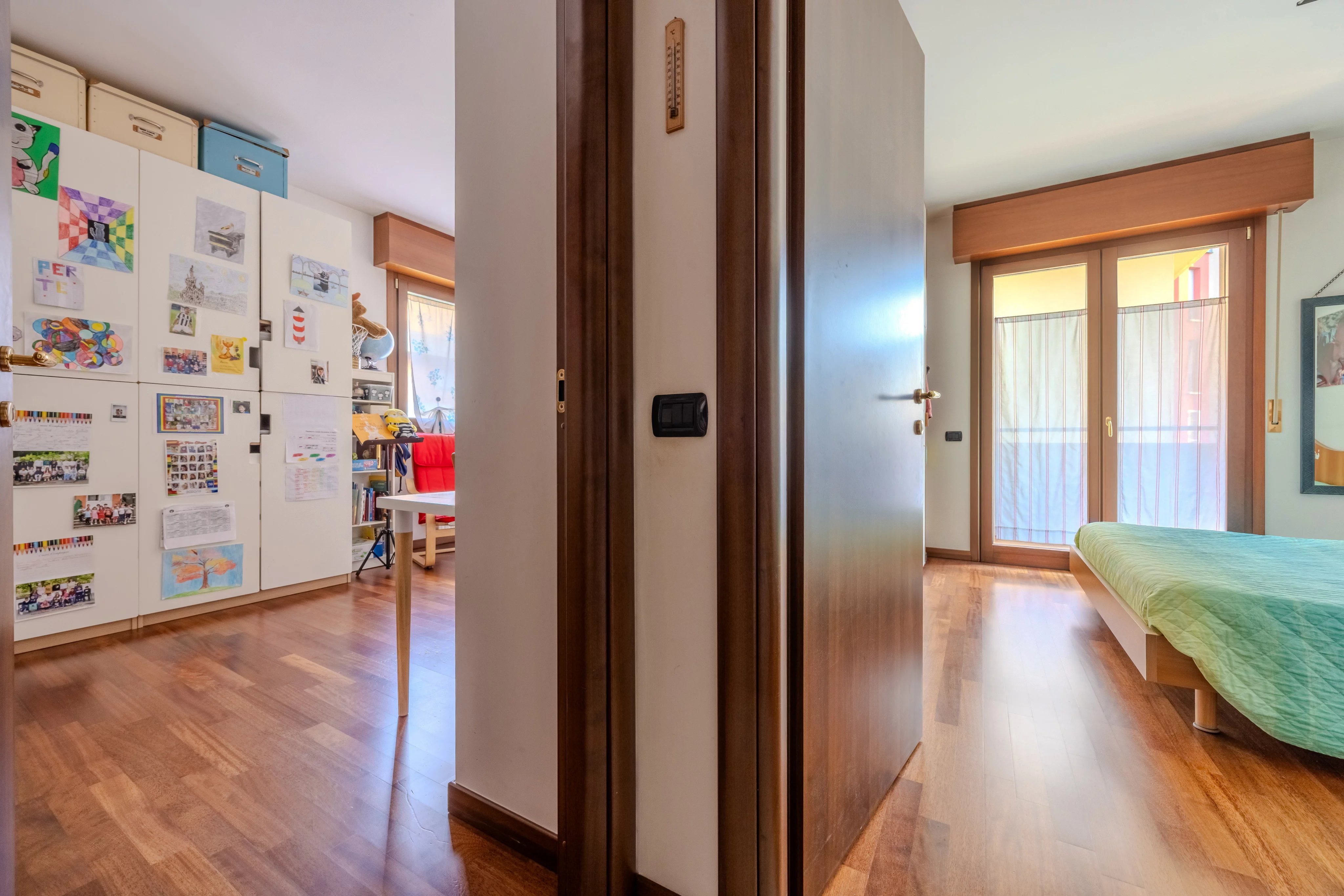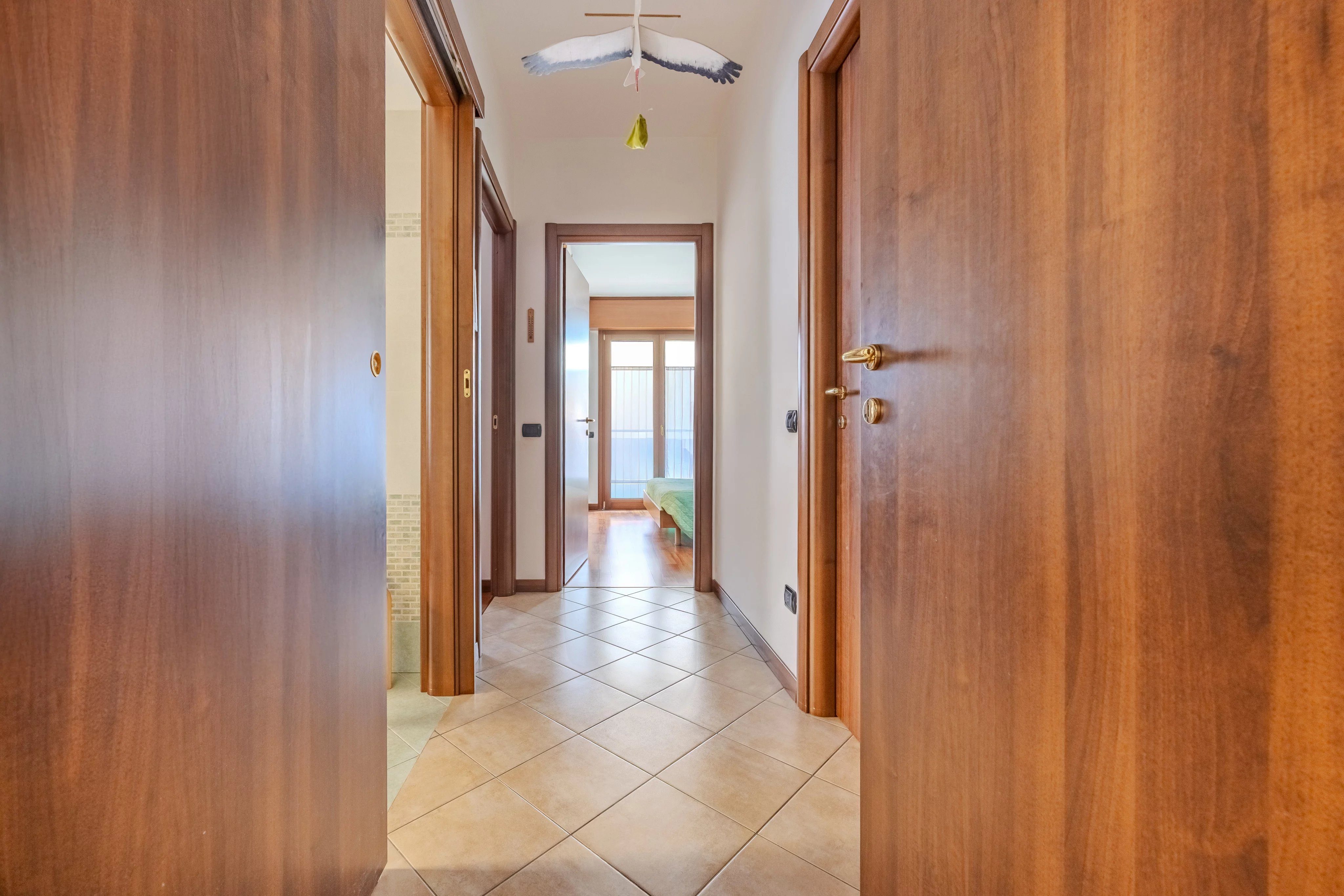 Un comodo disimpegno introduce la zona notte, composta da due ampie camere da letto e doppi servizi. Un secondo balcone di servizio aggiunge praticità agli spazi esterni.