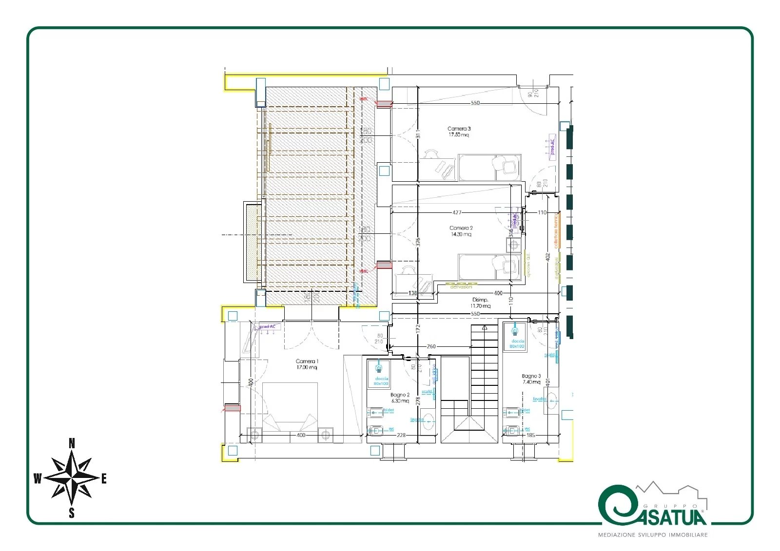Una comoda scala interna conduce al secondo livello, dove si sviluppano due ambienti adibiti a camere matrimoniali, un ambiente adibito a cameretta, tutti con affaccio su un terrazzo a cielo aperto che dona ulteriore luminosità e privacy. Il piano è arricchito da un secondo ed un terzo bagno entrambi finestrati e dalle affascinanti travi a vista, elemento distintivo che conferisce calore e carattere all’abitazione.