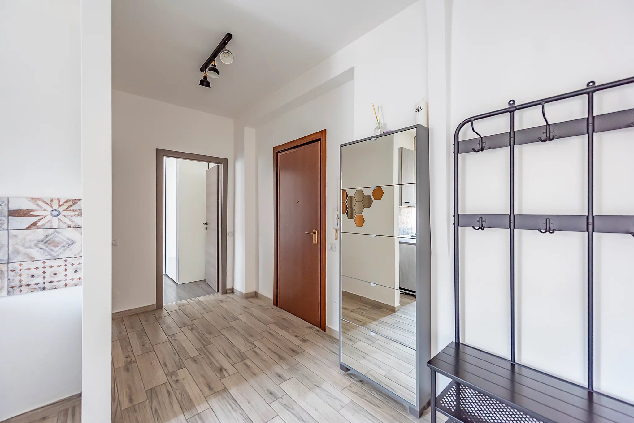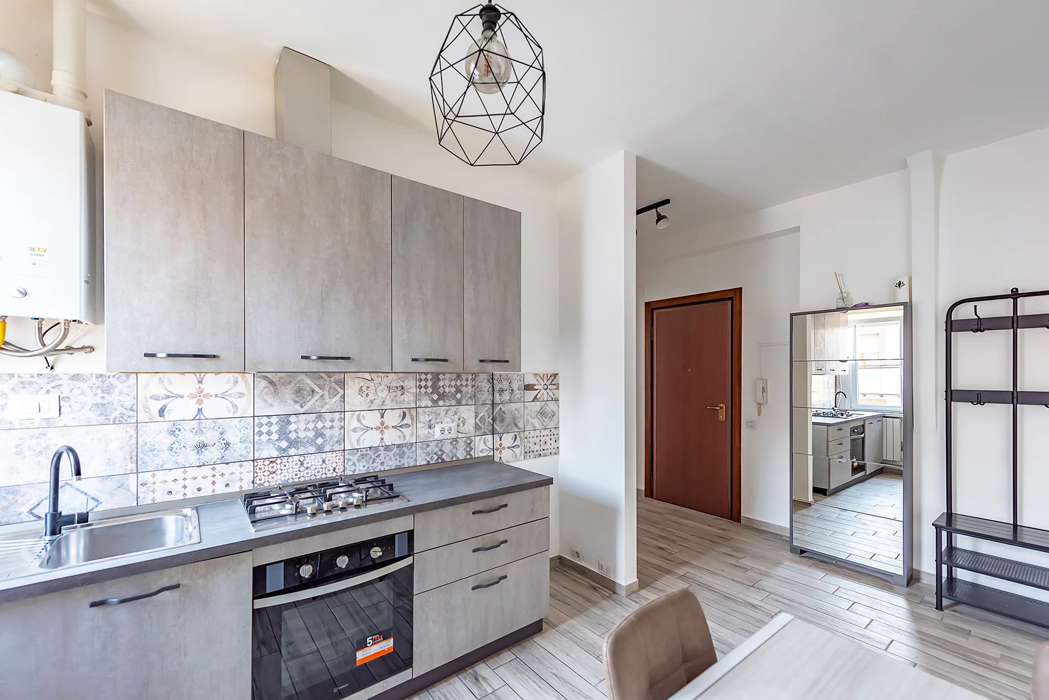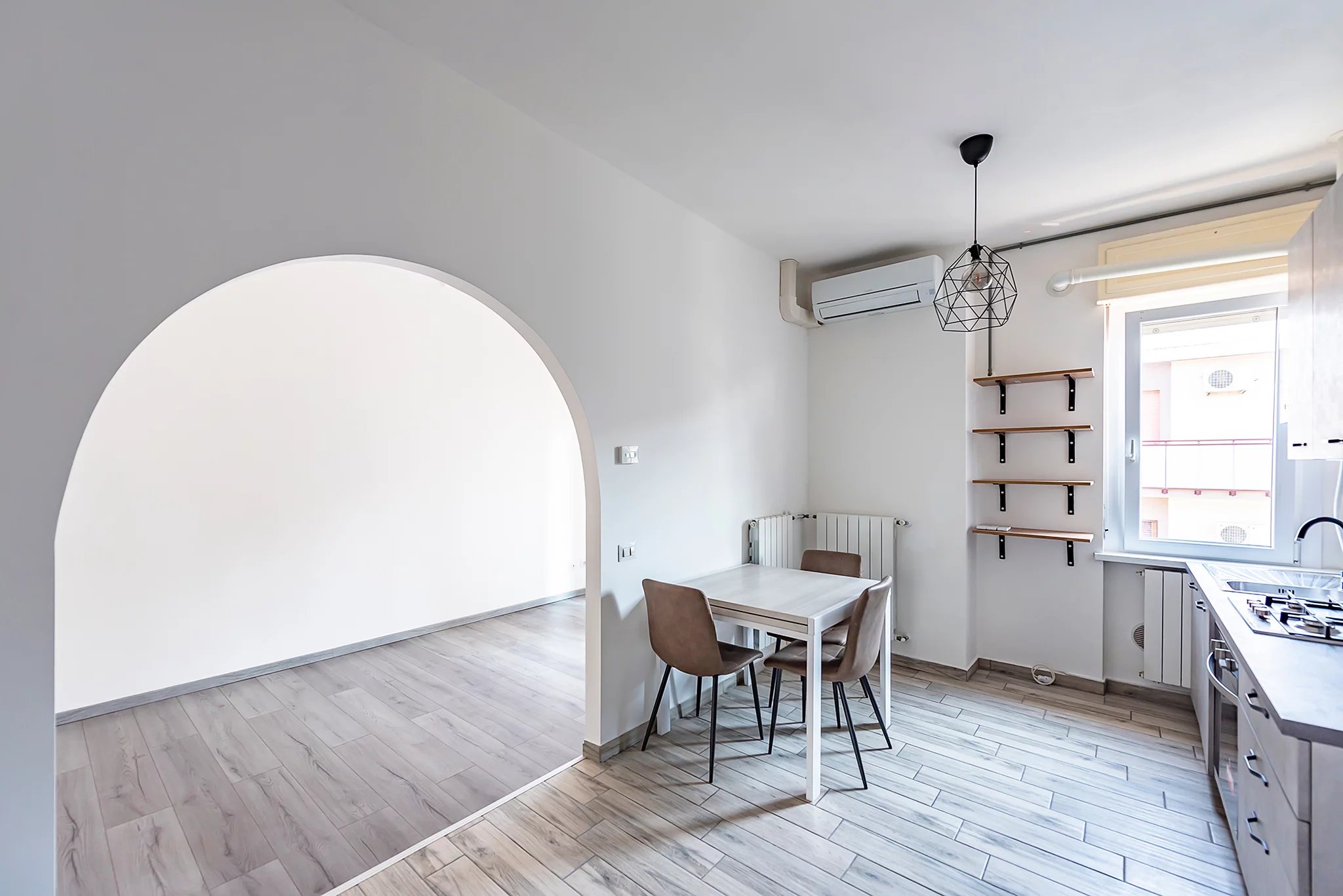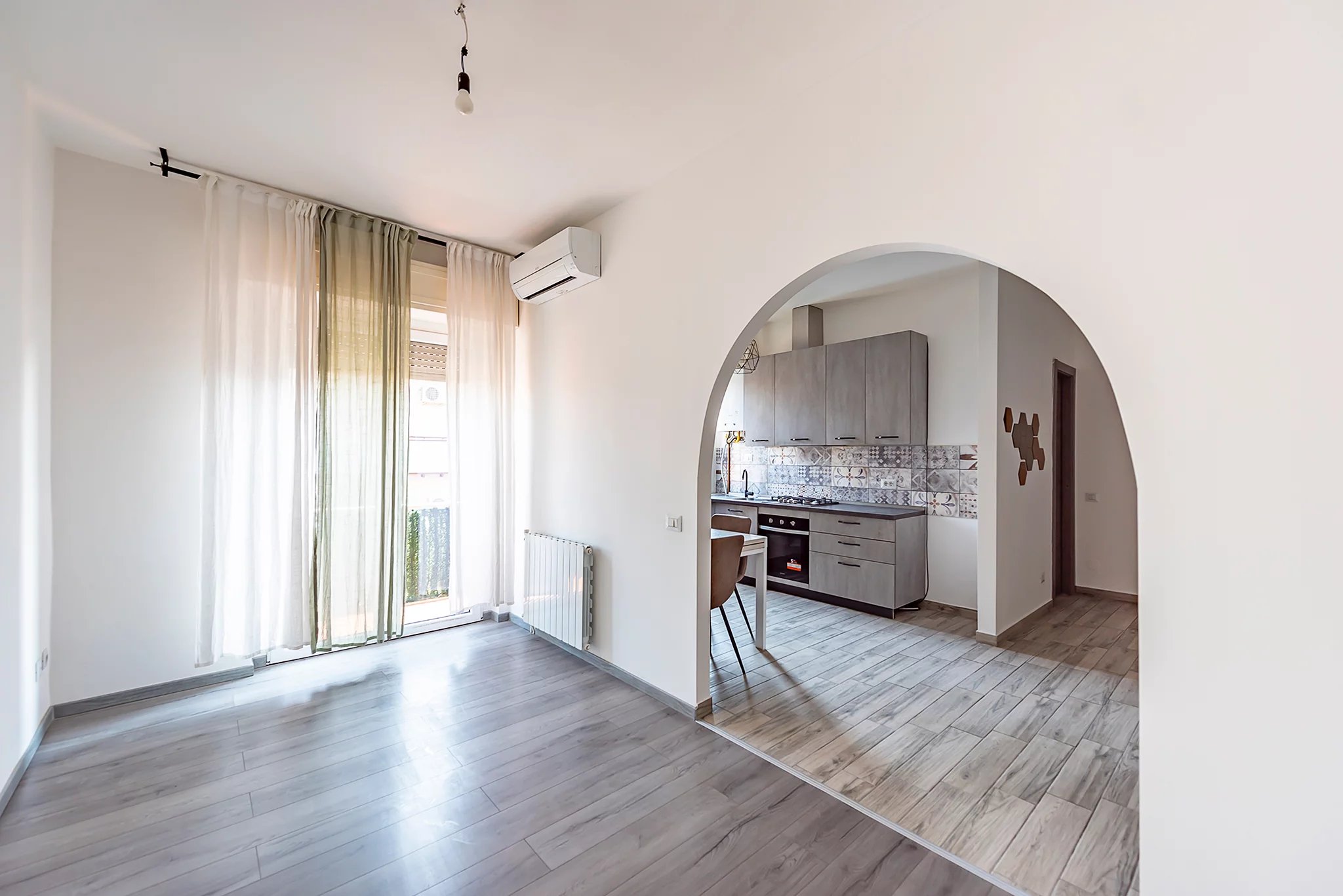 ampio ingresso, cucina abitabile a vista, luminoso soggiorno con accesso al balcone, camera matrimoniale di generose dimensioni e servizio finestrato con doccia.
