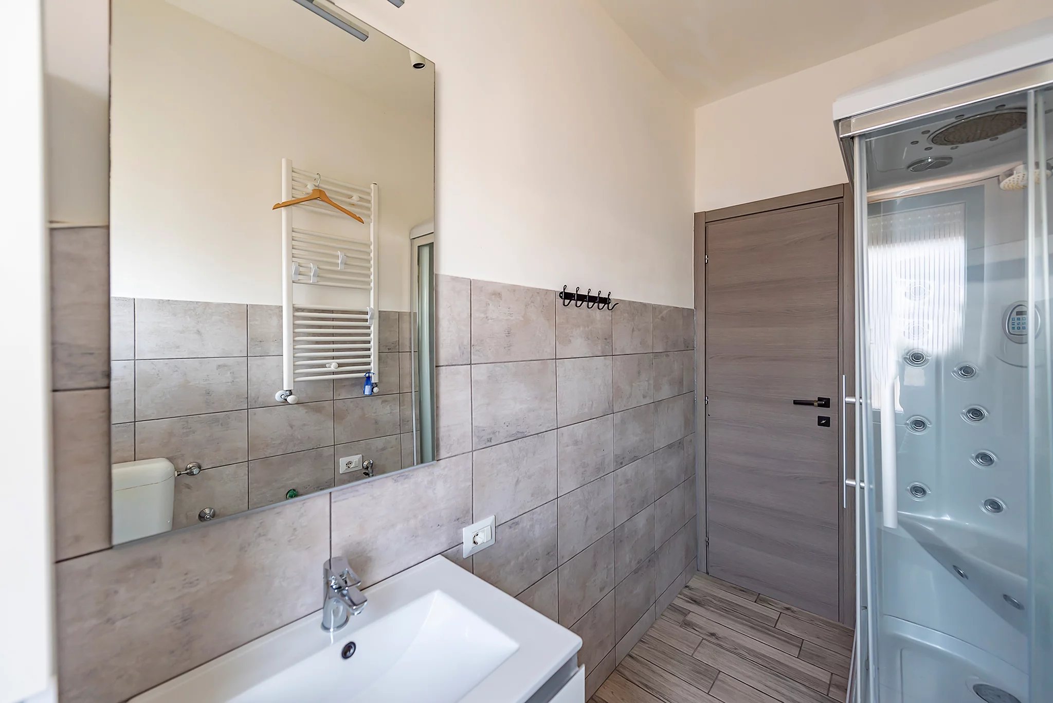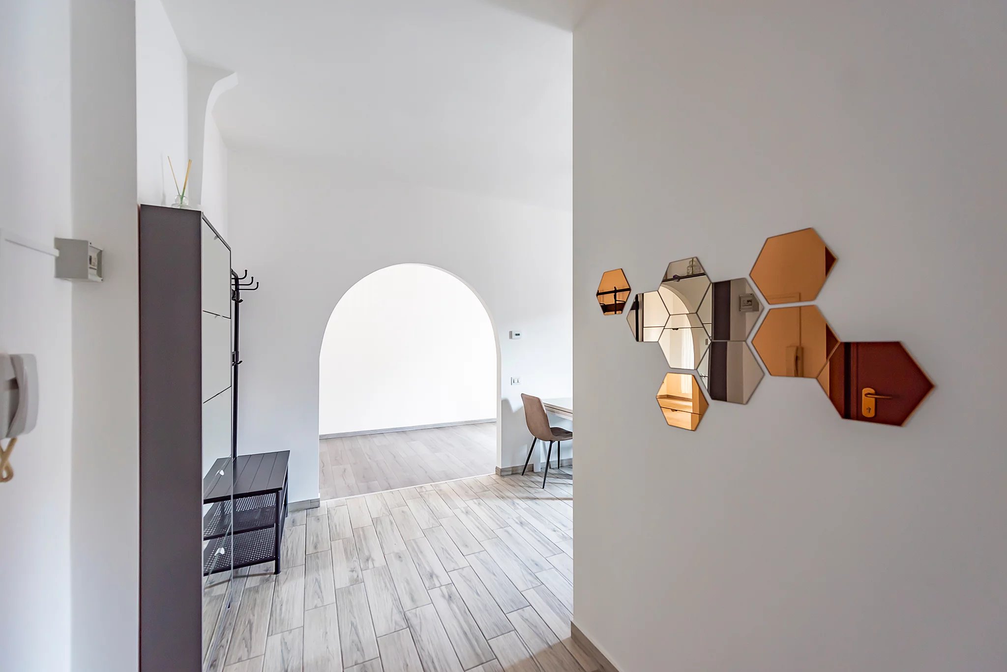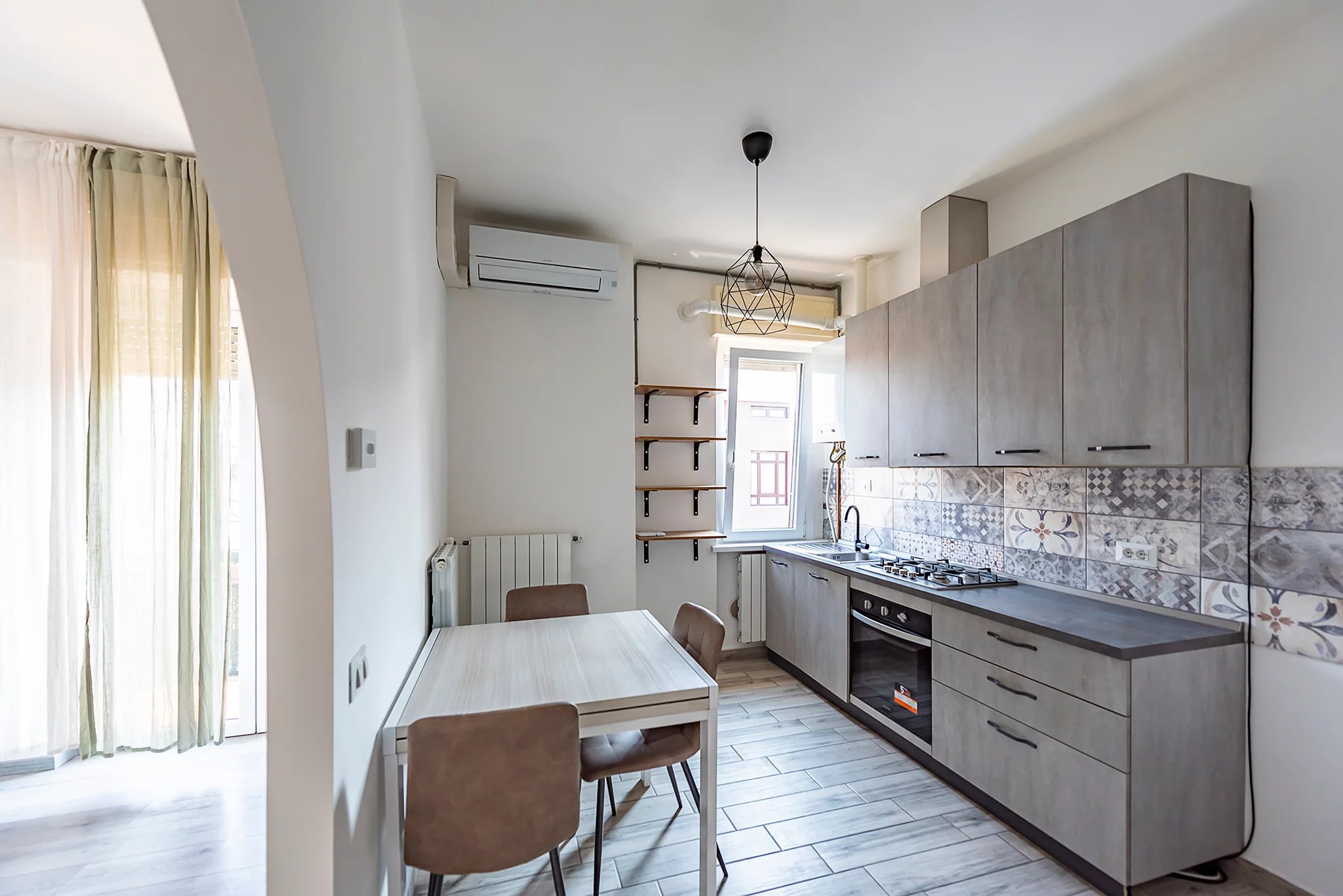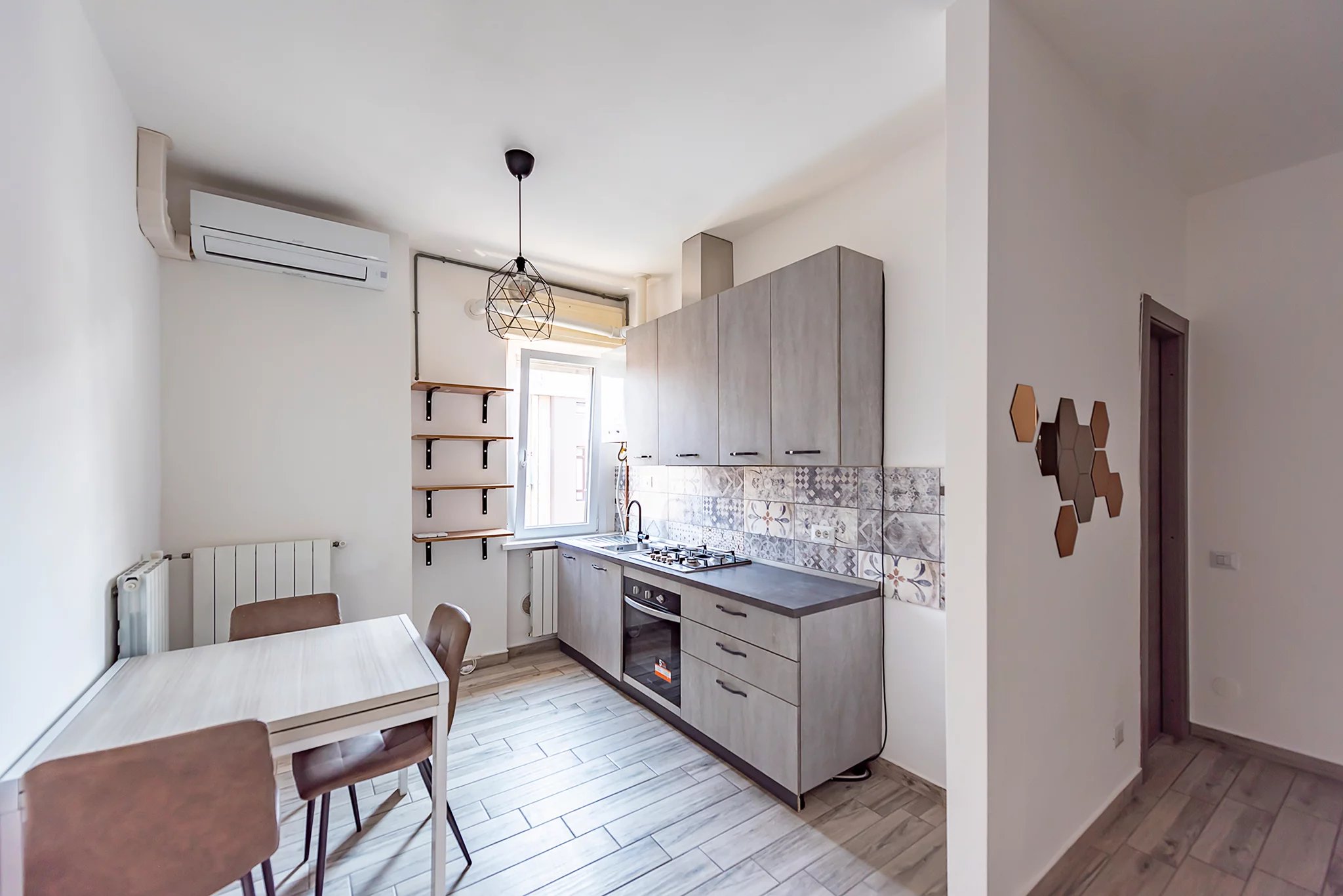 ampio ingresso, cucina abitabile a vista, luminoso soggiorno con accesso al balcone, camera matrimoniale di generose dimensioni e servizio finestrato con doccia.
