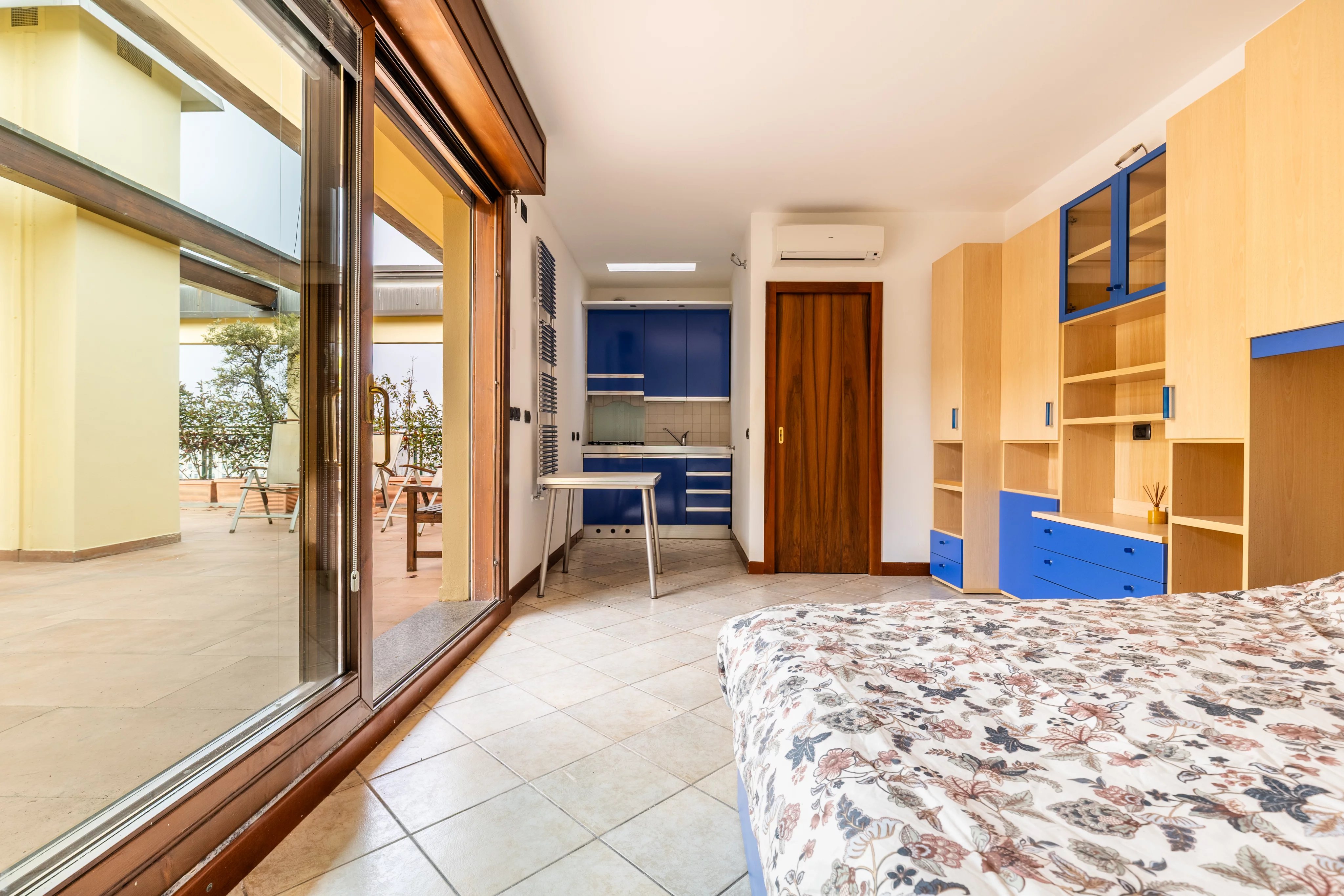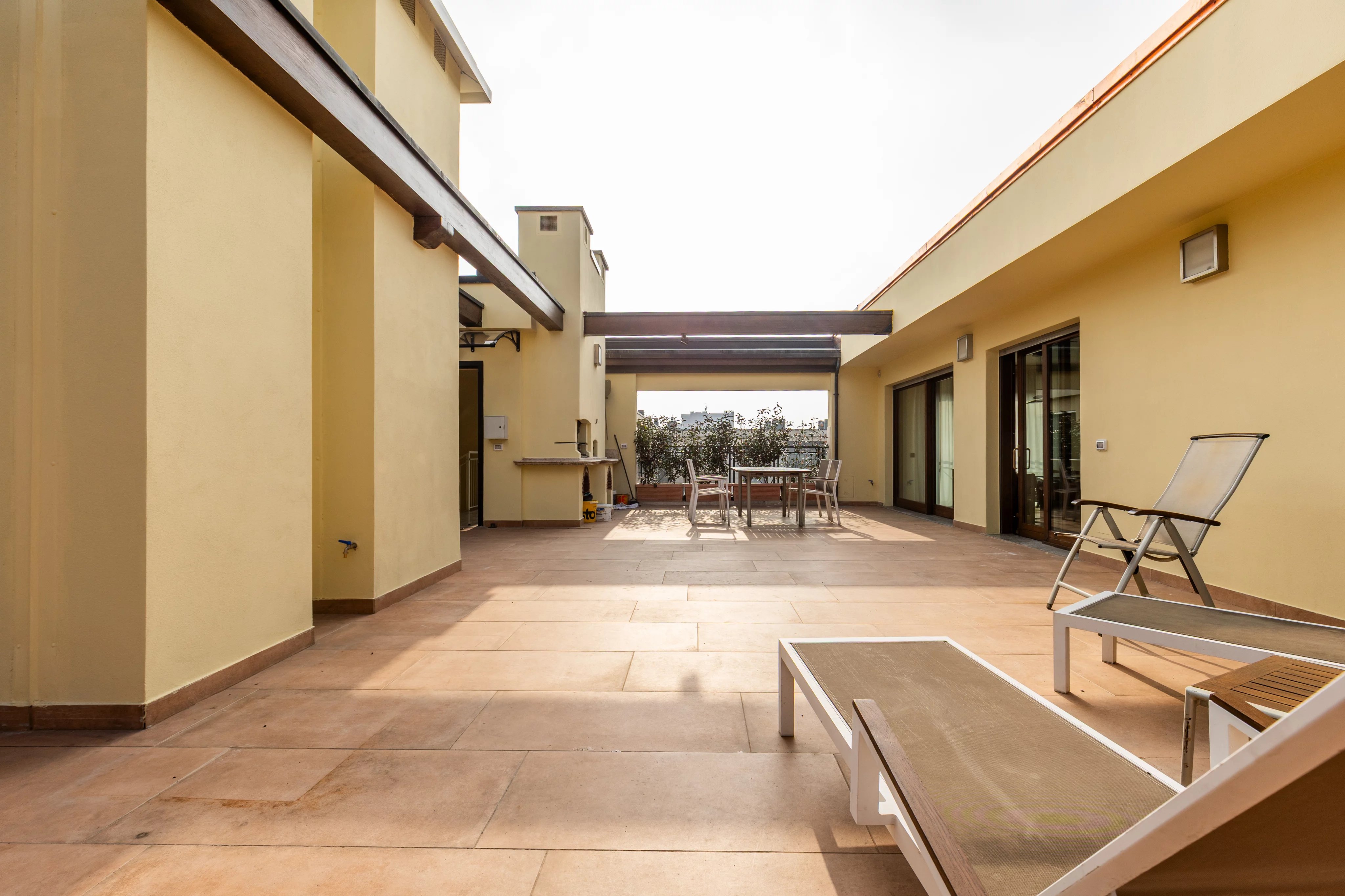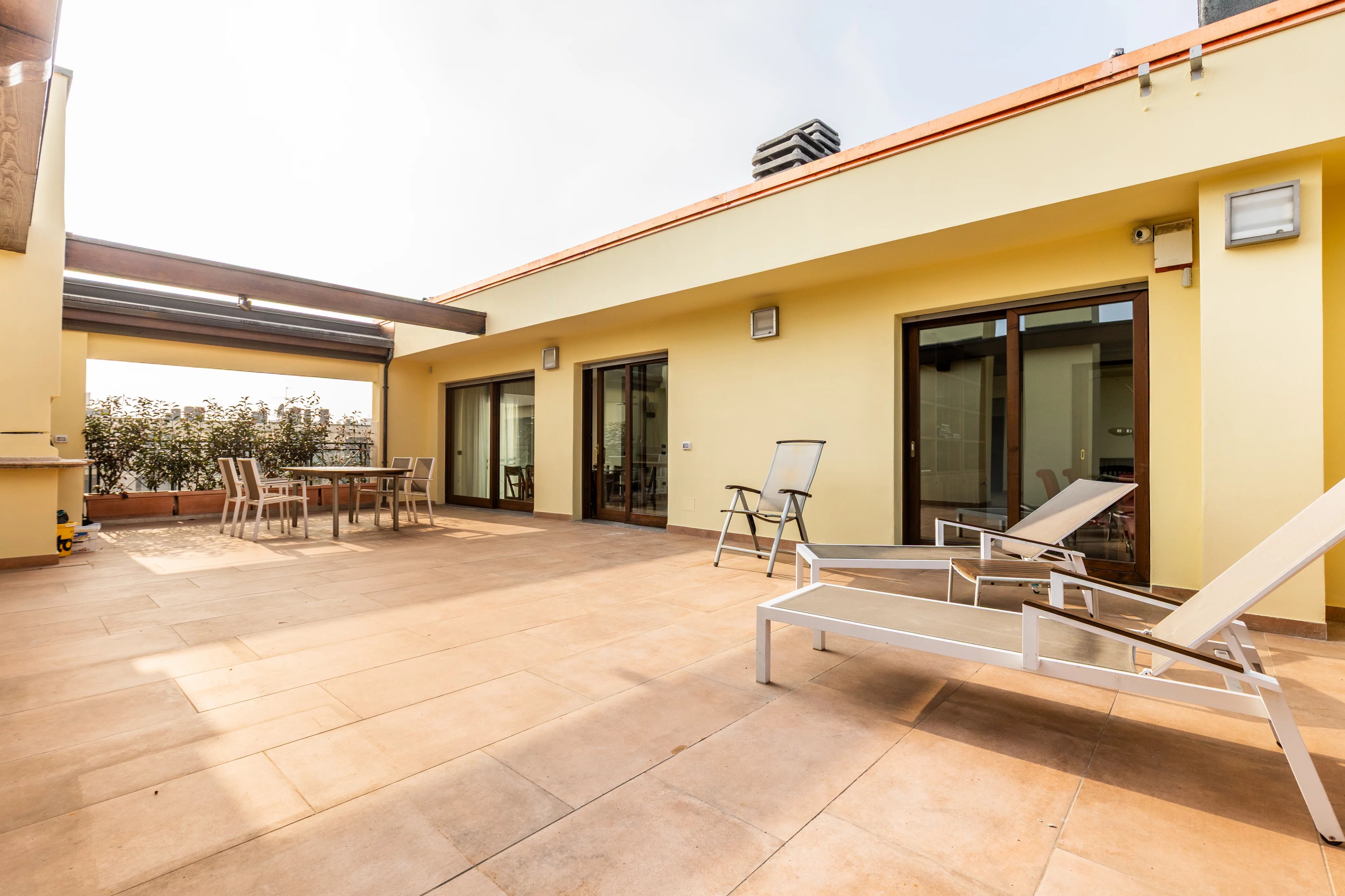 Dal terrazzo si accede inoltre a una dependance completamente indipendente, dotata di bagno e angolo cottura, perfetta come suite per ospiti, studio privato o alloggio per personale di servizio. La dependance dispone anche di ingresso autonomo dal vano scale, garantendo totale indipendenza rispetto all’appartamento principale.