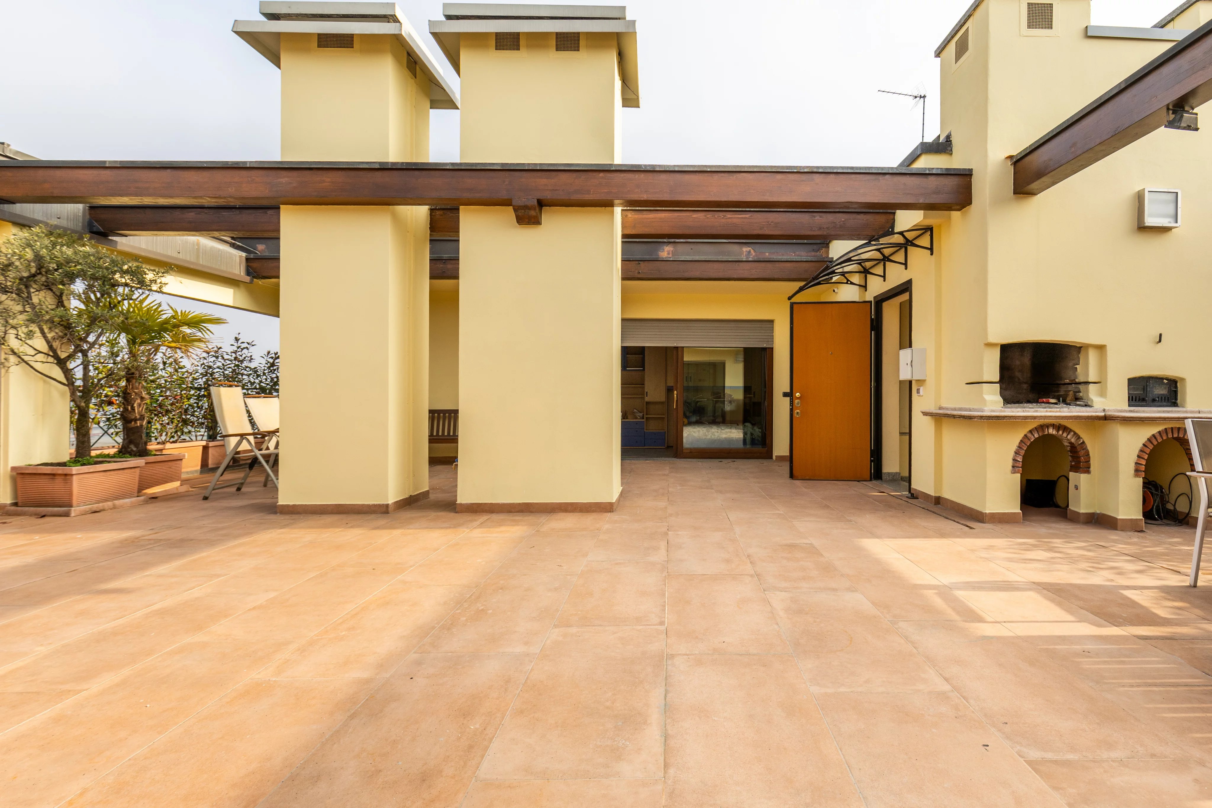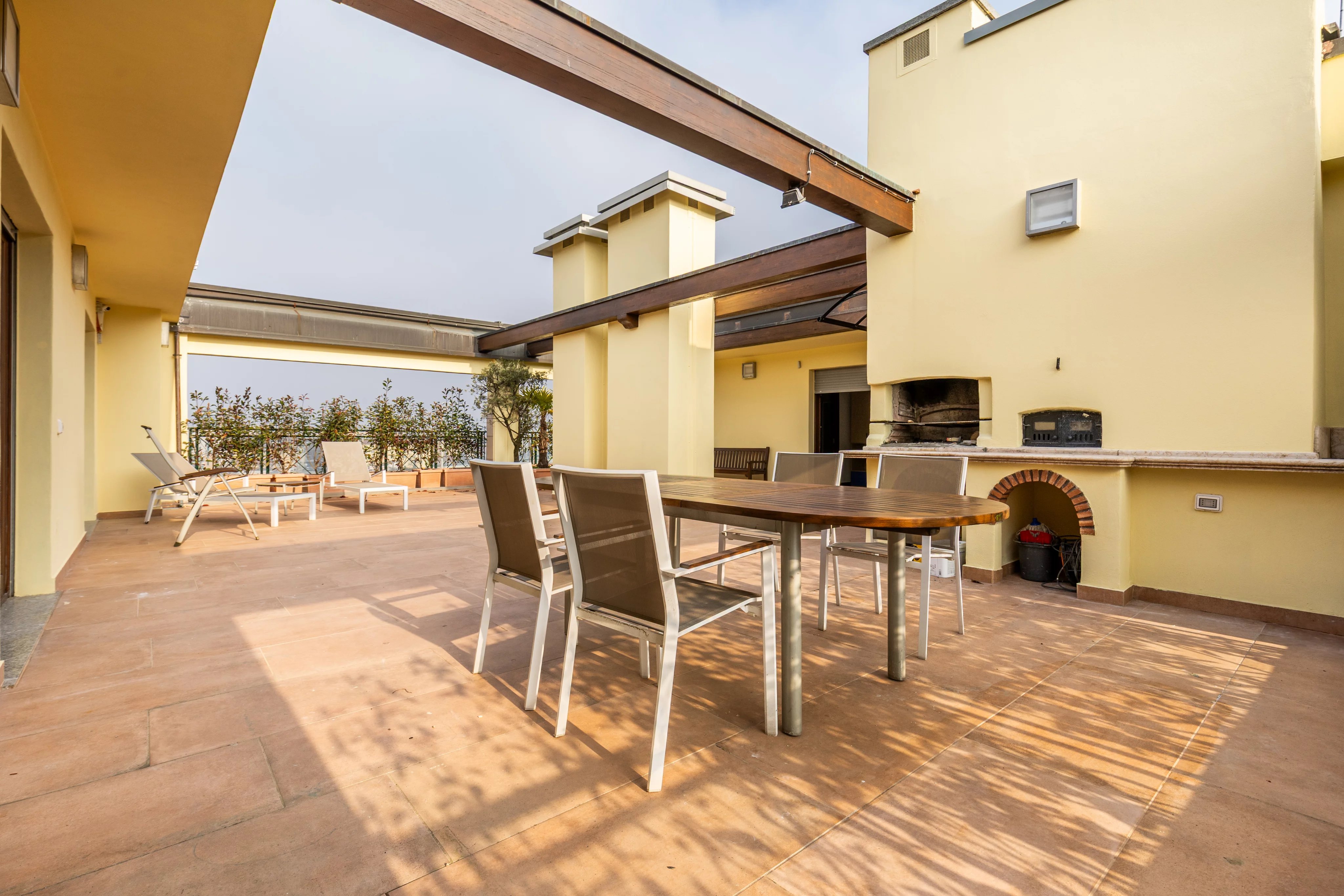 Il vero protagonista della proprietà è l’ampio terrazzo panoramico, un’autentica estensione della casa pensata per vivere l’outdoor in totale privacy. Lo spazio è perfettamente attrezzato con zona pranzo, area relax con sdraio, barbecue e forno per la pizza, ideale per momenti conviviali, cene all’aperto o semplicemente per godere del sole e della tranquillità.