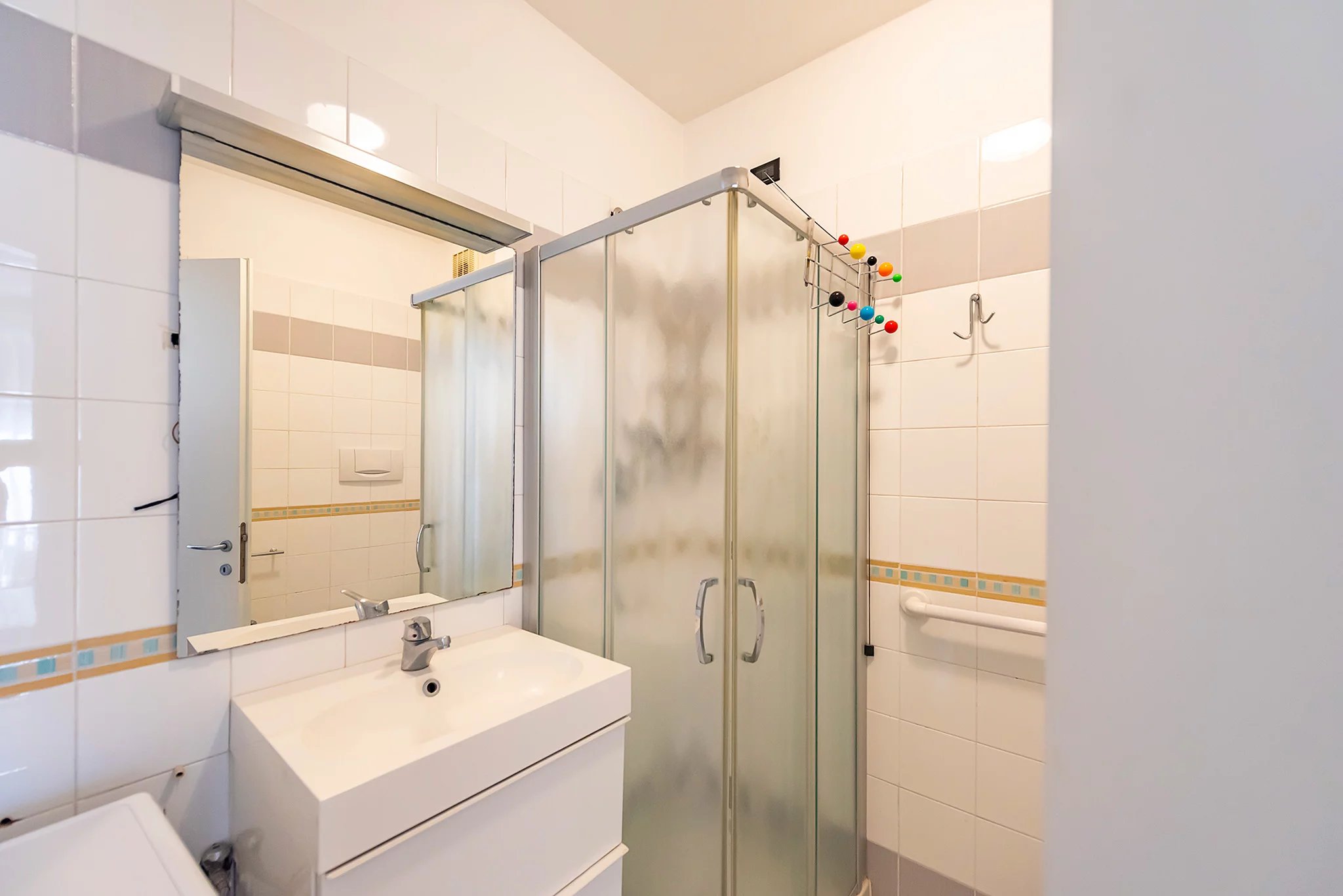 La zona notte ospita una camera matrimoniale con bagno privato dotato di doccia, altre due camere da letto e un secondo bagno con vasca.