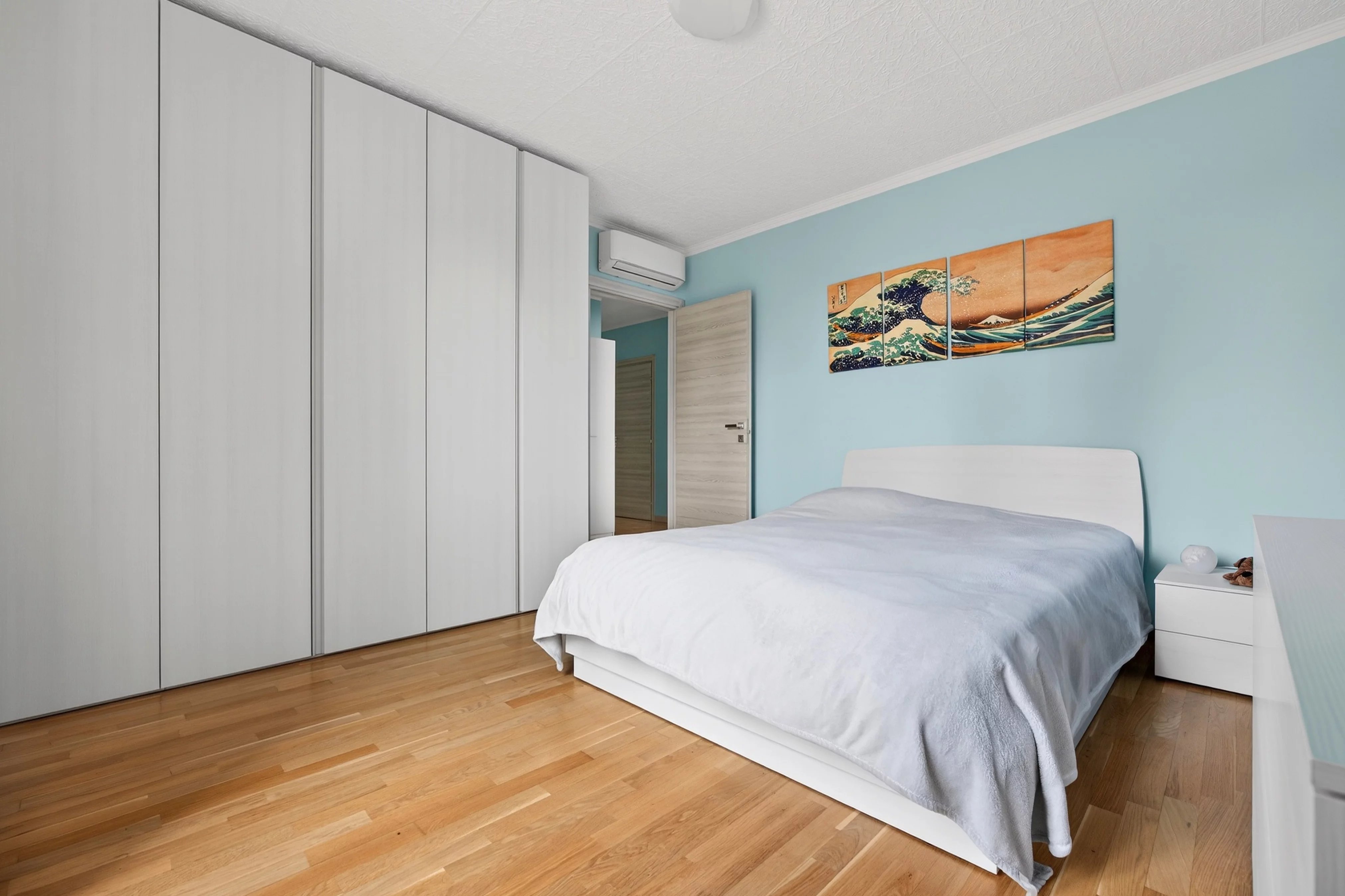 La zona notte è ben separata e offre un disimpegno funzionale, un comodo ripostiglio attrezzato come lavanderia con attacchi dedicati, due camere da letto di ottima metratura e un bagno finestrato recentemente ristrutturato, rifinito con materiali moderni e di qualità. L’appartamento si distingue per le sue finiture curate: ceramica nella zona giorno, parquet nelle camere, gres porcellanato nel bagno, infissi in doppio vetro e una dotazione tecnologica completa che comprende impianto d’allarme perimetrale e volumetrico, aria condizionata in soggiorno e camere, videocitofono, tende da sole motorizzate con anemometro e sistema wireless, zanzariere e porta blindata.