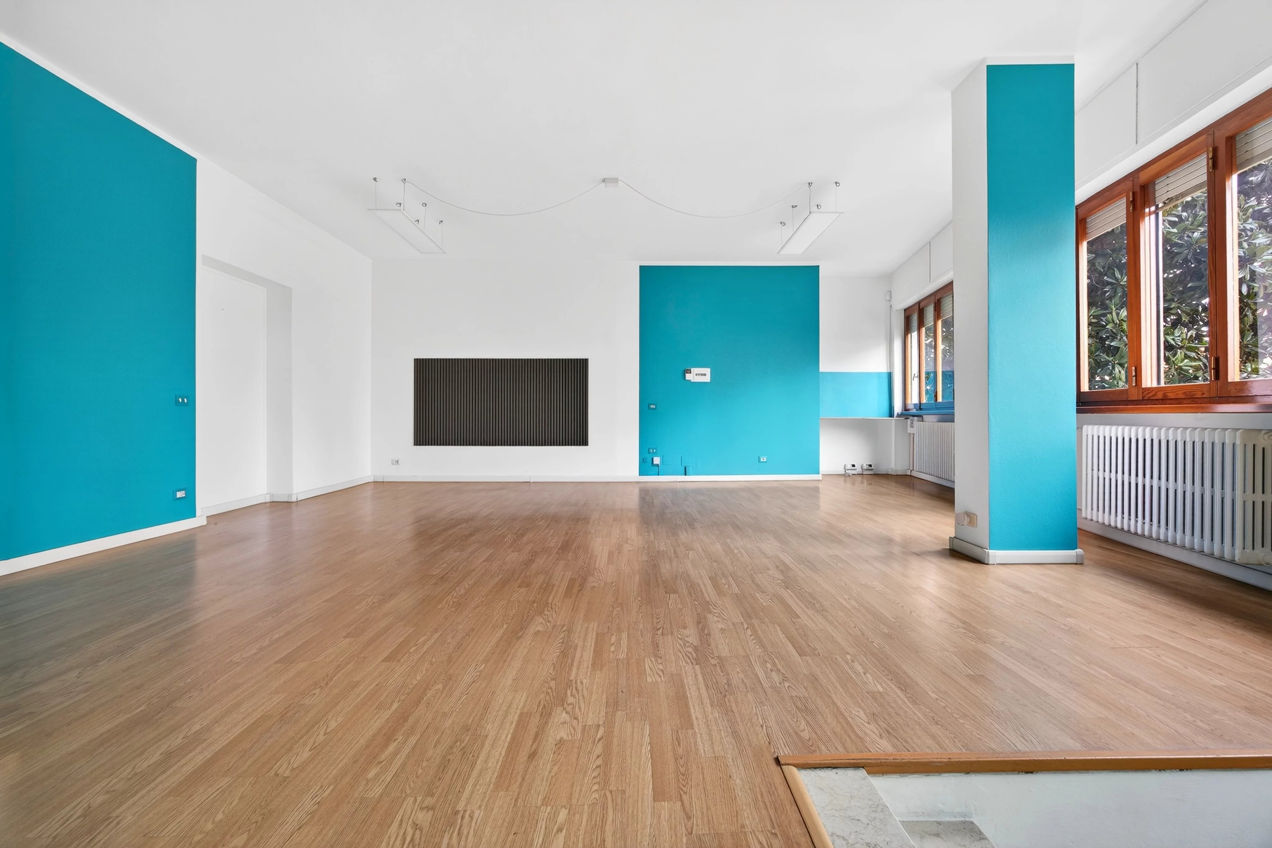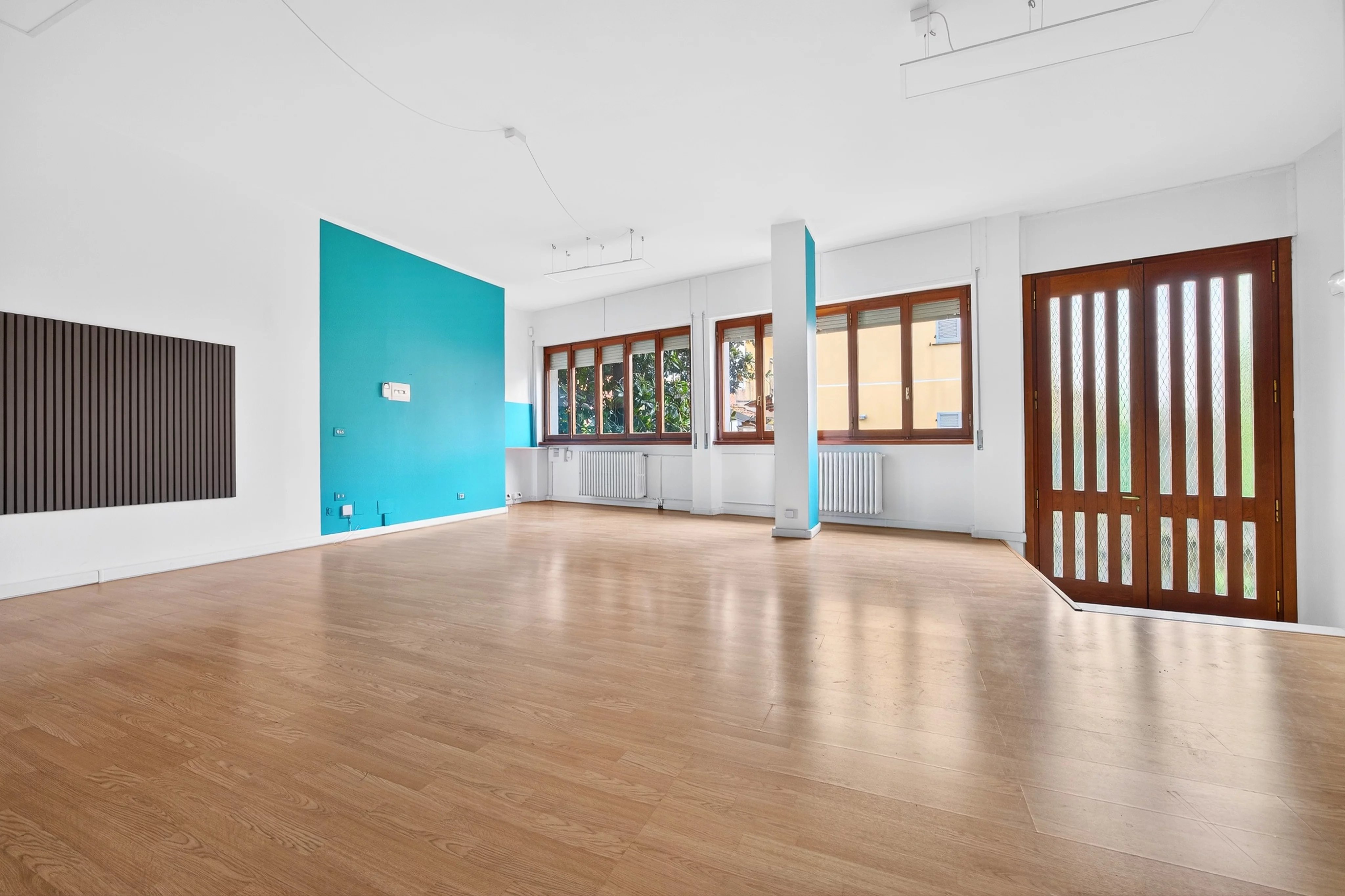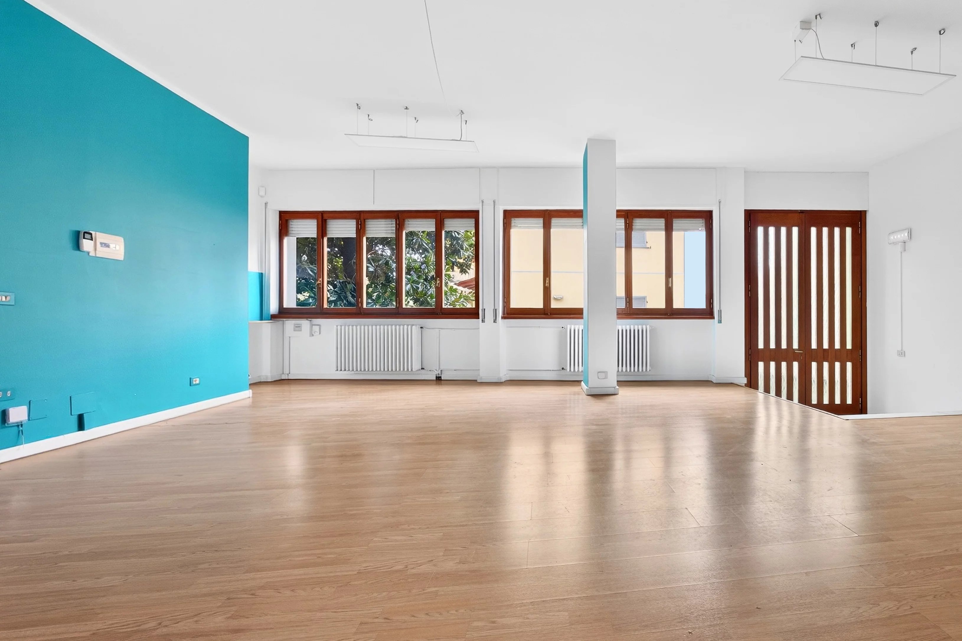 Le numerose finestre assicurano una luminosità naturale eccellente, creando un ambiente di lavoro piacevole e produttivo.