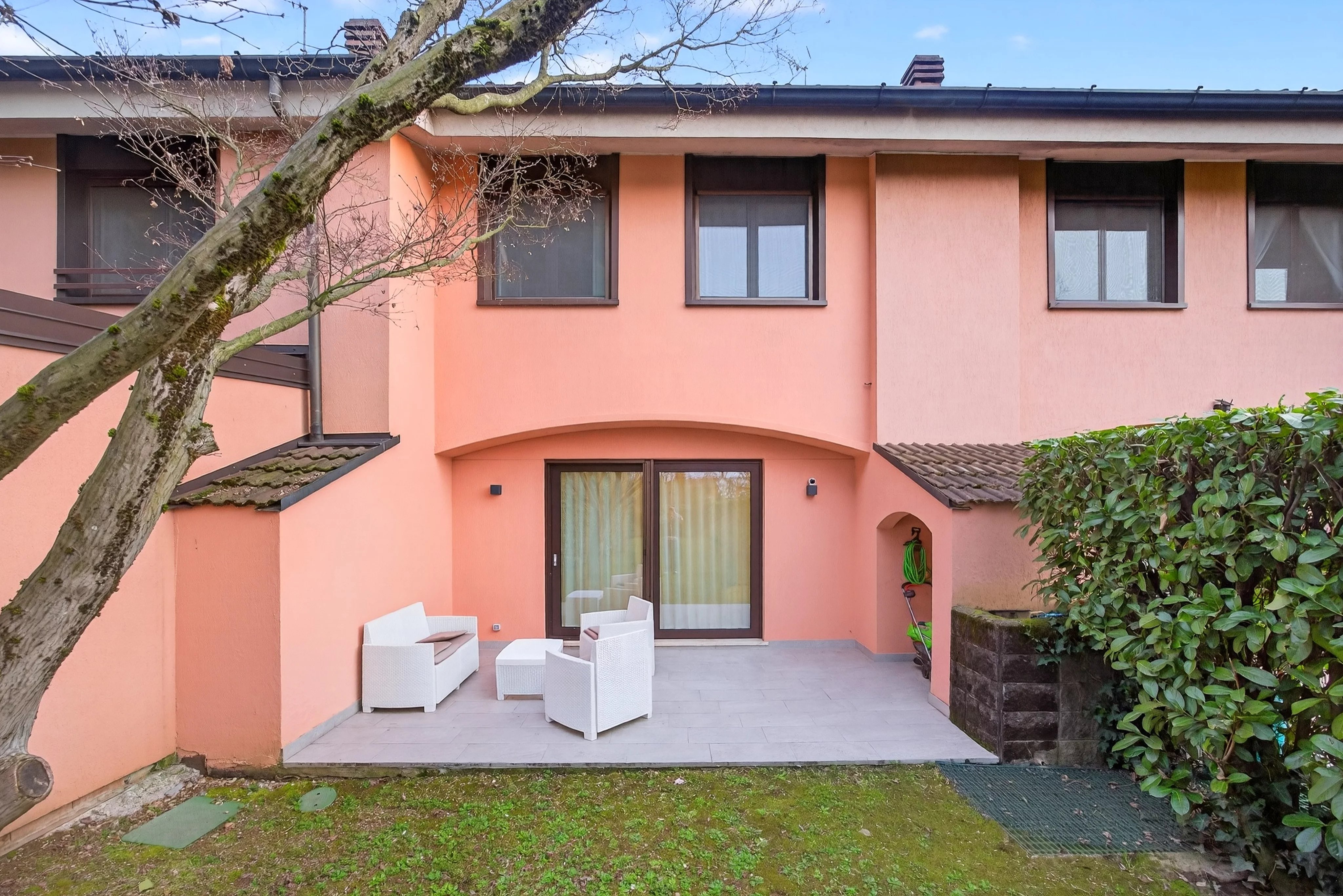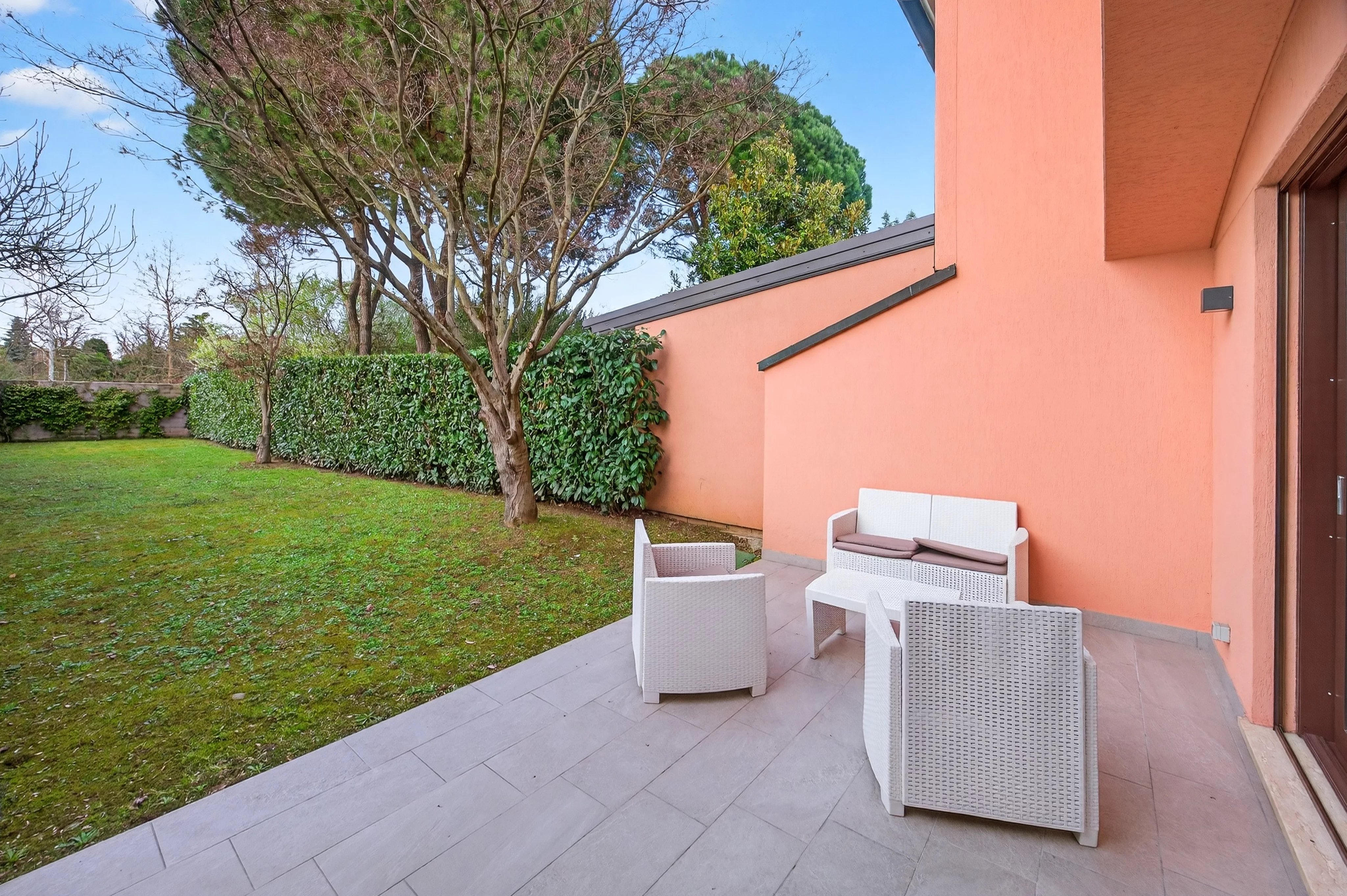 ingresso da vialetto privato, ampio soggiorno con accesso diretto al patio esterno e al giardino privato, cucina abitabile.