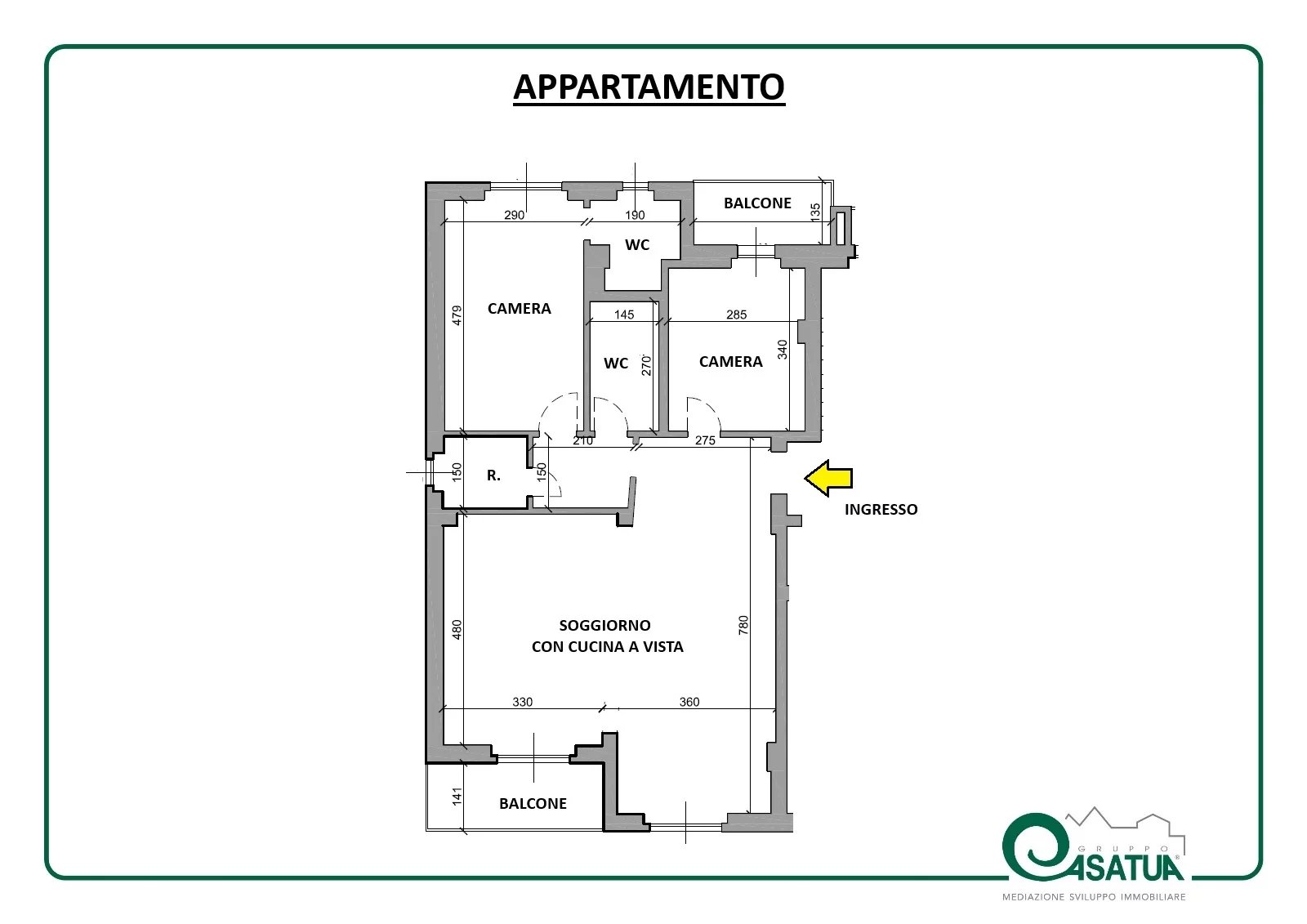 L’ingresso conduce a un ampio soggiorno con cucina a vista, luminoso e funzionale, con accesso diretto al primo balcone. La zona notte comprende una cameretta con secondo balcone, una camera matrimoniale con bagno privato finestrato, oltre a un pratico ripostiglio/lavanderia e un secondo bagno.