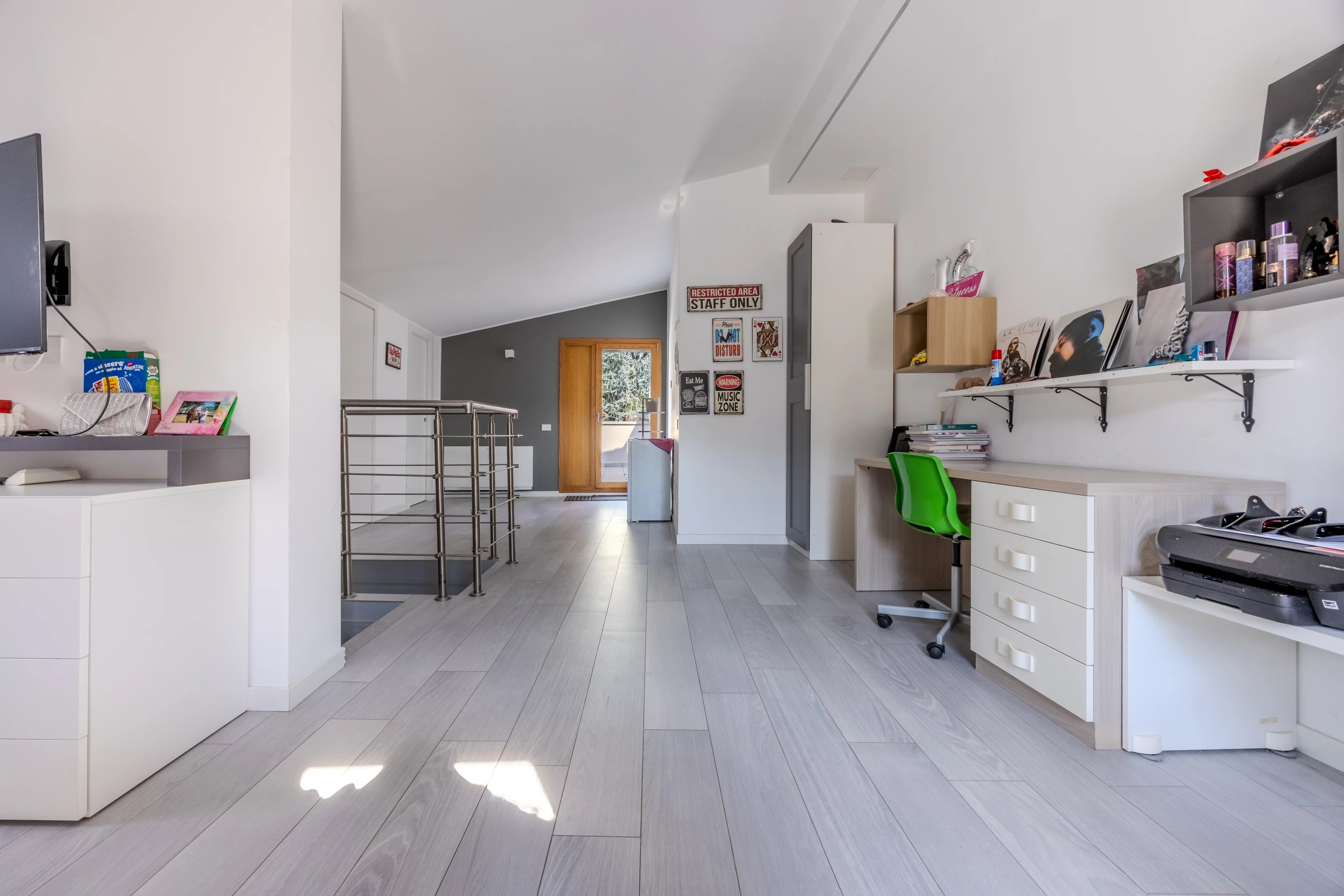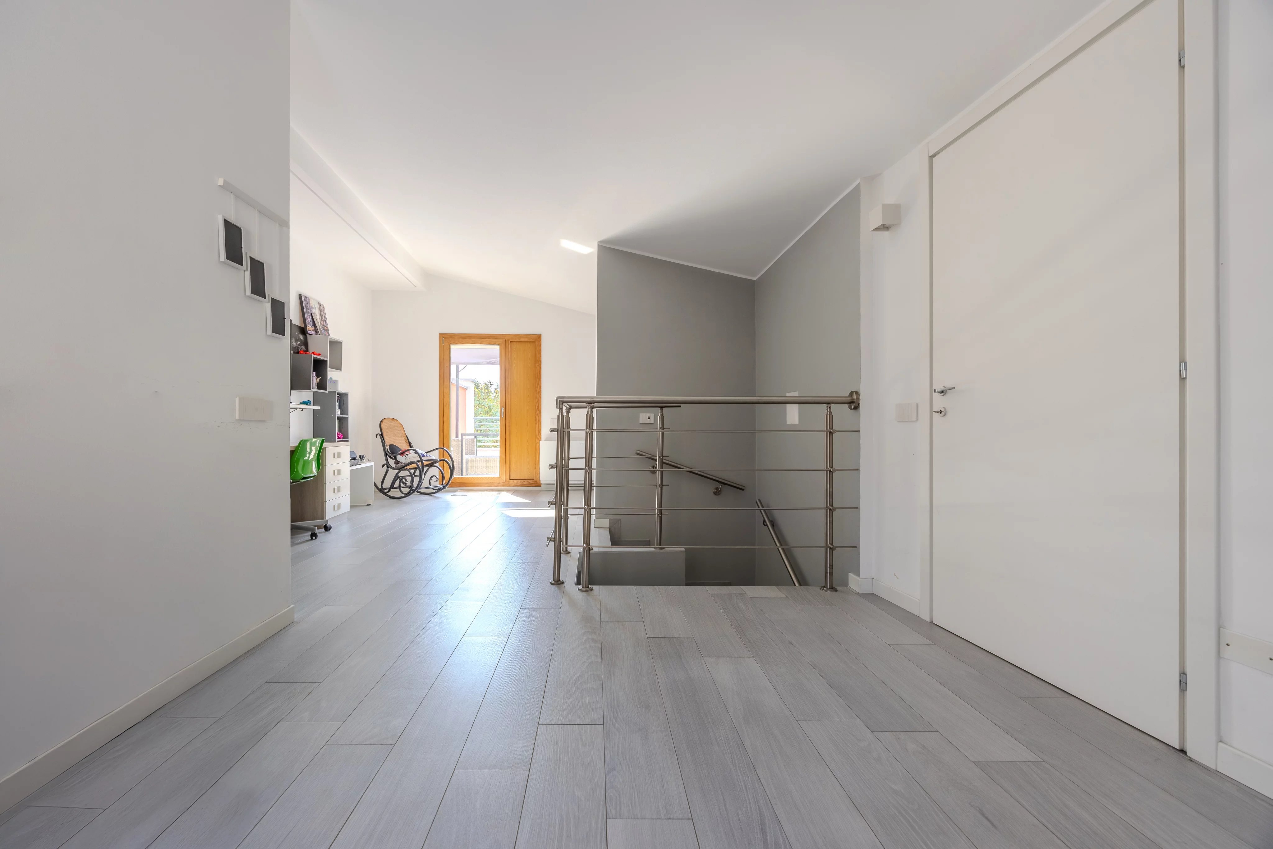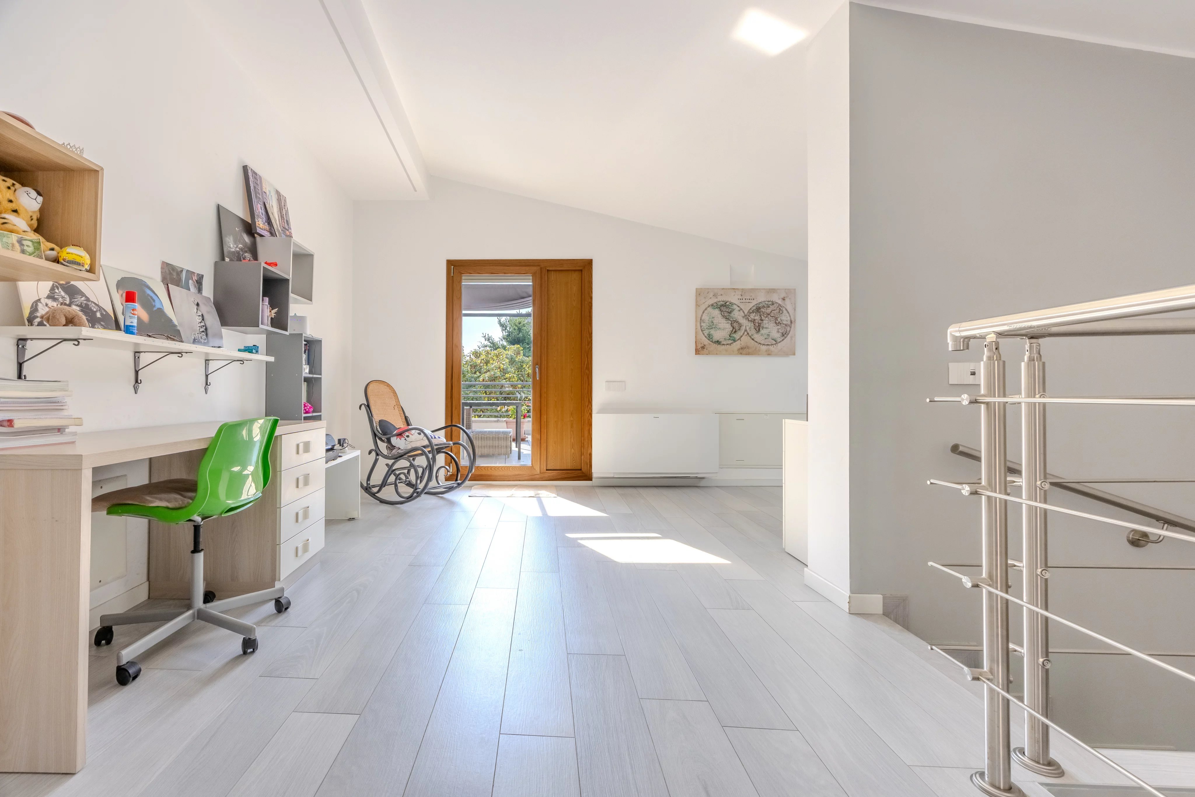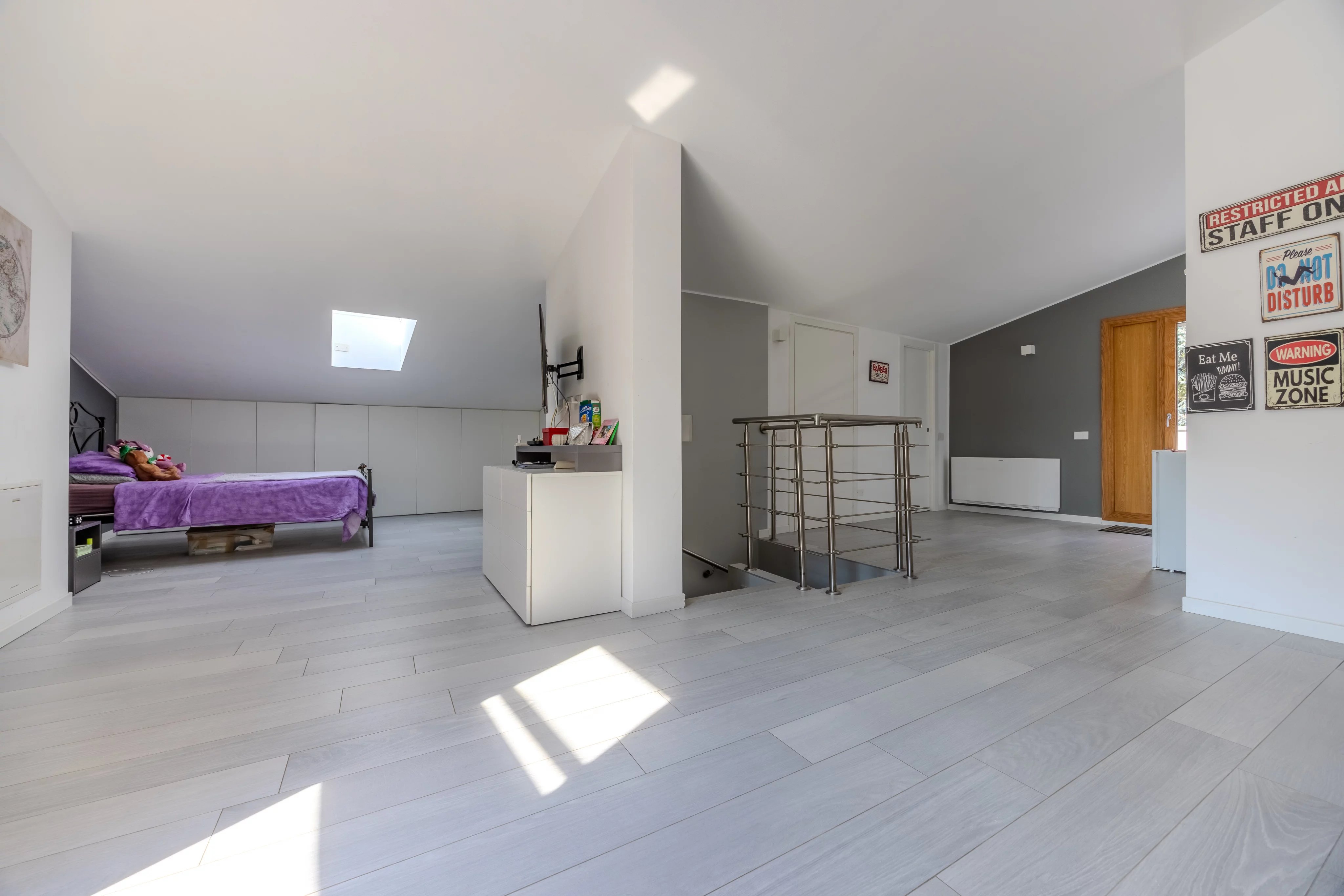 Una comoda scala in muratura conduce al piano mansardato, dove troviamo un secondo bagno, un locale lavanderia e un’ampia zona open space con accesso a due splendidi terrazzi di generose dimensioni, ideale per realizzare una terza camera, uno studio o una zona relax.