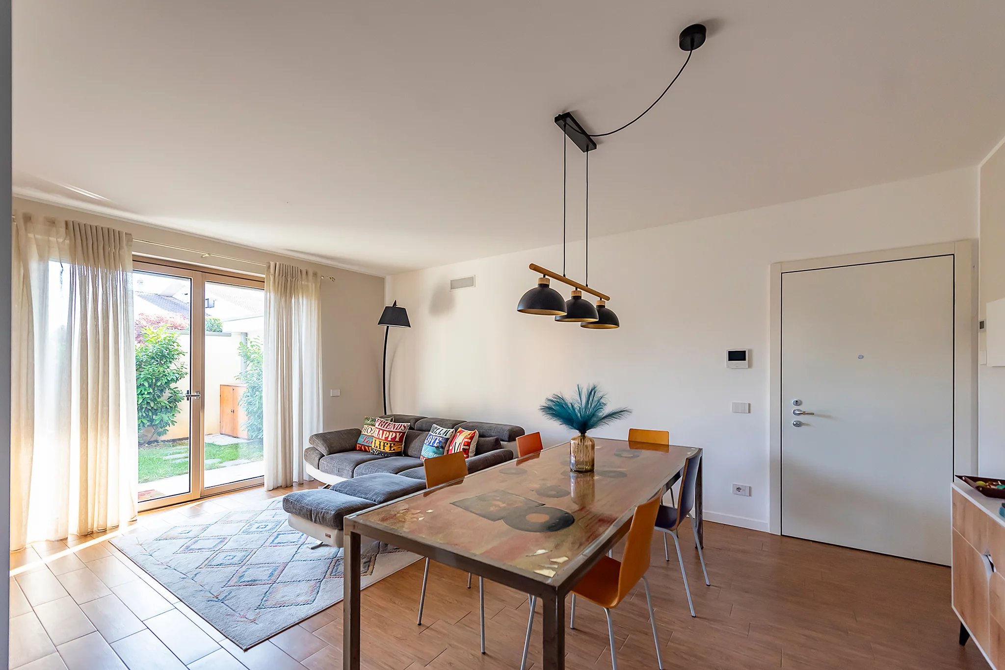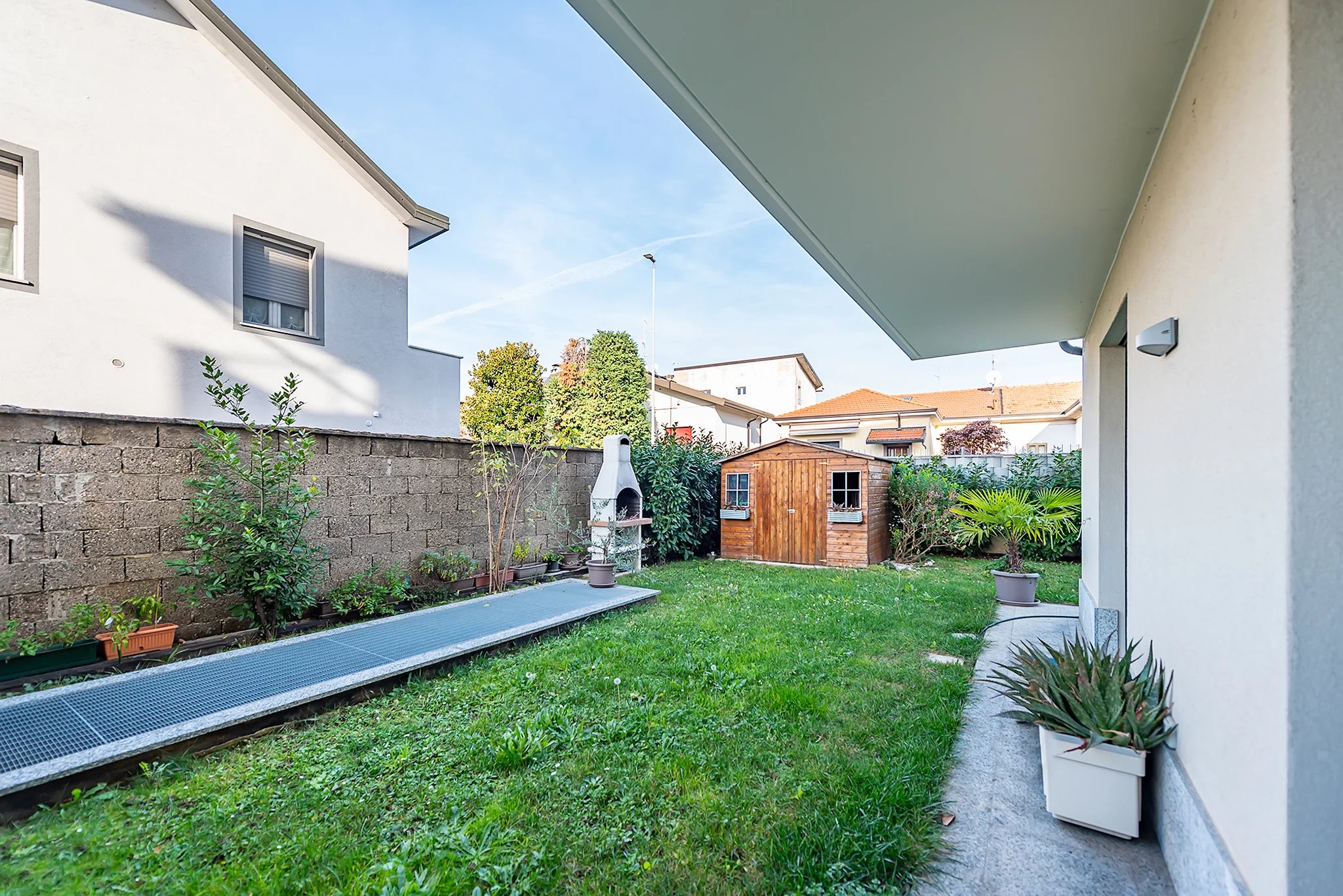 L’appartamento si compone di un’ampia zona living luminosa con cucina a vista con accesso diretto al giardino perimetrale di circa 210 mq, dotato di ingresso separato, un patio coperto e una casetta per il ricovero degli attrezzi, una camera matrimoniale e una cameretta, entrambe con affaccio diretto sul giardino e doppi servizi con finiture di qualità.
