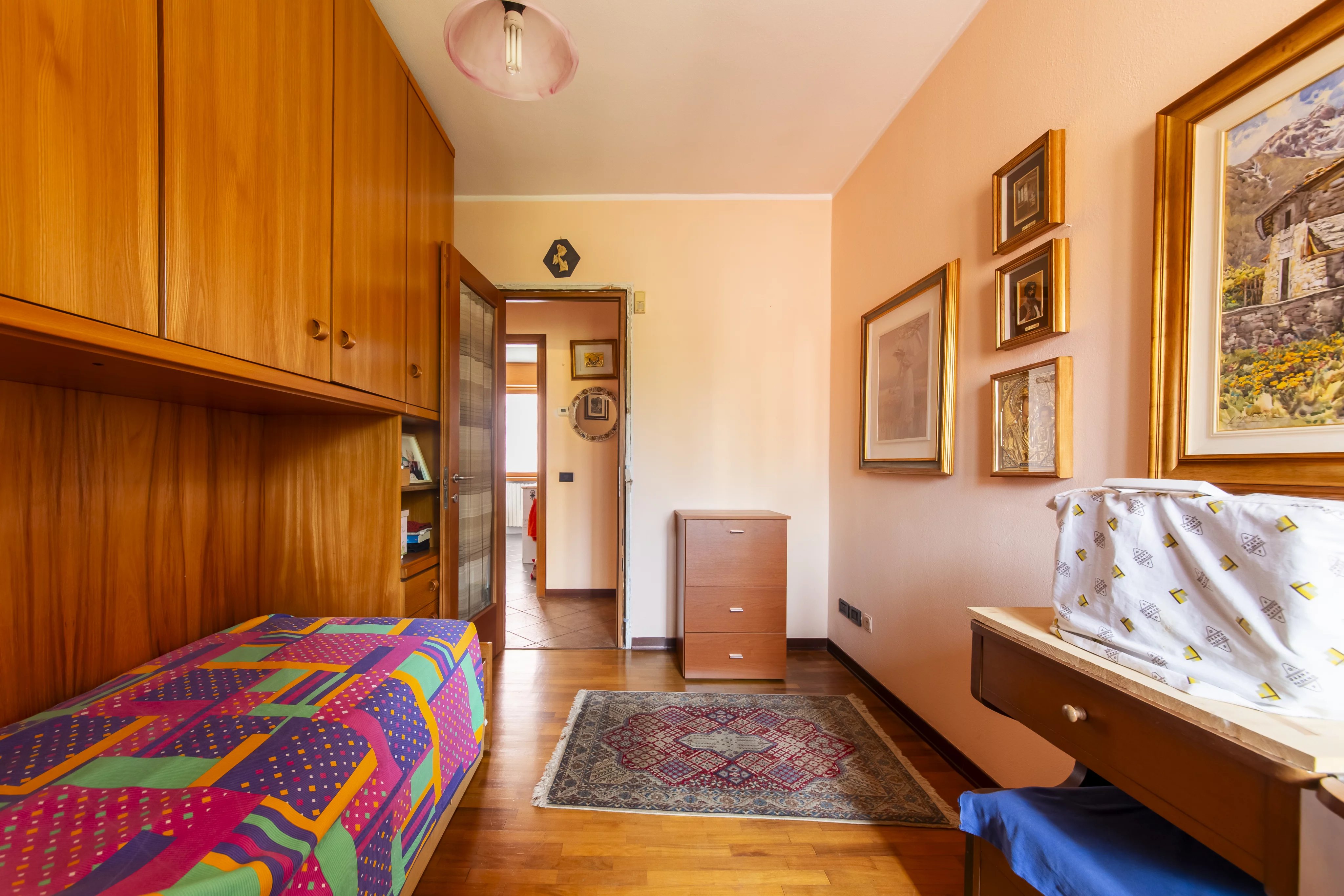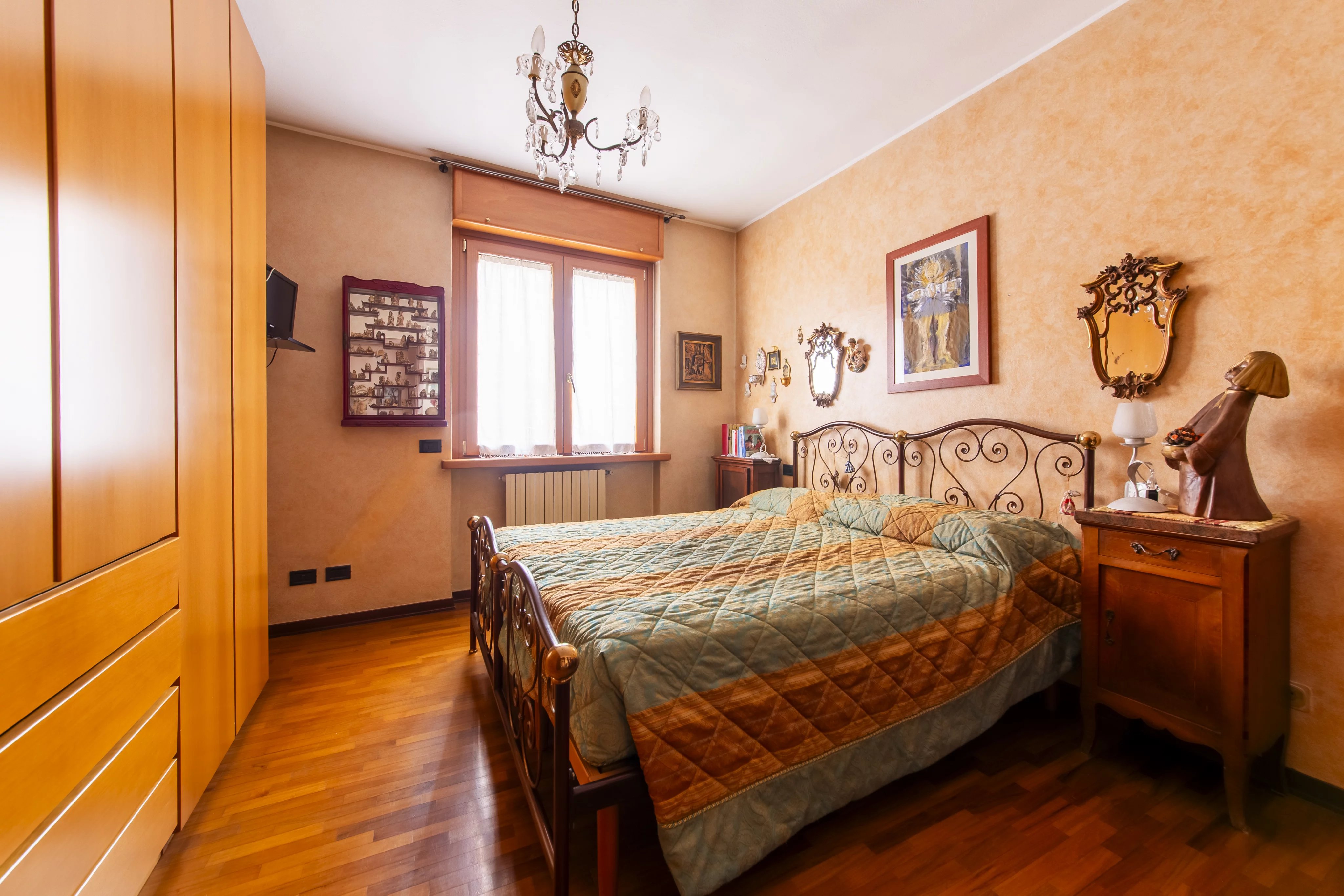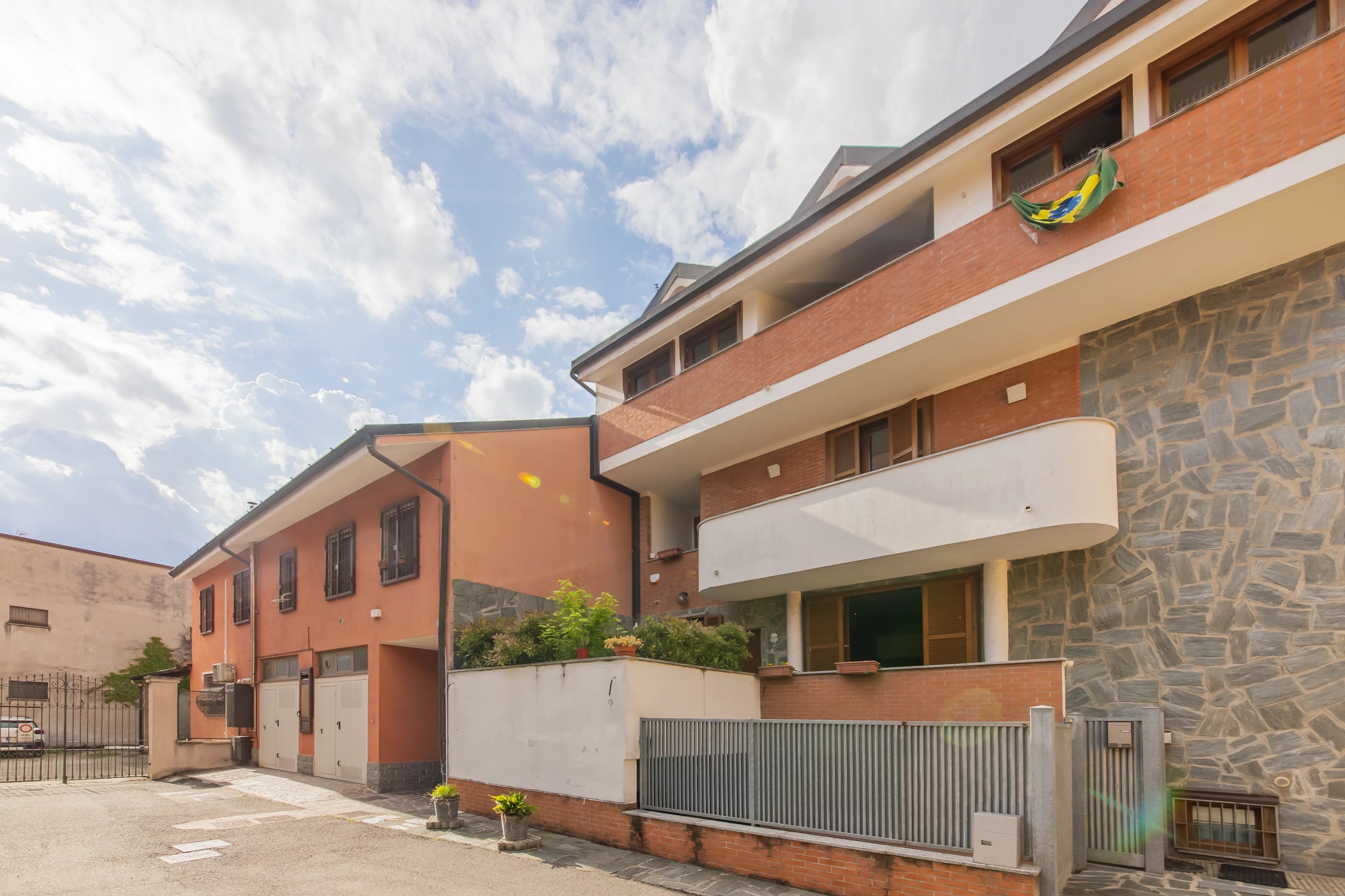 L’ingresso avviene tramite una comoda scala che conduce al piano primo, dove un delizioso balconcino verandato affacciato sui giardini interni anticipa l’atmosfera accogliente della casa. Varcata la soglia, si apre un soggiorno di dimensioni davvero generose, arricchito da una cucina a vista e da una luminosità naturale che valorizza ogni dettaglio. La zona notte, ben distribuita, comprende un bagno comodo e funzionale, una cameretta e una spaziosa camera matrimoniale, entrambe rifinite con parquet che dona calore e raffinatezza.
