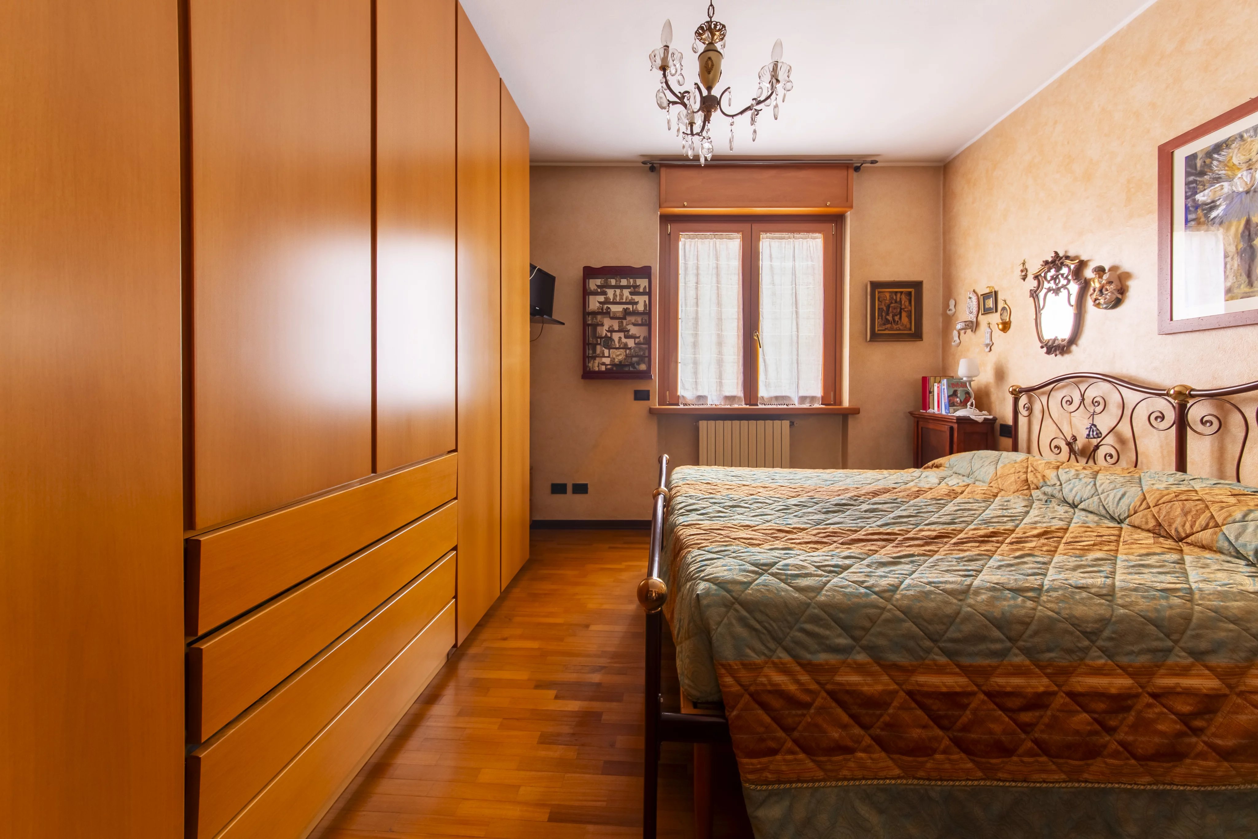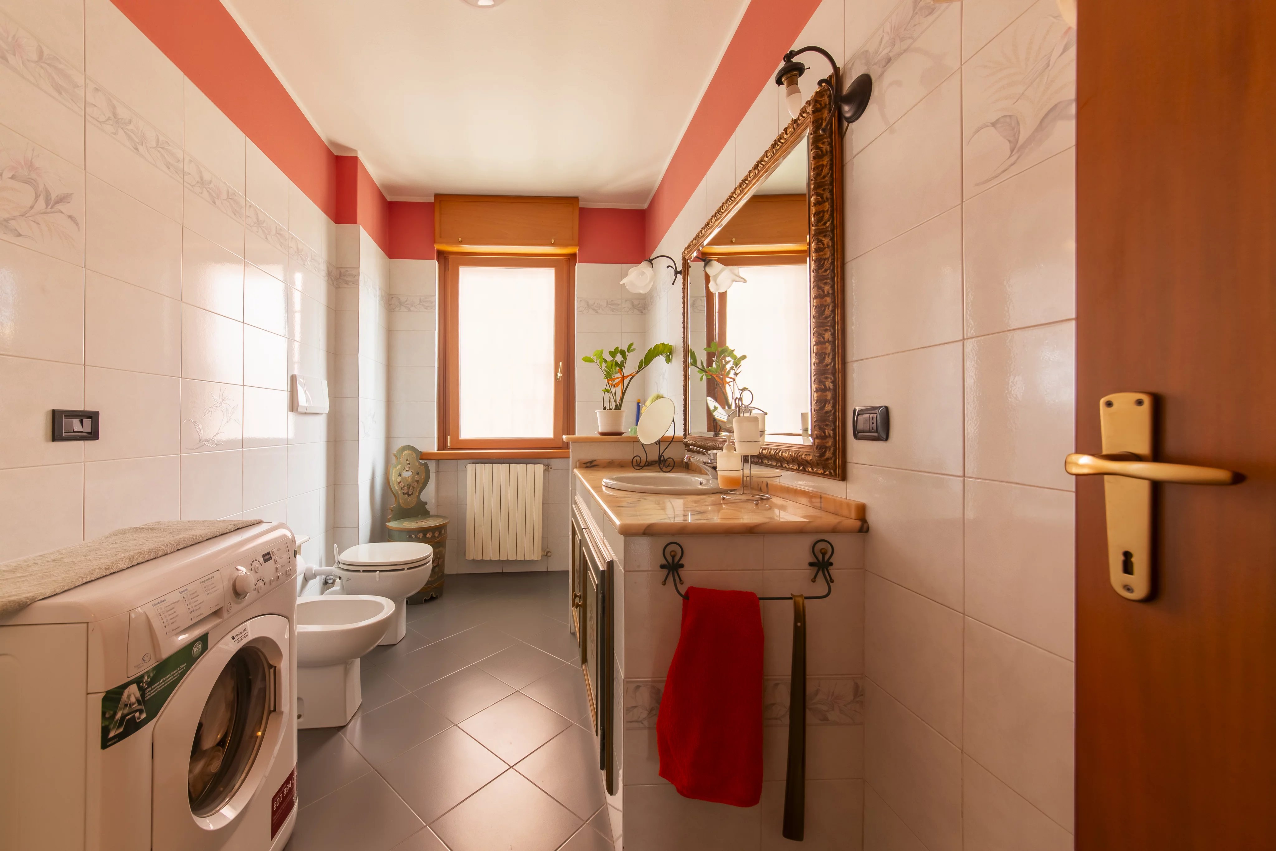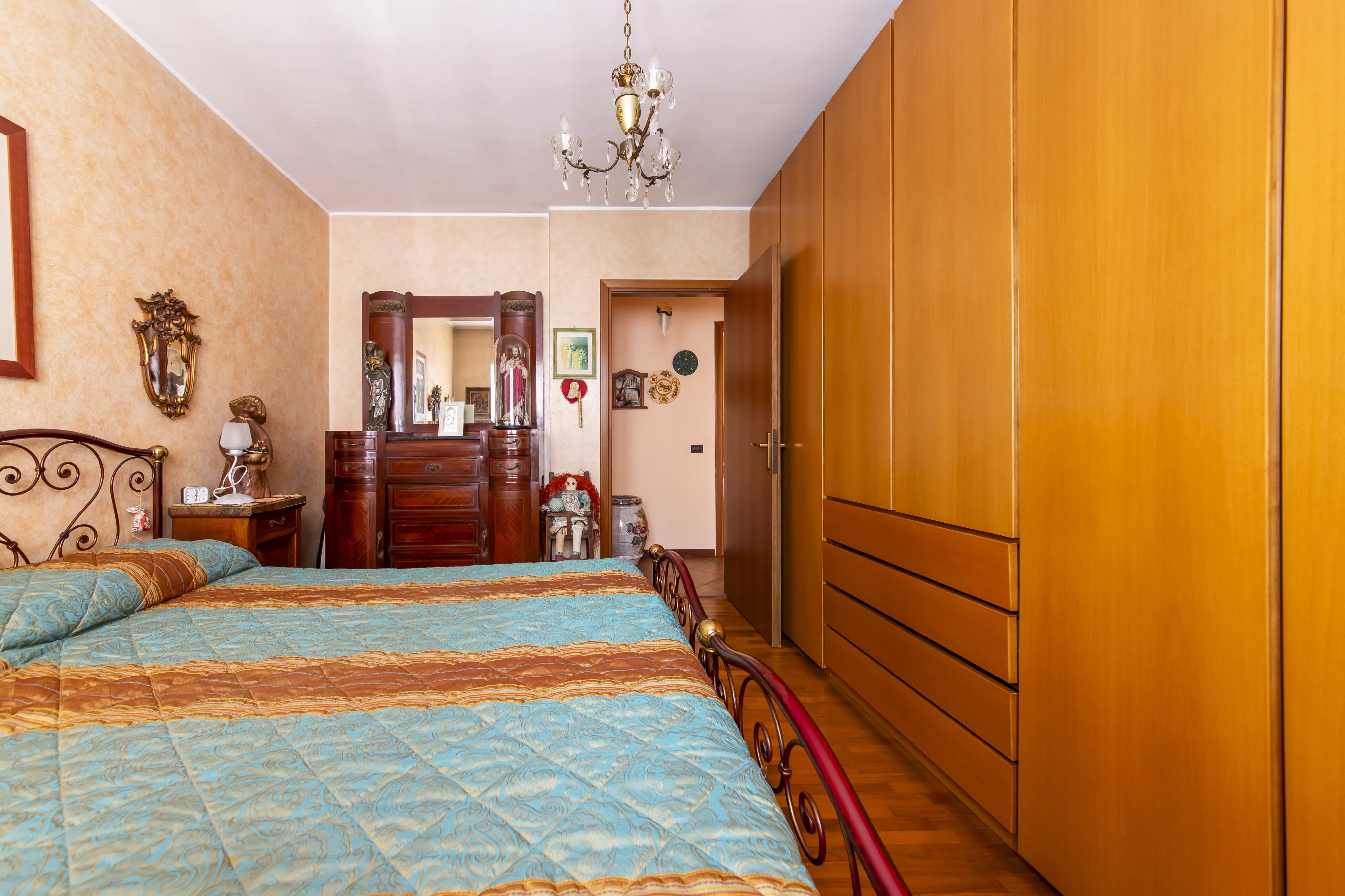 L’ingresso avviene tramite una comoda scala che conduce al piano primo, dove un delizioso balconcino verandato affacciato sui giardini interni anticipa l’atmosfera accogliente della casa. Varcata la soglia, si apre un soggiorno di dimensioni davvero generose, arricchito da una cucina a vista e da una luminosità naturale che valorizza ogni dettaglio. La zona notte, ben distribuita, comprende un bagno comodo e funzionale, una cameretta e una spaziosa camera matrimoniale, entrambe rifinite con parquet che dona calore e raffinatezza.