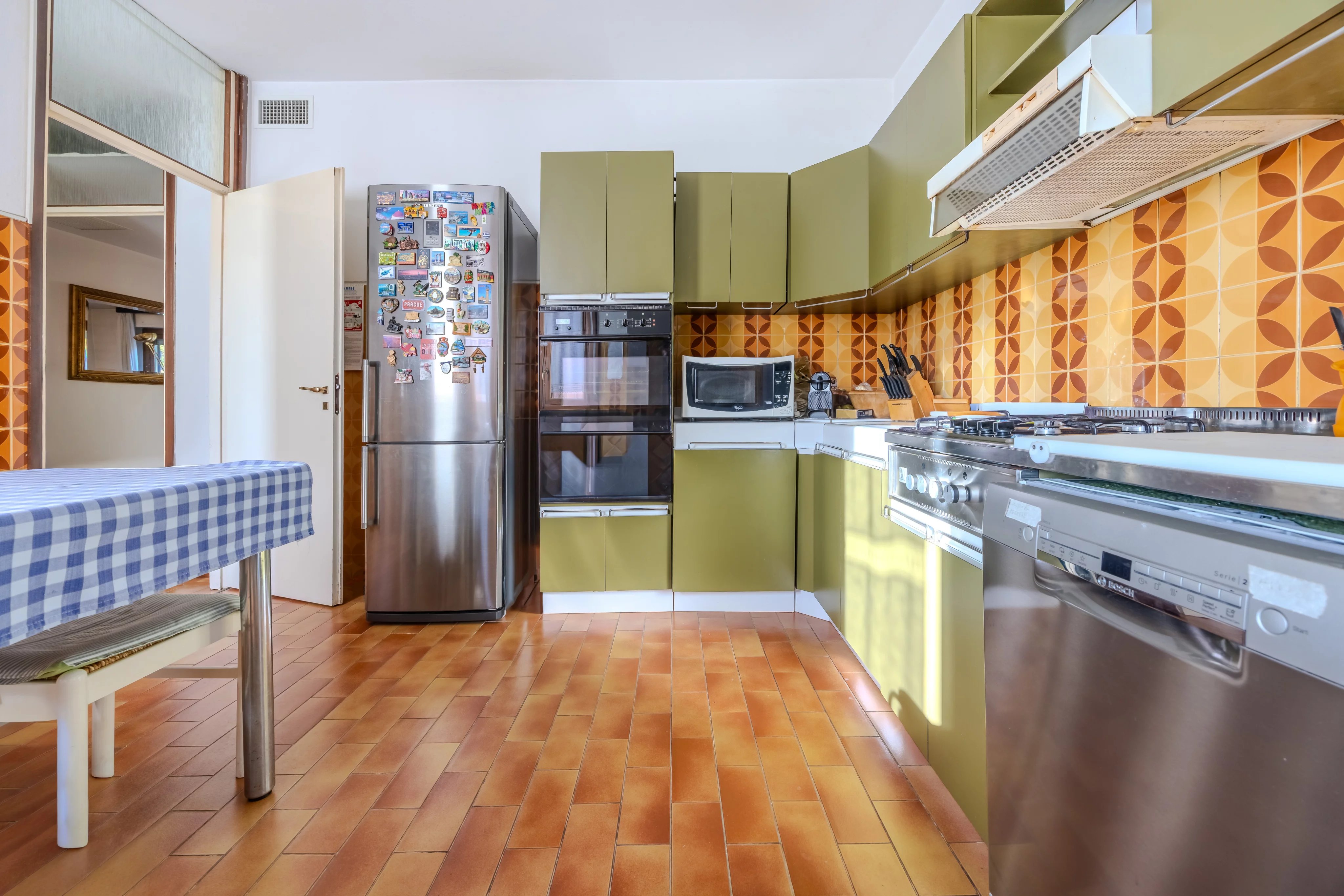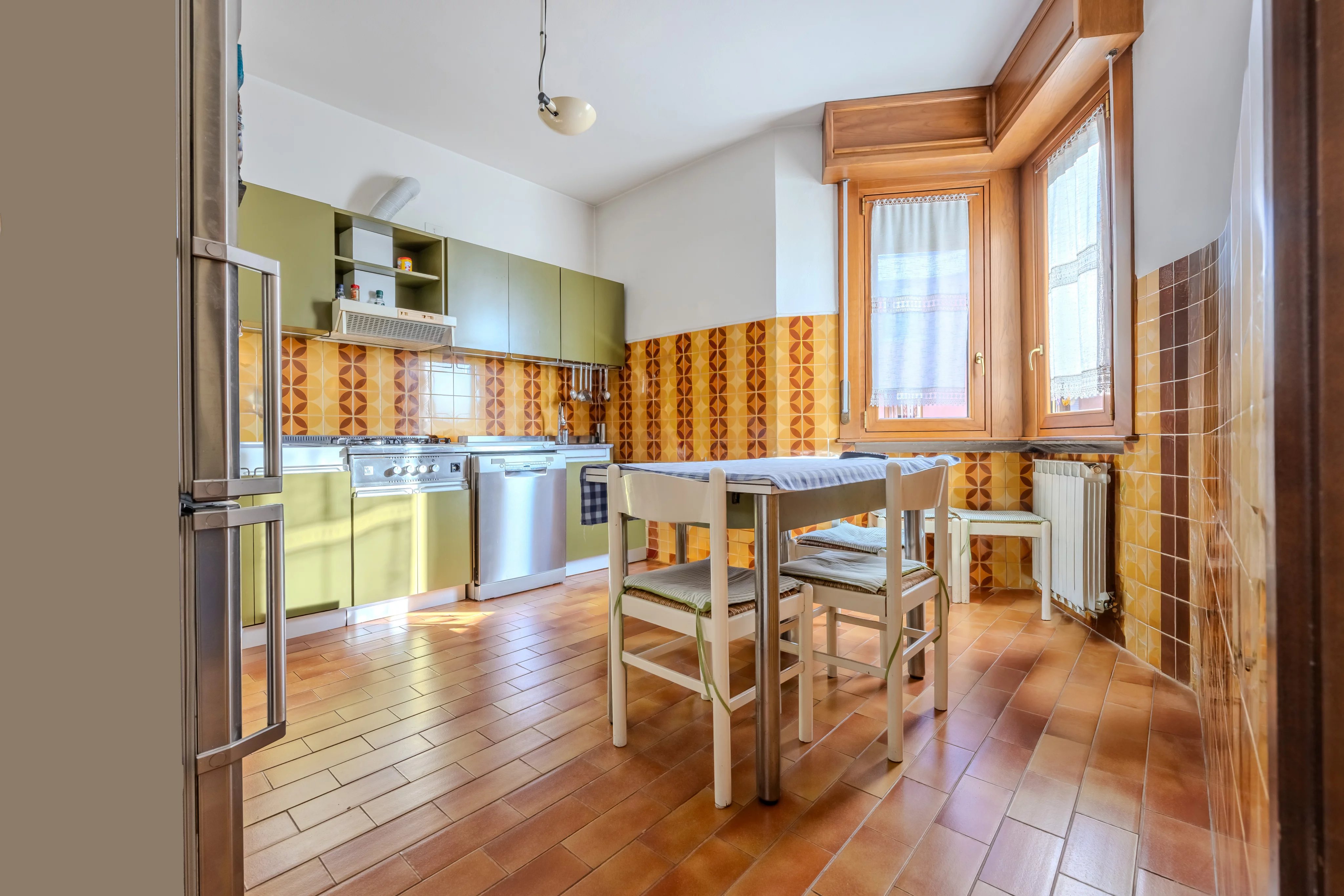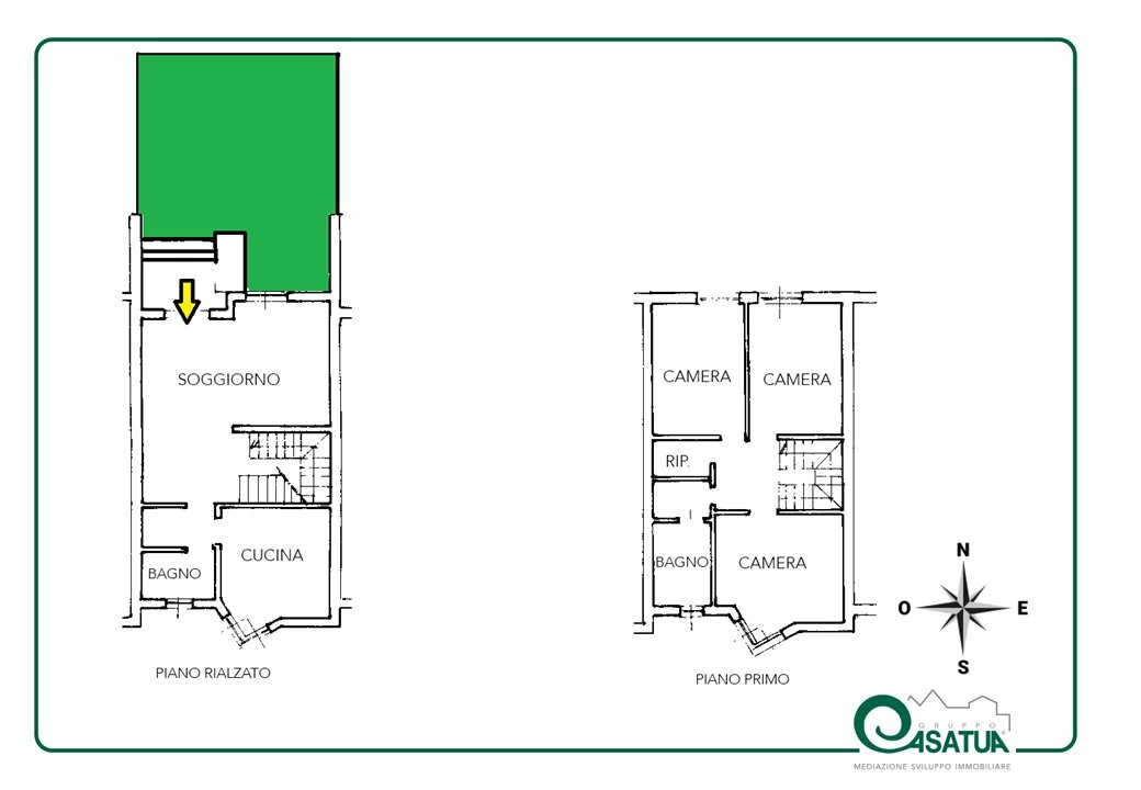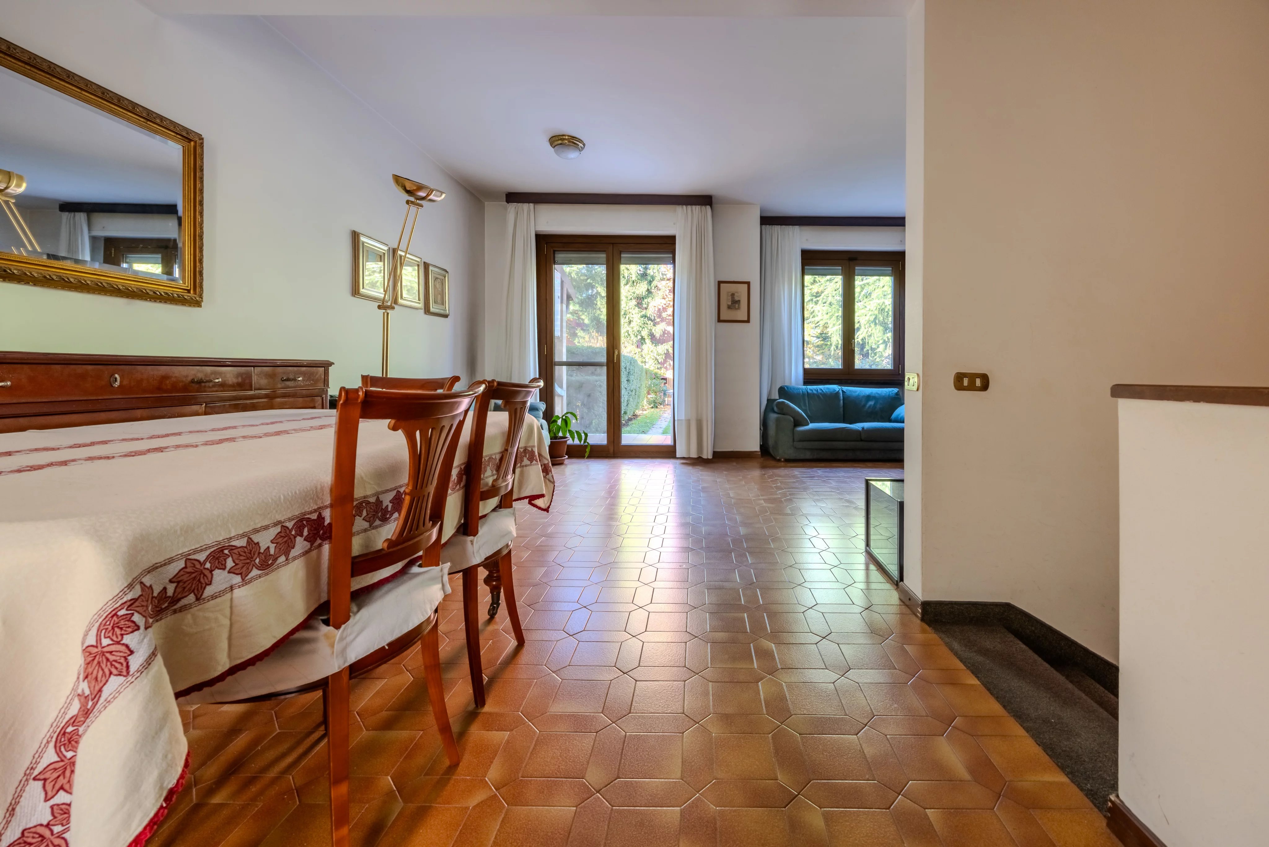Una comoda scala conduce al cuore della casa. Qui troviamo un ampio e accogliente soggiorno con zona pranzo, collegato direttamente al patio e al giardino privato, un'oasi verde perfetta per cene estive e momenti di relax all'aperto. Completano il piano la spaziosa cucina abitabile e un bagno di servizio.