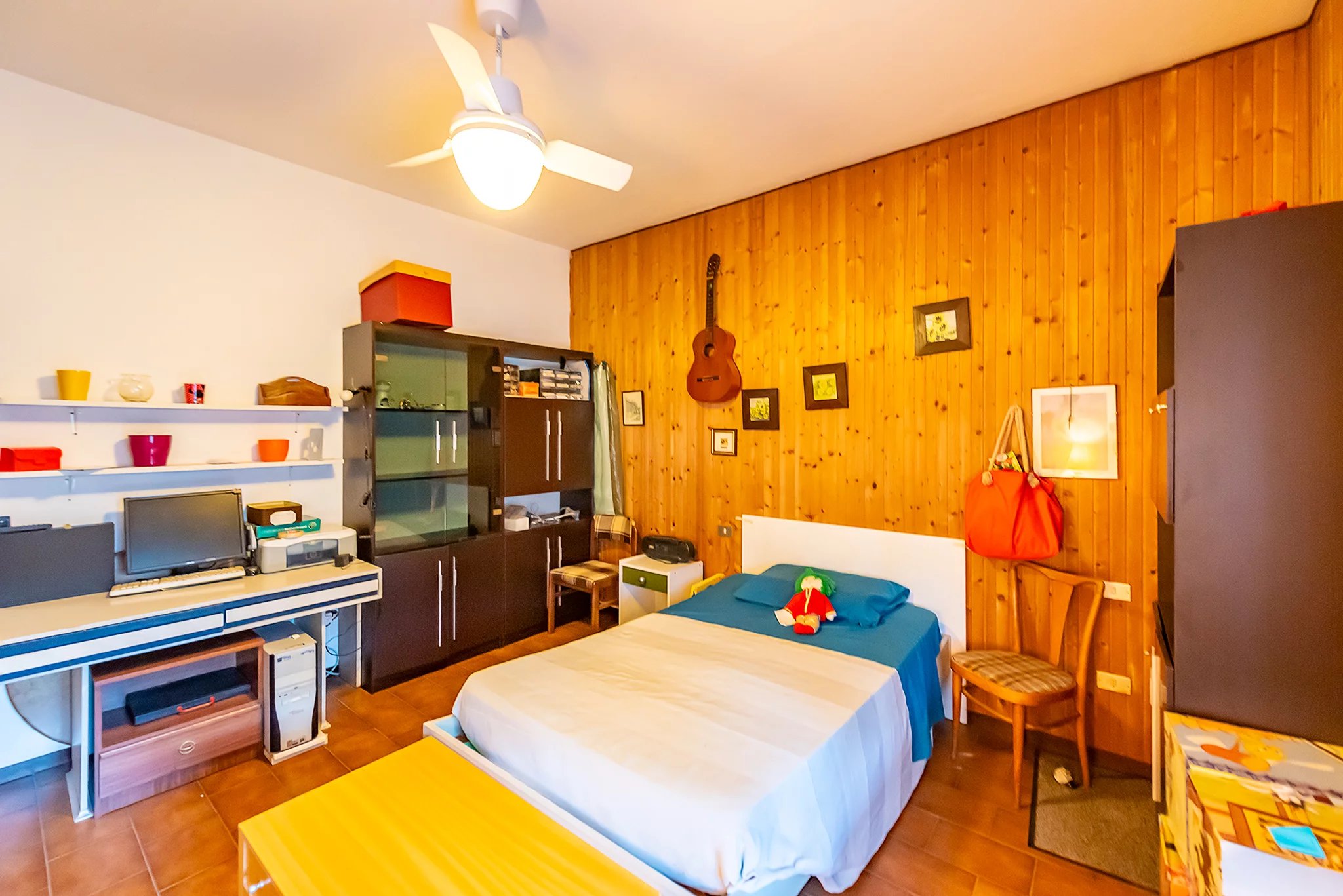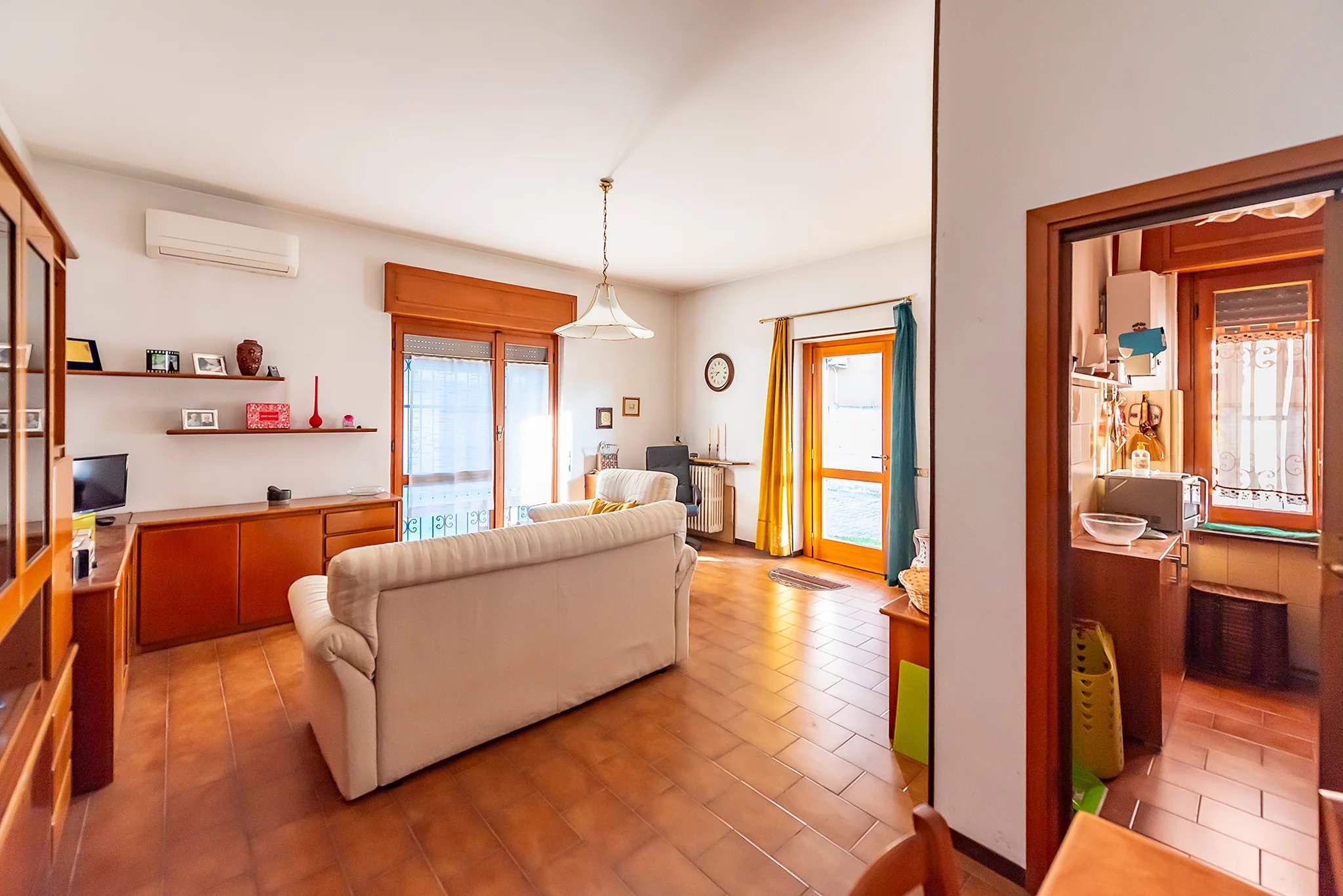 L’appartamento al piano terreno, in buono stato di conservazione, è caratterizzato da spazi comodi e funzionali. È composto da: ampio salone luminoso, cucina separata, due camere matrimoniali, bagno finestrato, locale lavanderia, locale caldaia ed un locale filtro che consente un eventuale collegamento diretto con la scala interna che porta all’alloggio del primo piano.