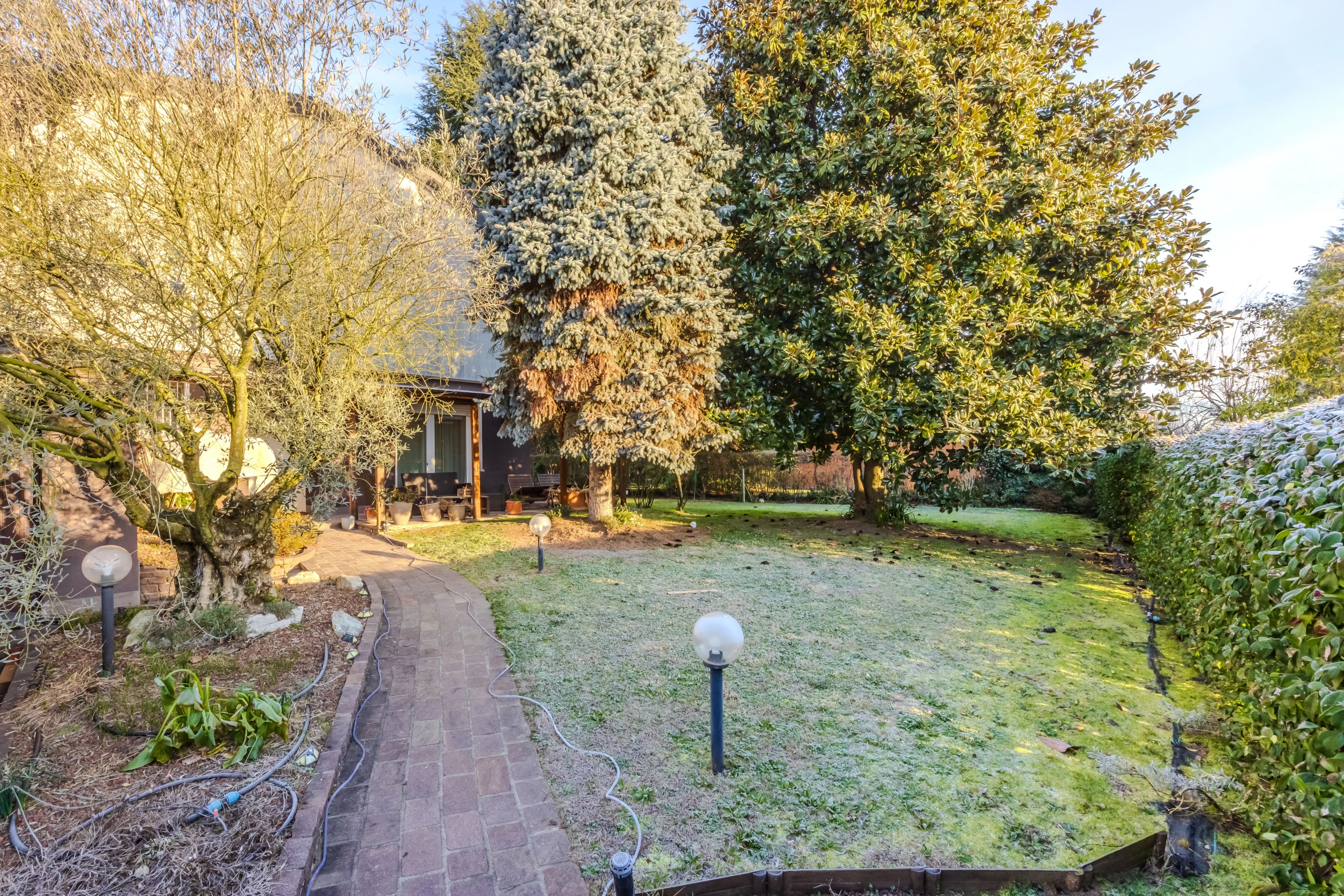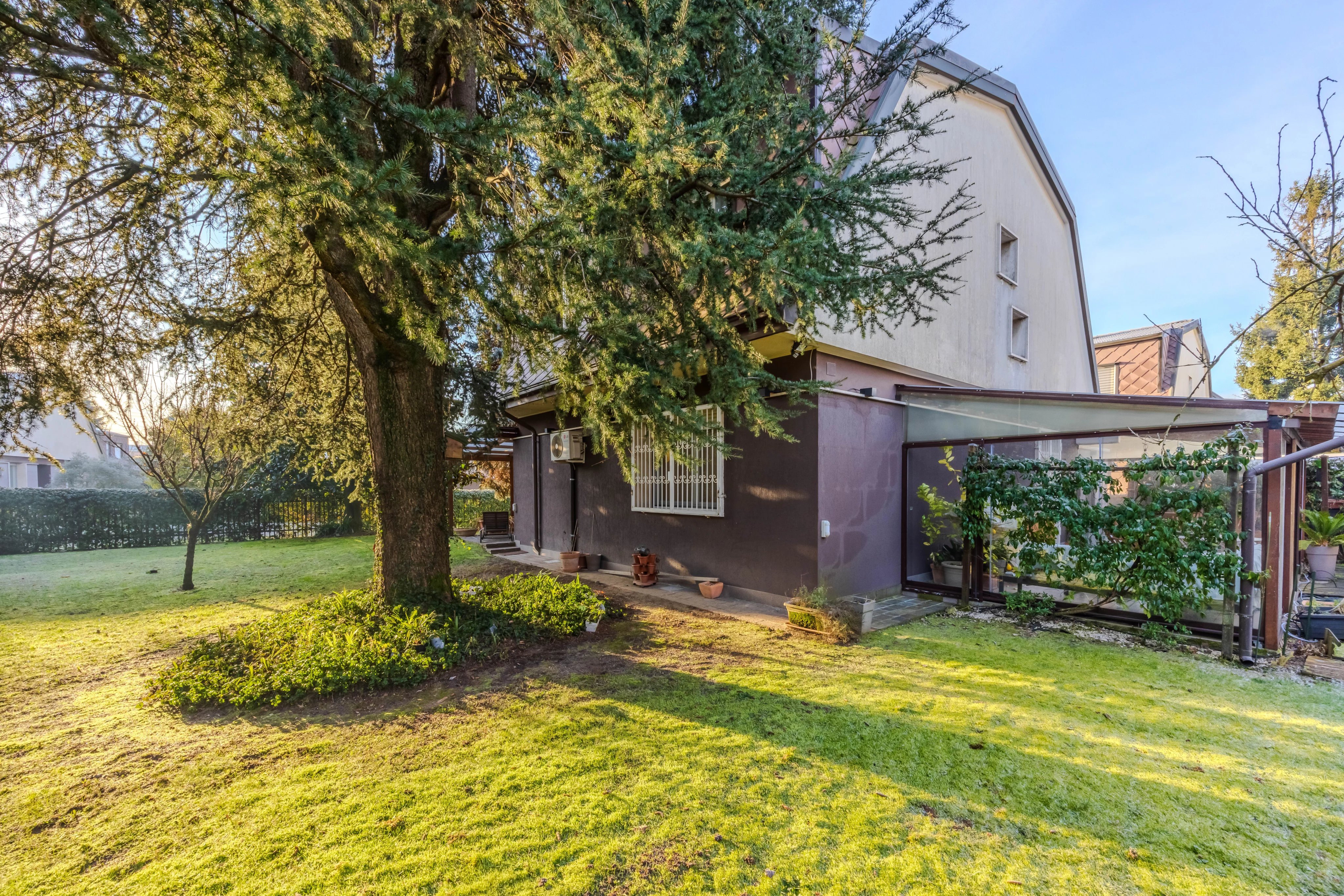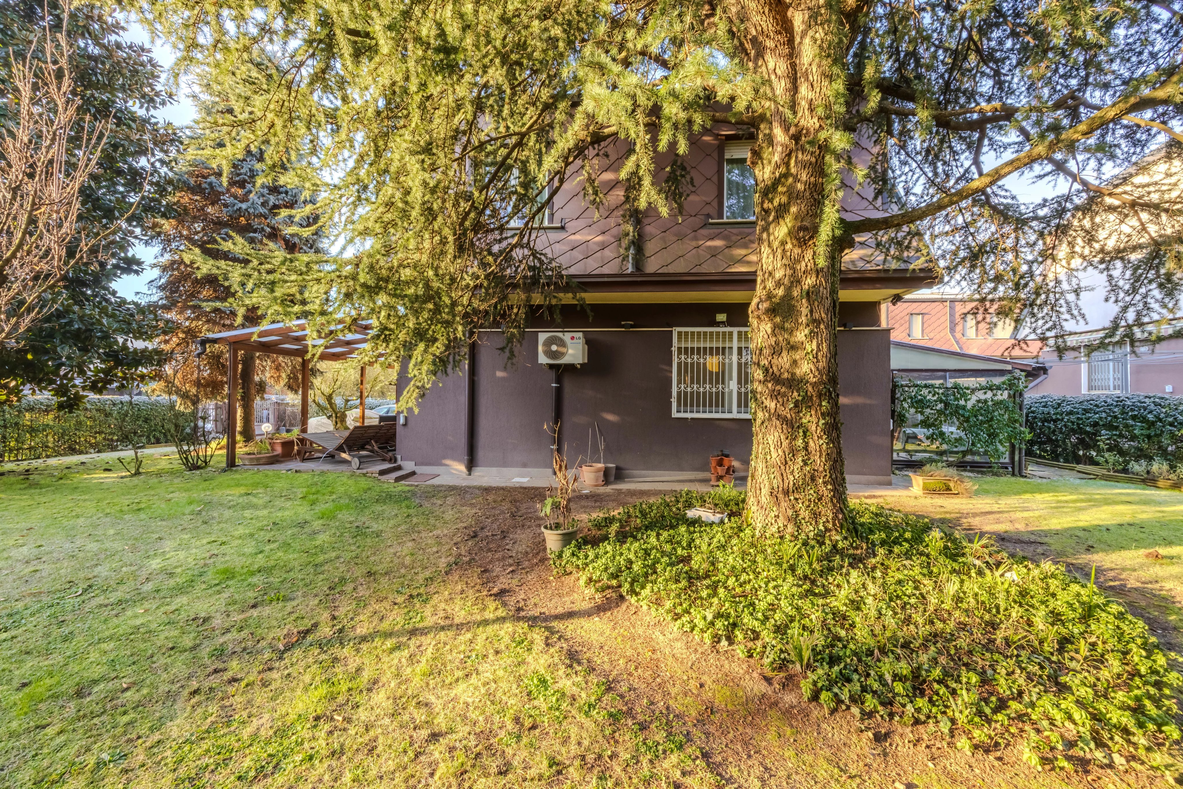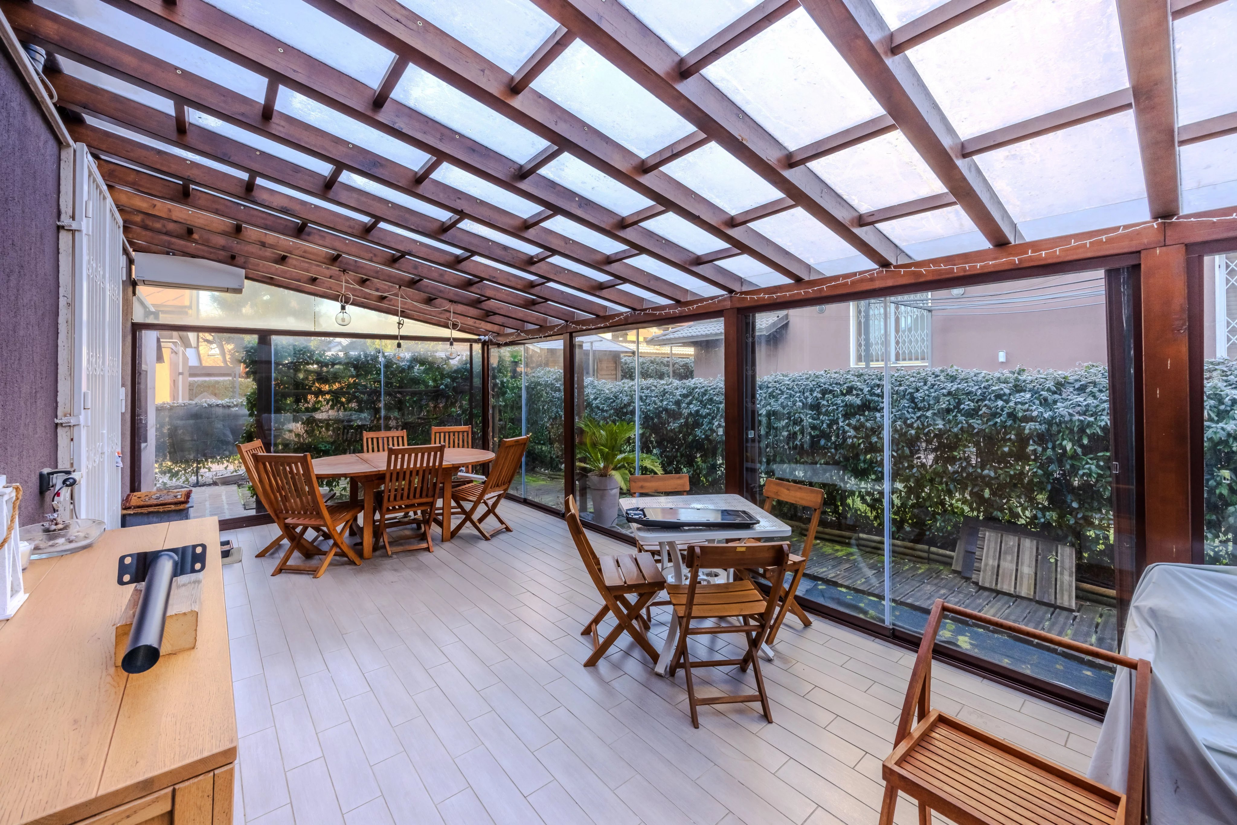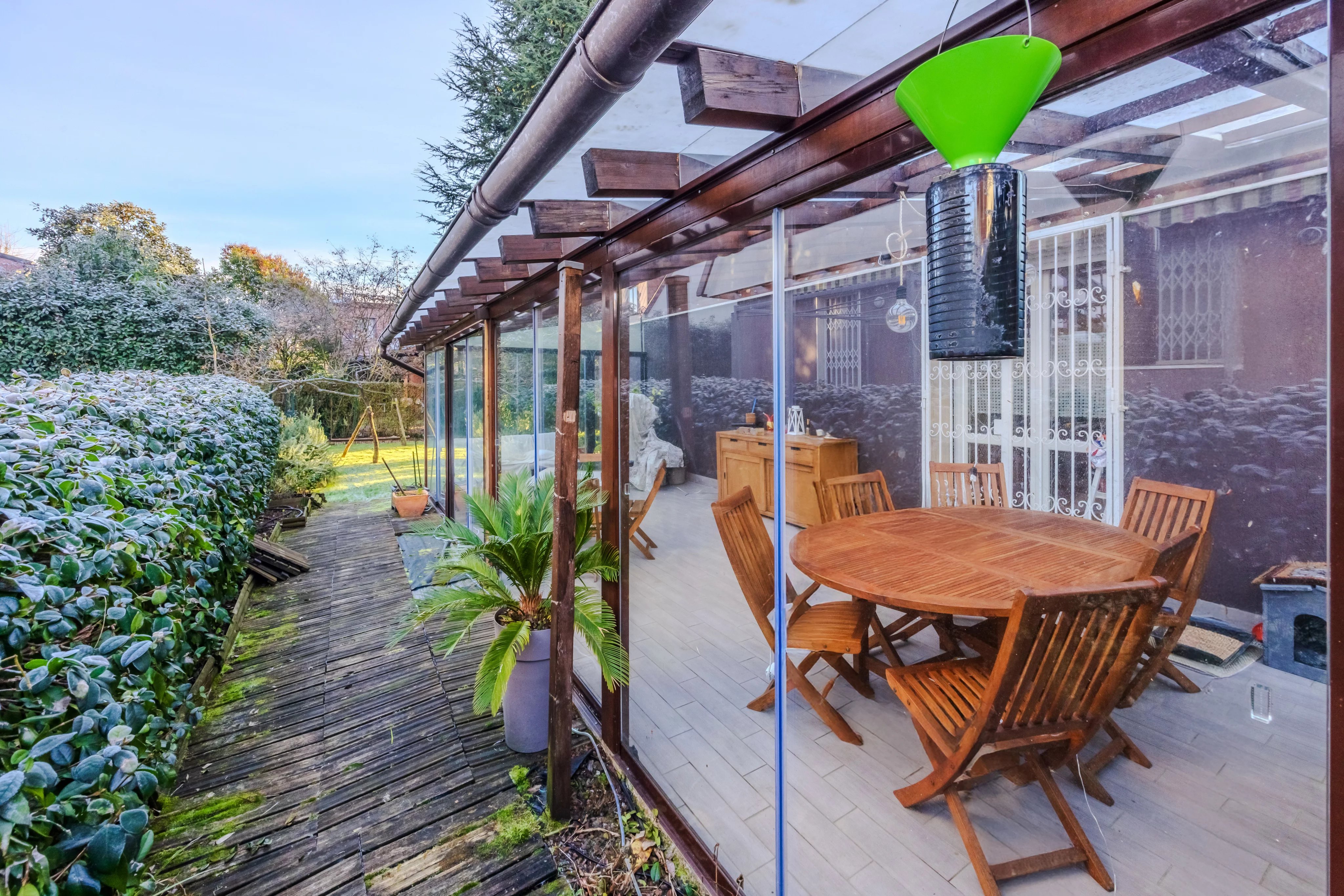 Internamente è composta da ingresso su ampio soggiorno con camino e pregiato parquet. Cucina abitabile spaziosa e funzionale. Il vero punto di forza è il patio verandato e climatizzato: un giardino d'inverno vivibile tutto l'anno con affaccio sul verde privato. Completano il piano l'area lavanderia e un bagno.