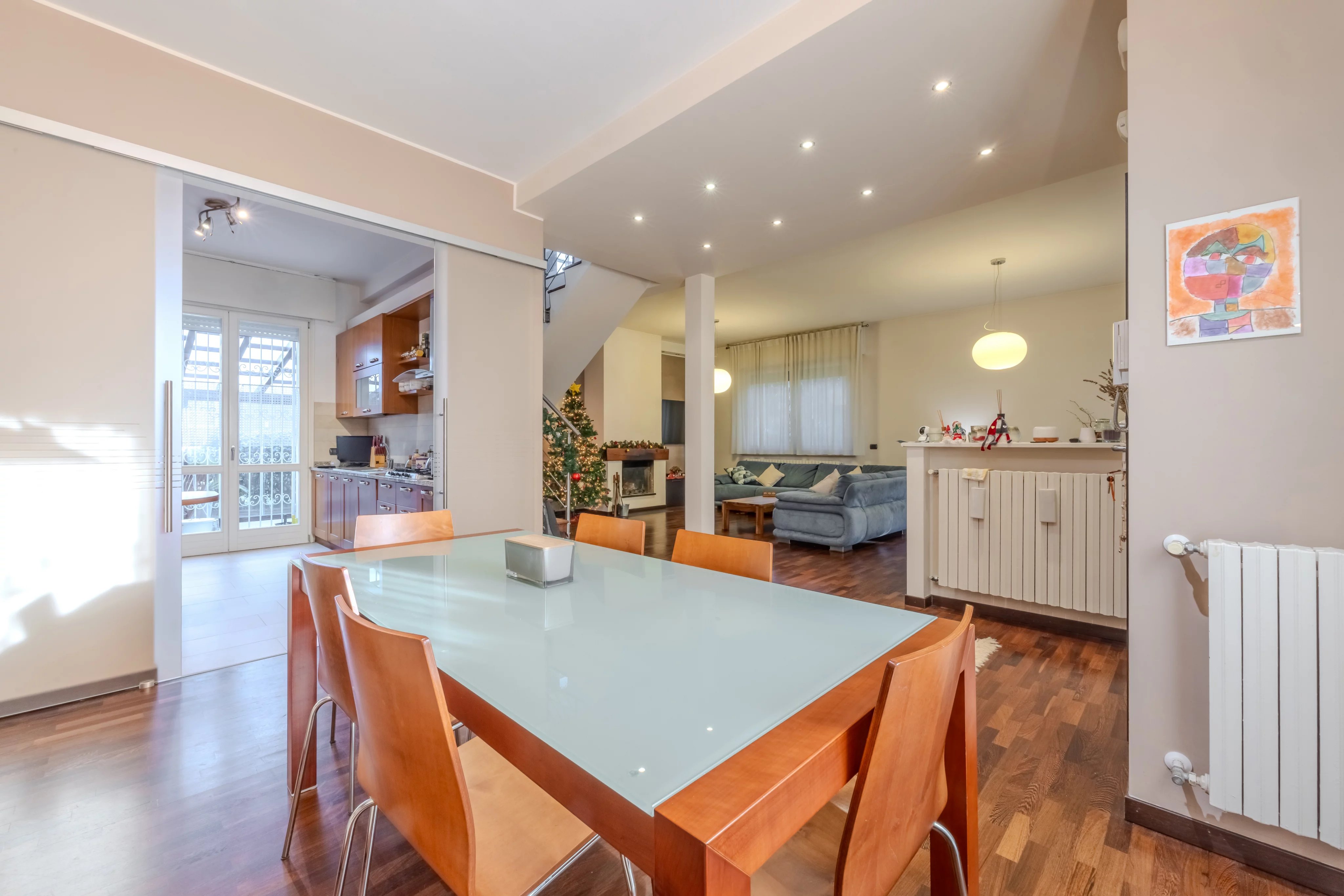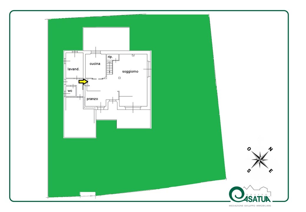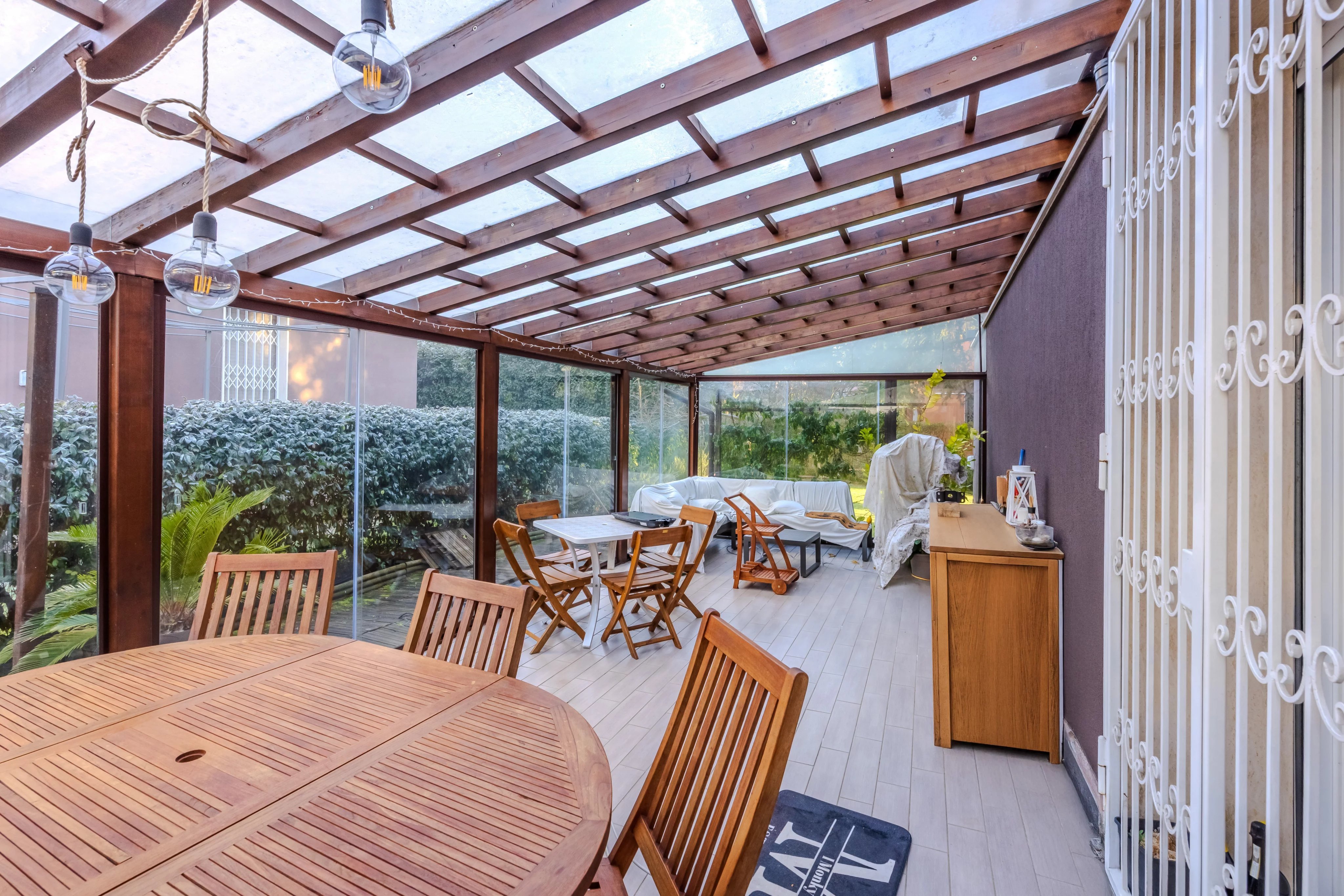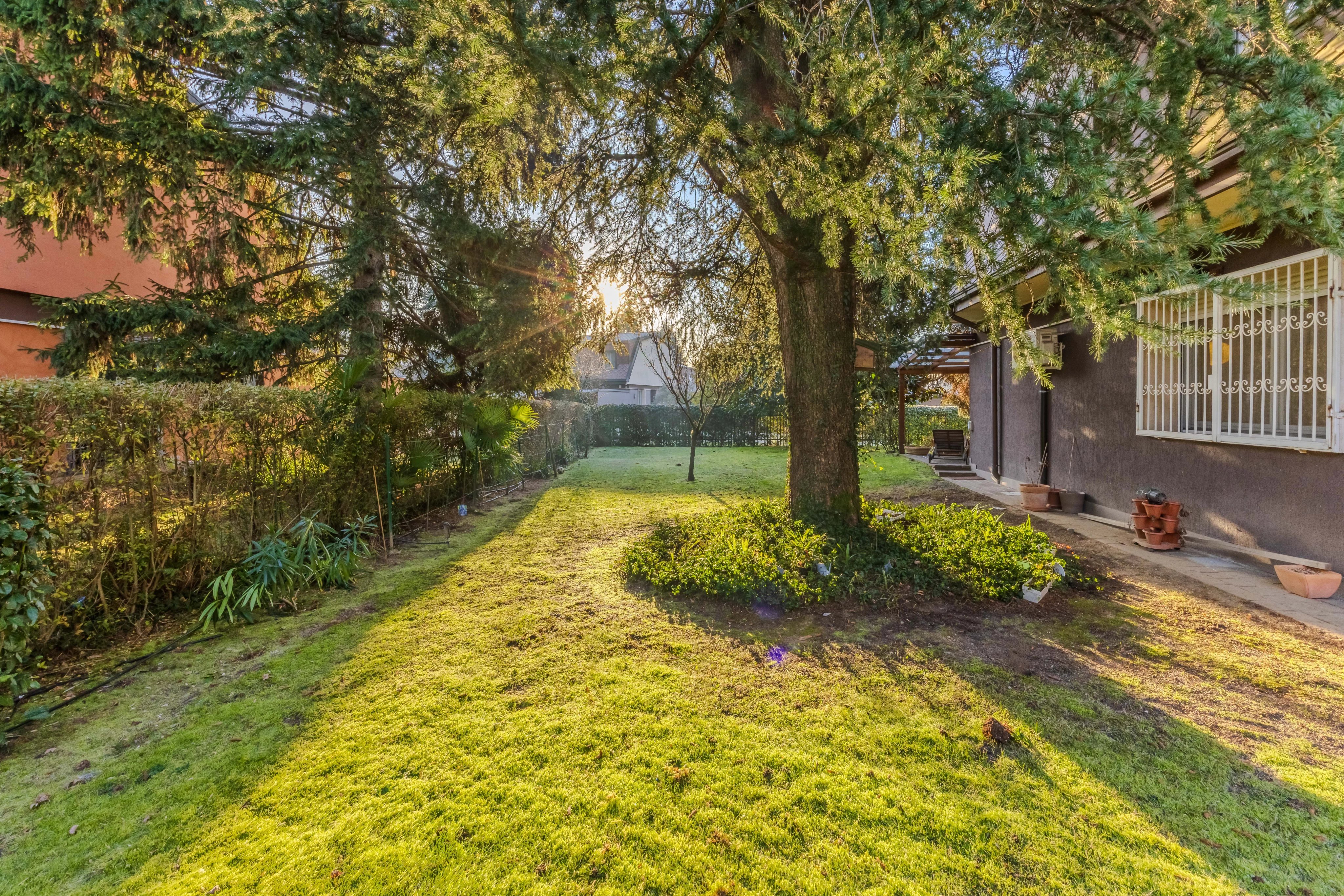 Internamente è composta da ingresso su ampio soggiorno con camino e pregiato parquet. Cucina abitabile spaziosa e funzionale. Il vero punto di forza è il patio verandato e climatizzato: un giardino d'inverno vivibile tutto l'anno con affaccio sul verde privato. Completano il piano l'area lavanderia e un bagno.