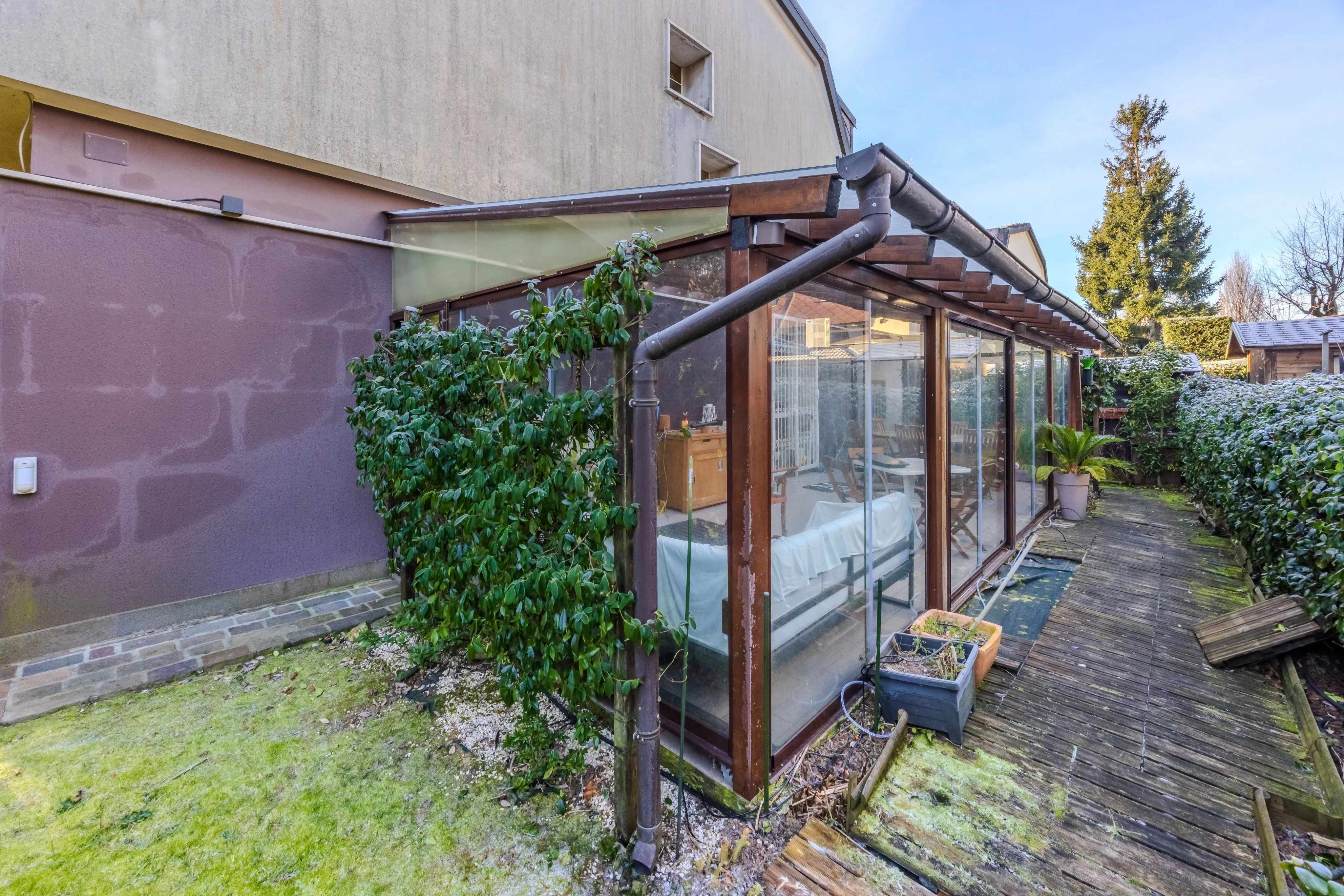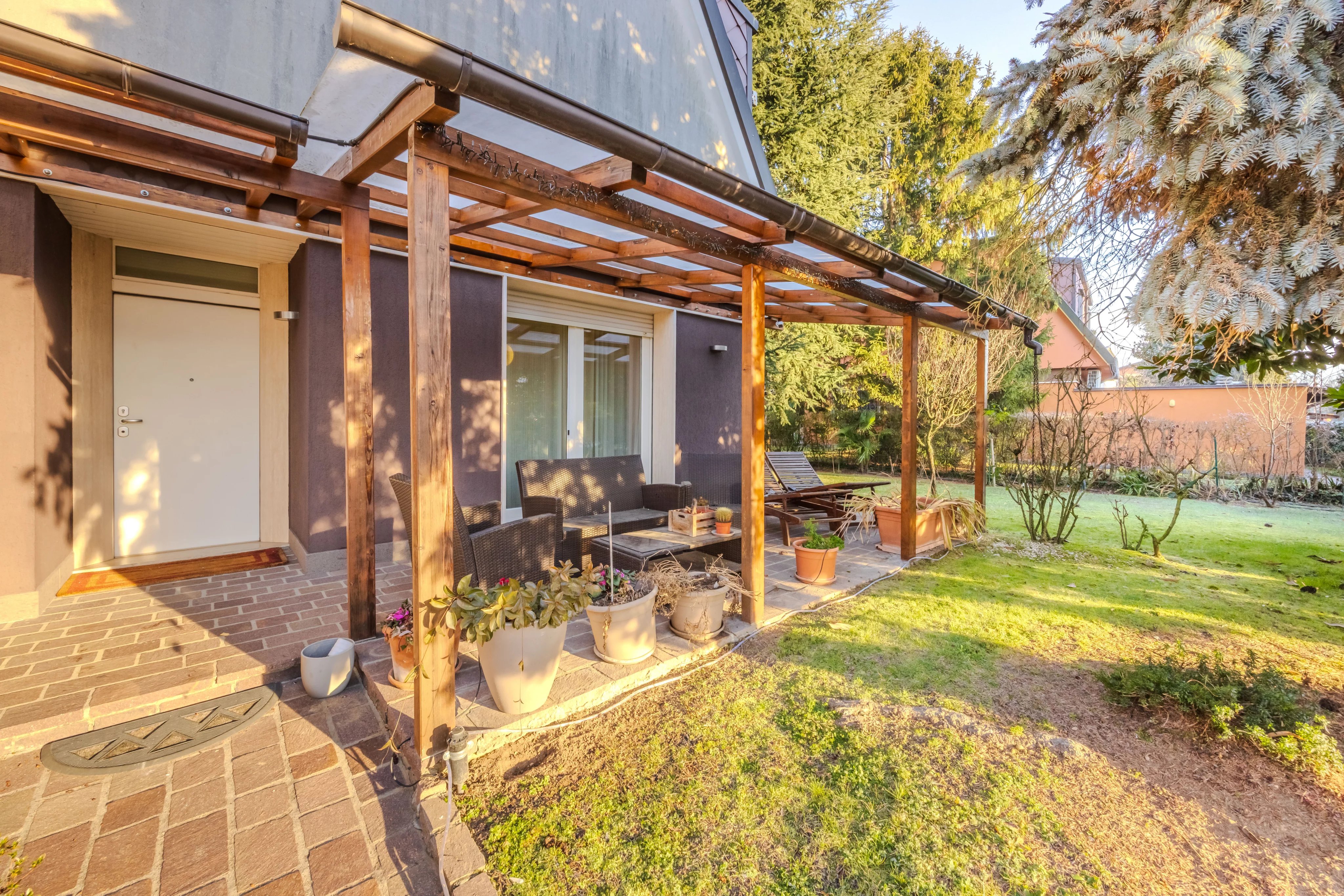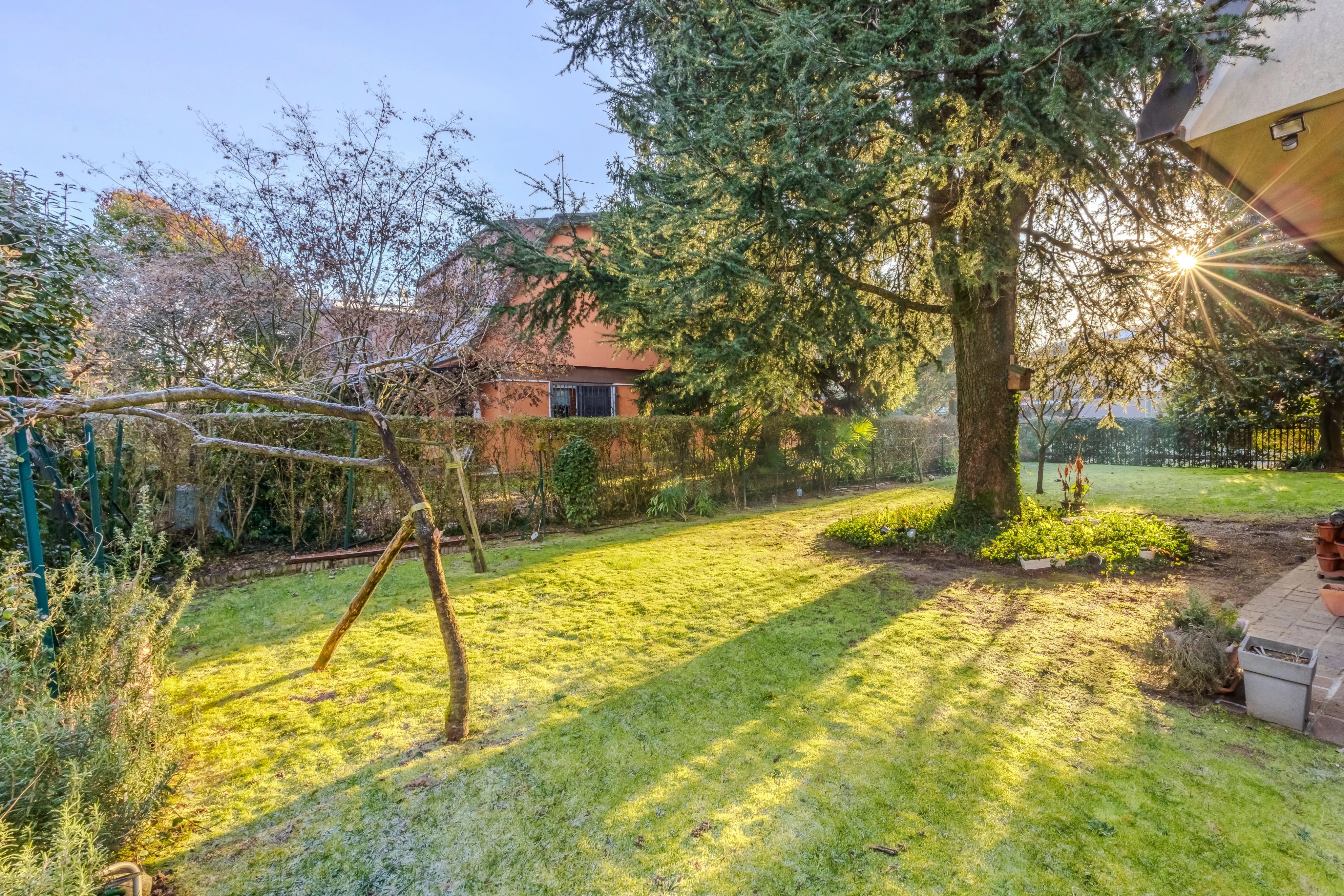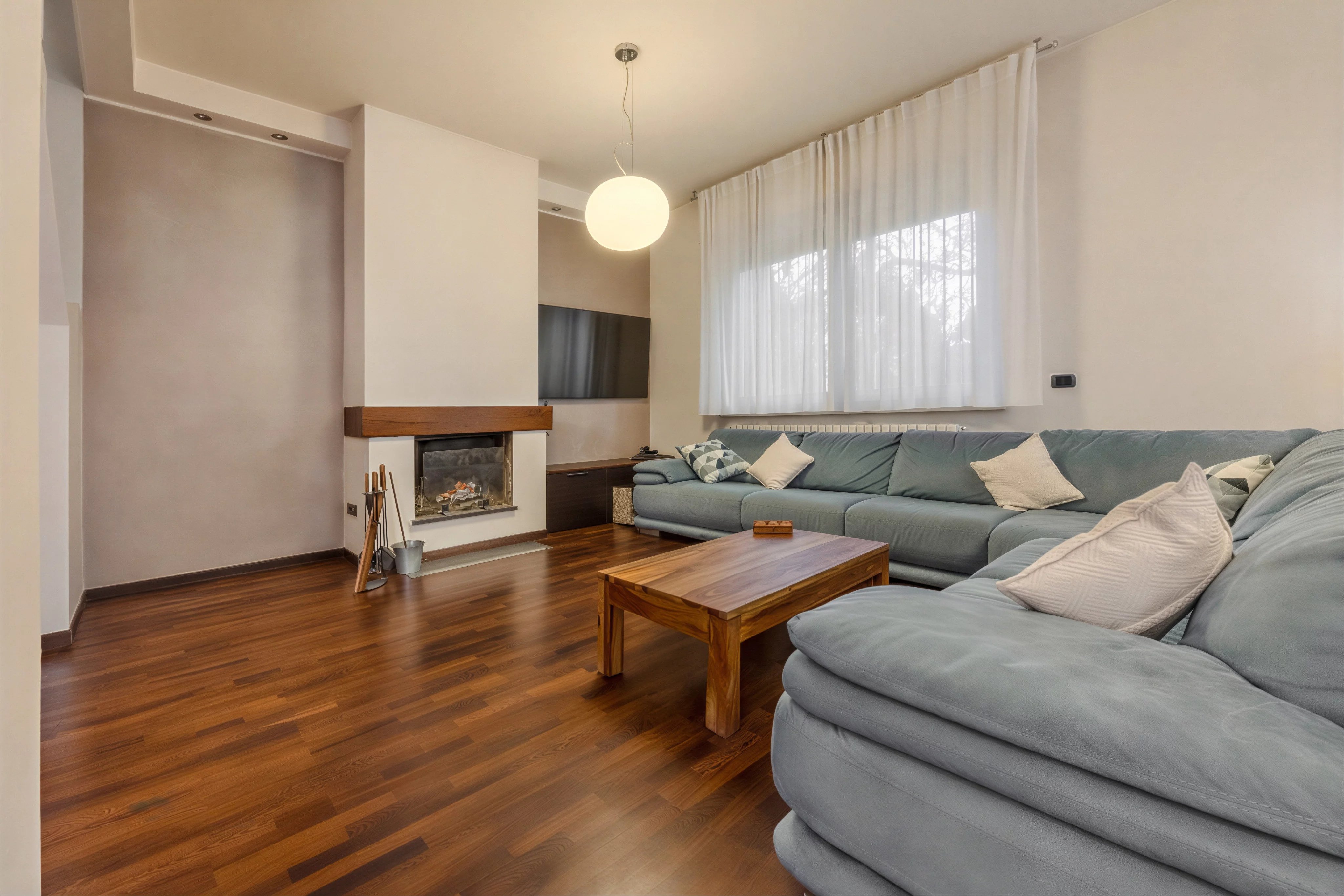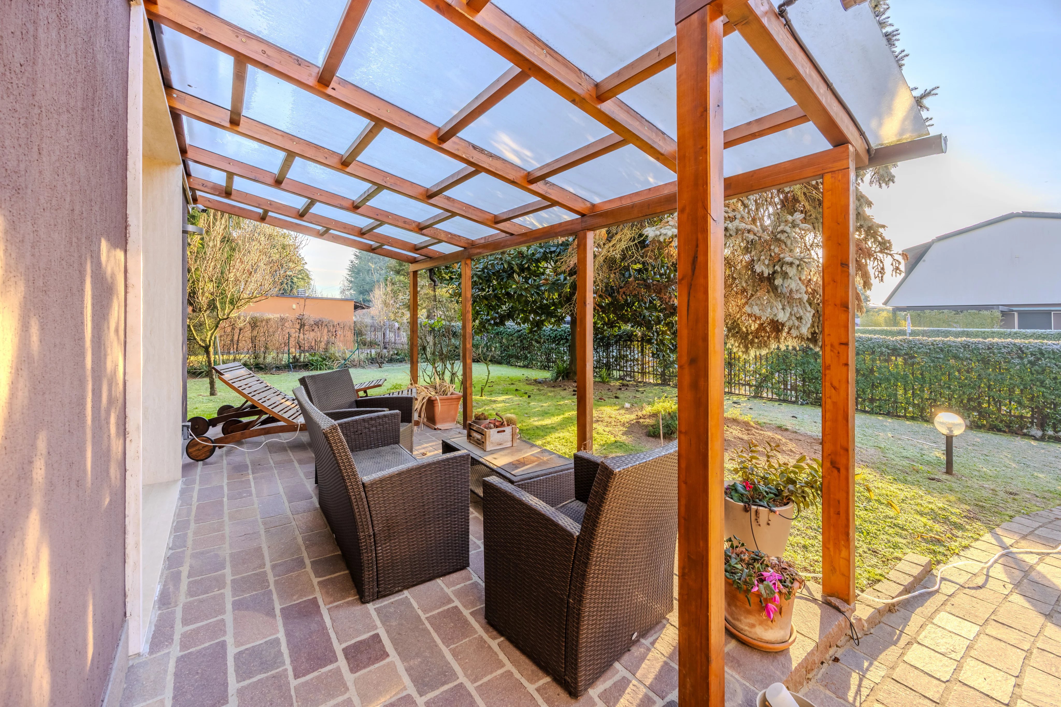 Internamente è composta da ingresso su ampio soggiorno con camino e pregiato parquet. Cucina abitabile spaziosa e funzionale. Il vero punto di forza è il patio verandato e climatizzato: un giardino d'inverno vivibile tutto l'anno con affaccio sul verde privato. Completano il piano l'area lavanderia e un bagno.