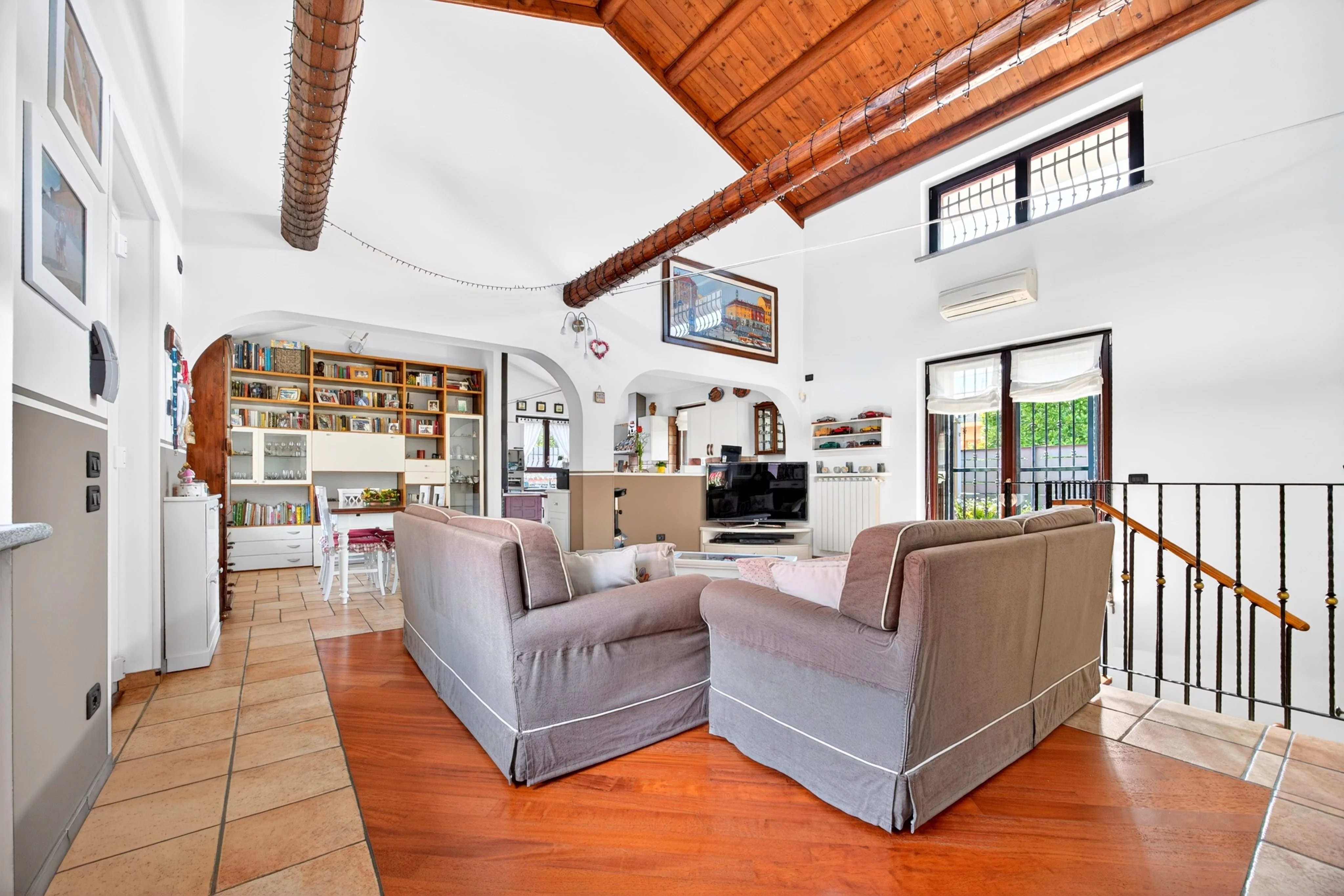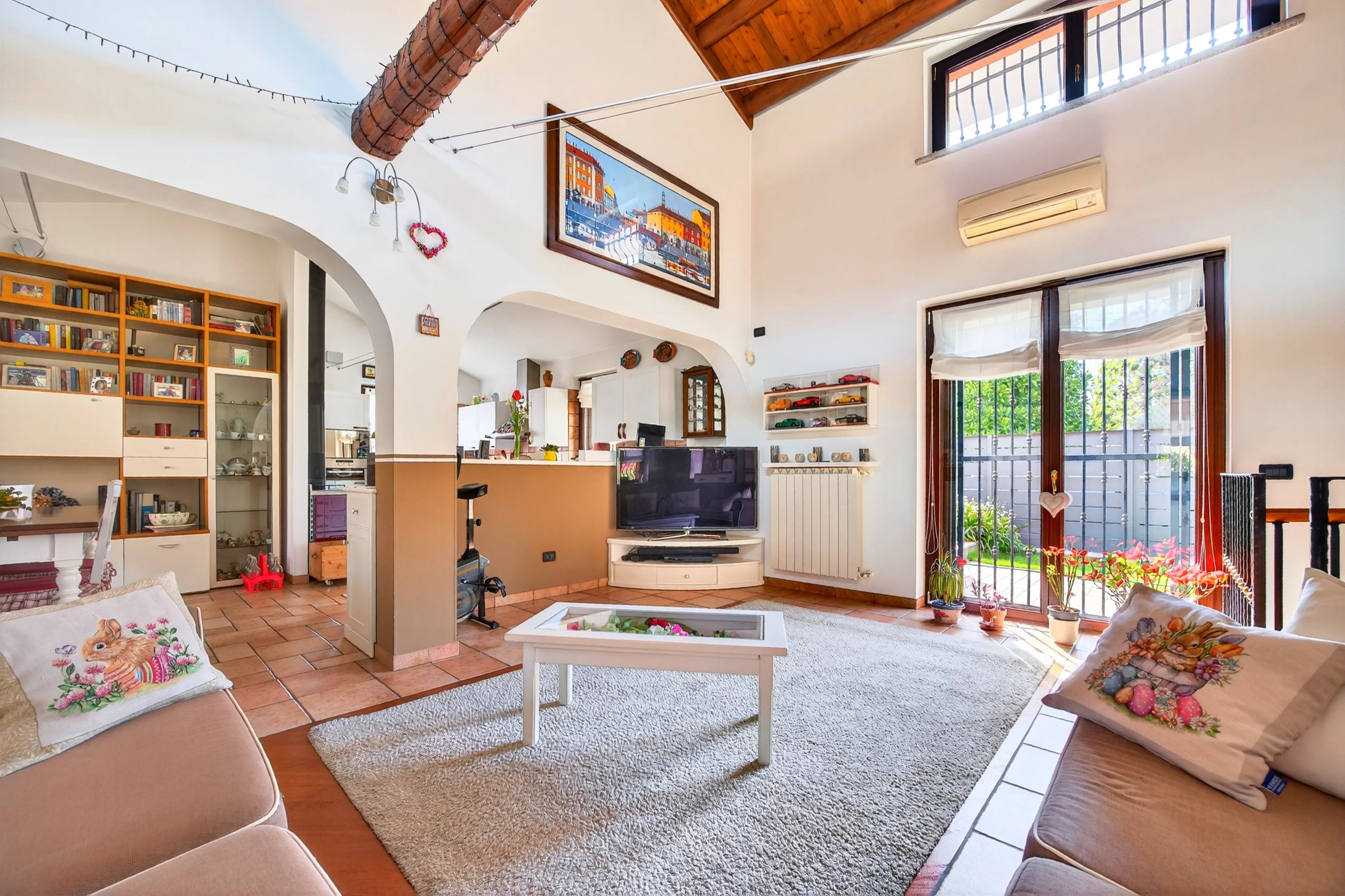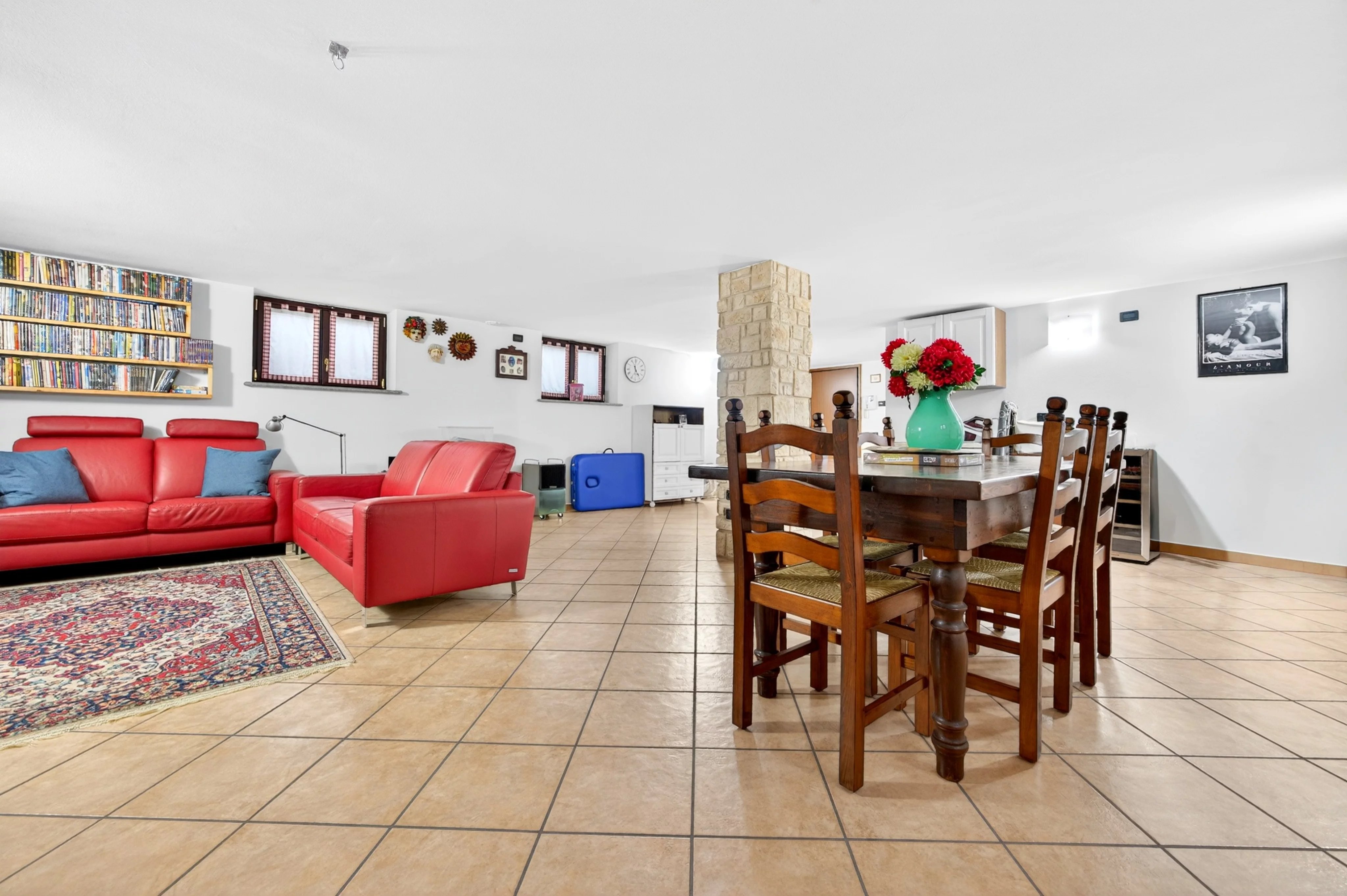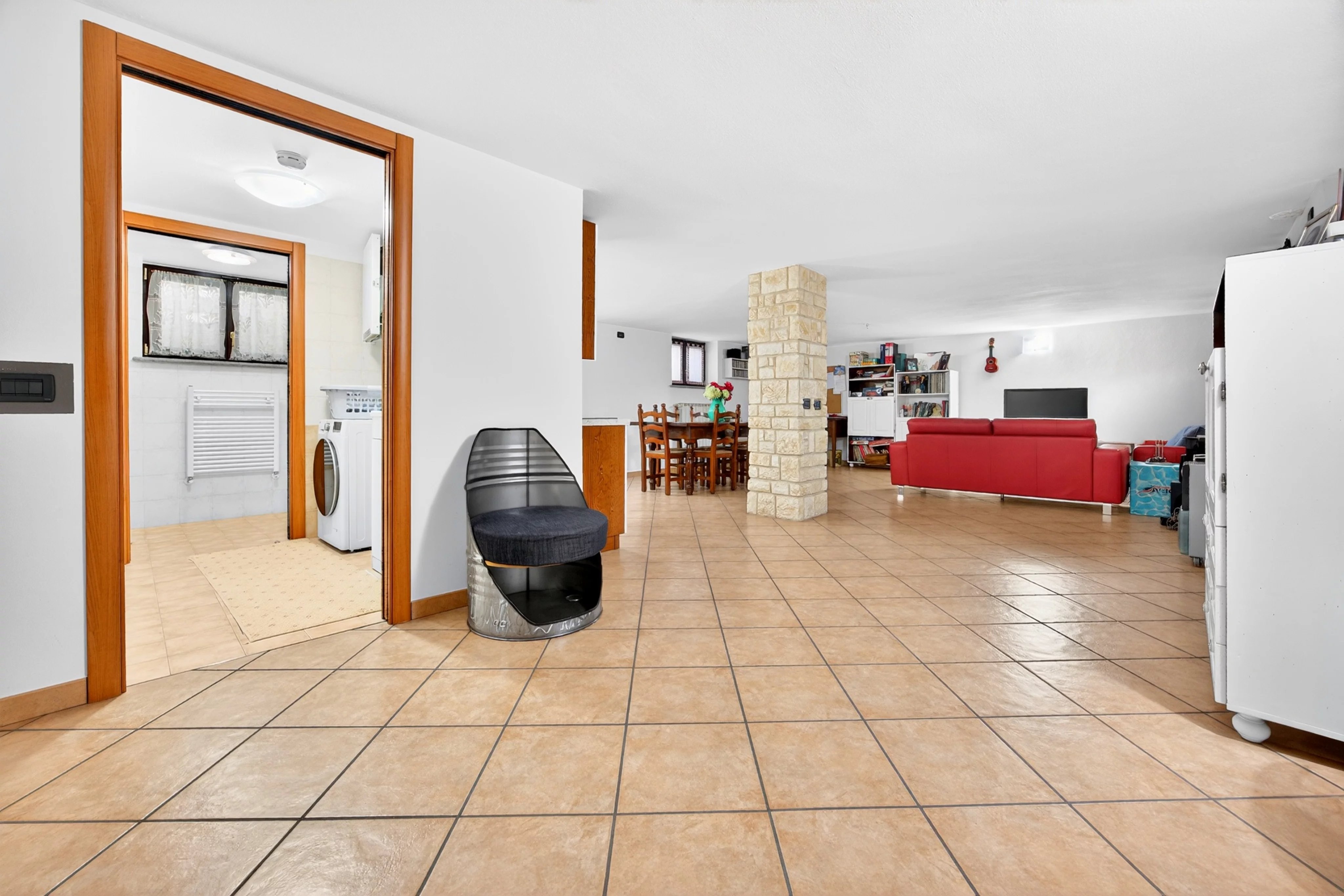 L'ingresso principale conduce a un ampio salone con zona pranzo, valorizzato da soffitti alti con travi a vista che donano calore e fascino; la cucina abitabile a vista è perfettamente integrata nel living. La zona notte è composta da tre camere da letto accoglienti, con la camera matrimoniale che vanta una cabina armadio dedicata e un bagno en-suite. Al piano interrato troviamo la taverna indipendente, uno spazio versatile di 60 mq con ingresso proprio, ideale come sala hobby o zona relax, completo di lavanderia e locali tecnici.