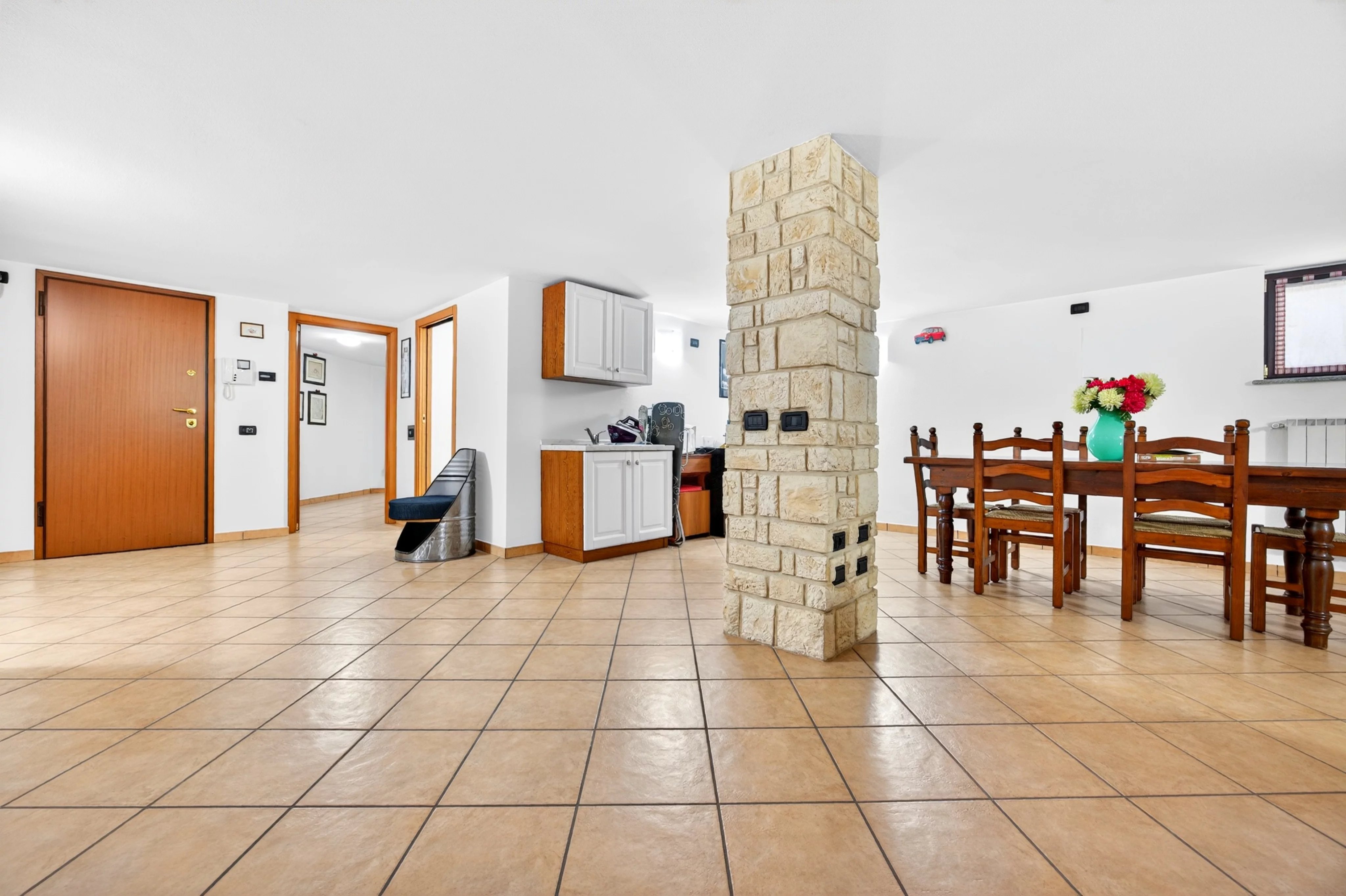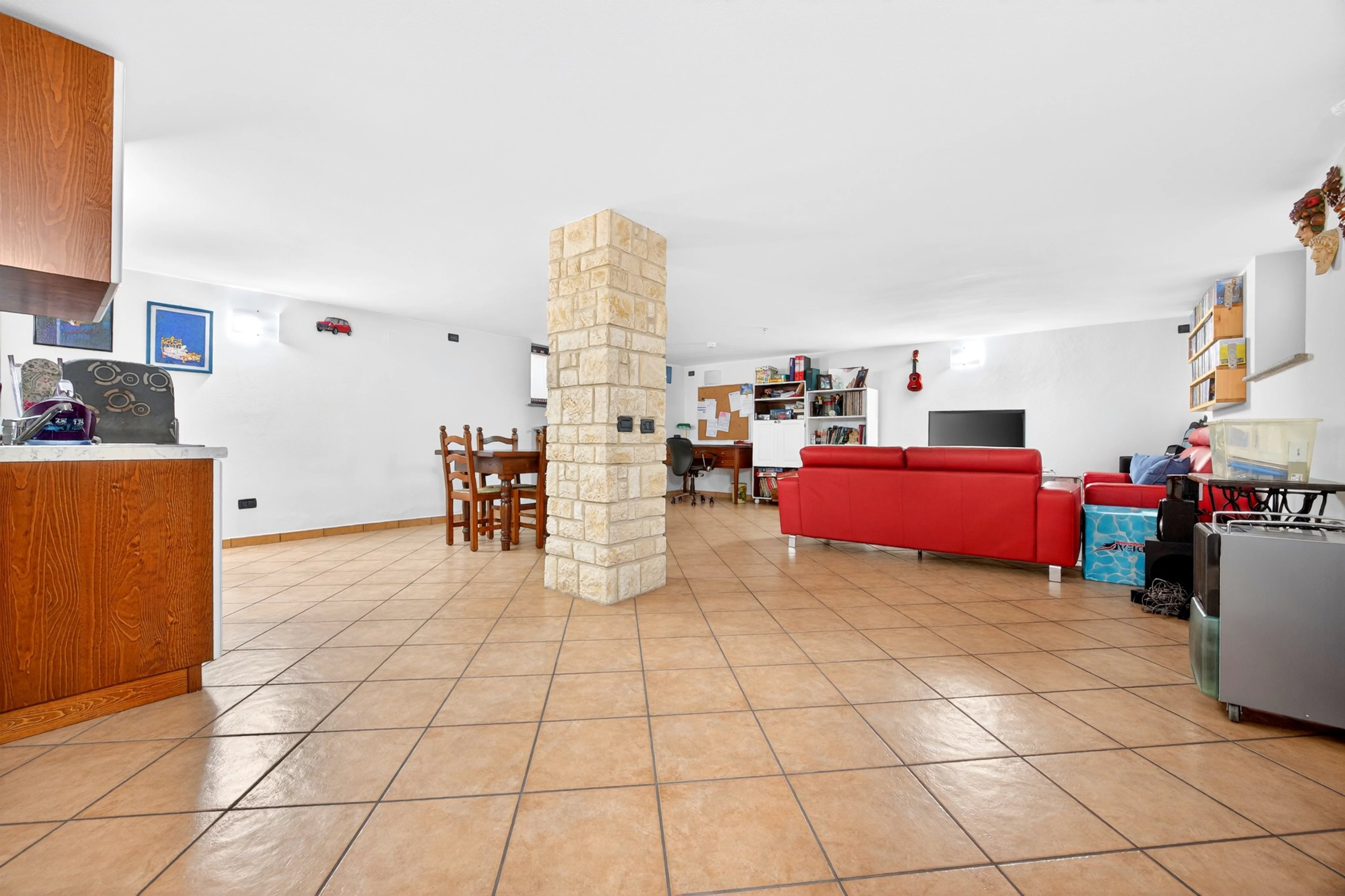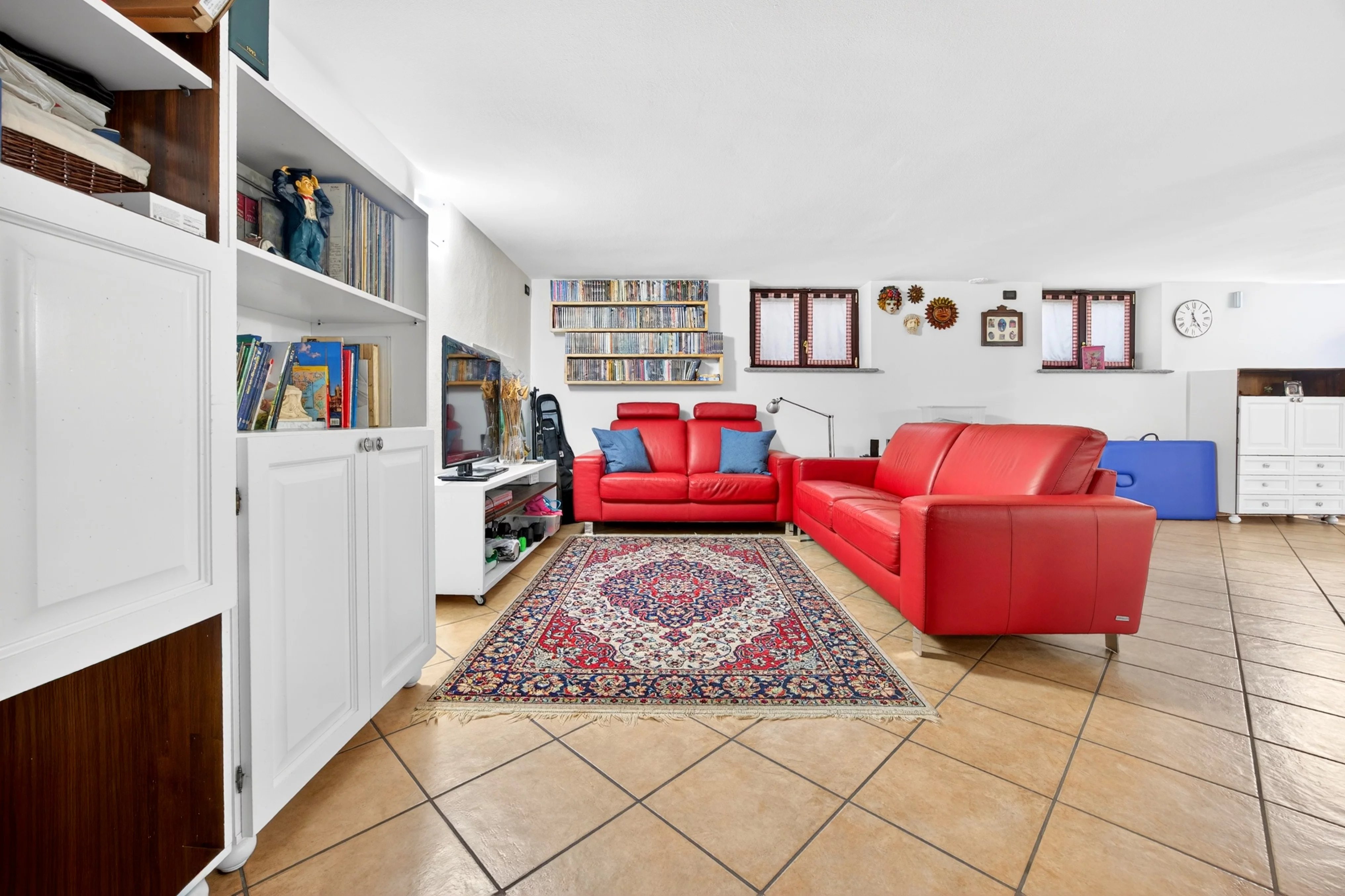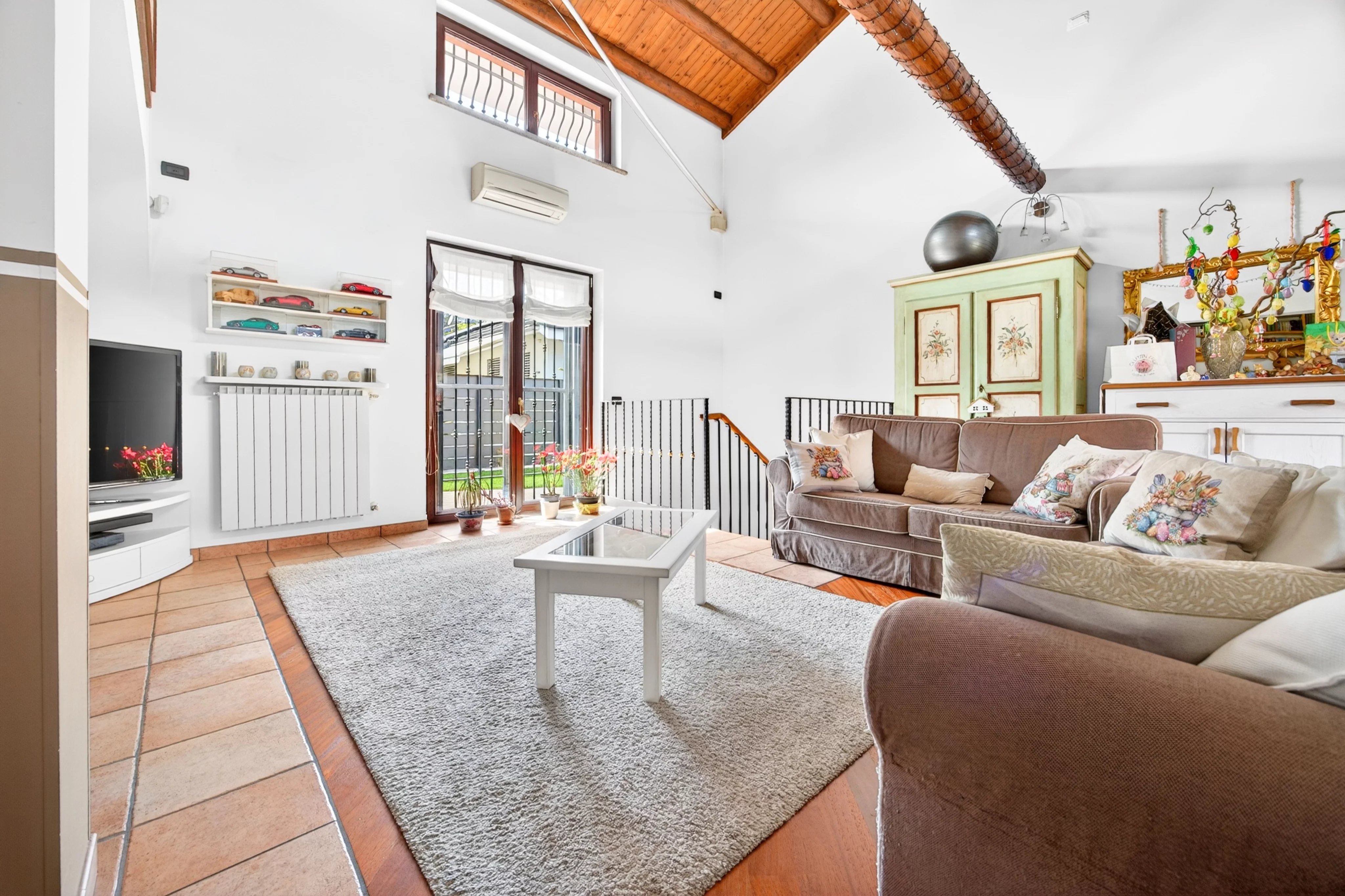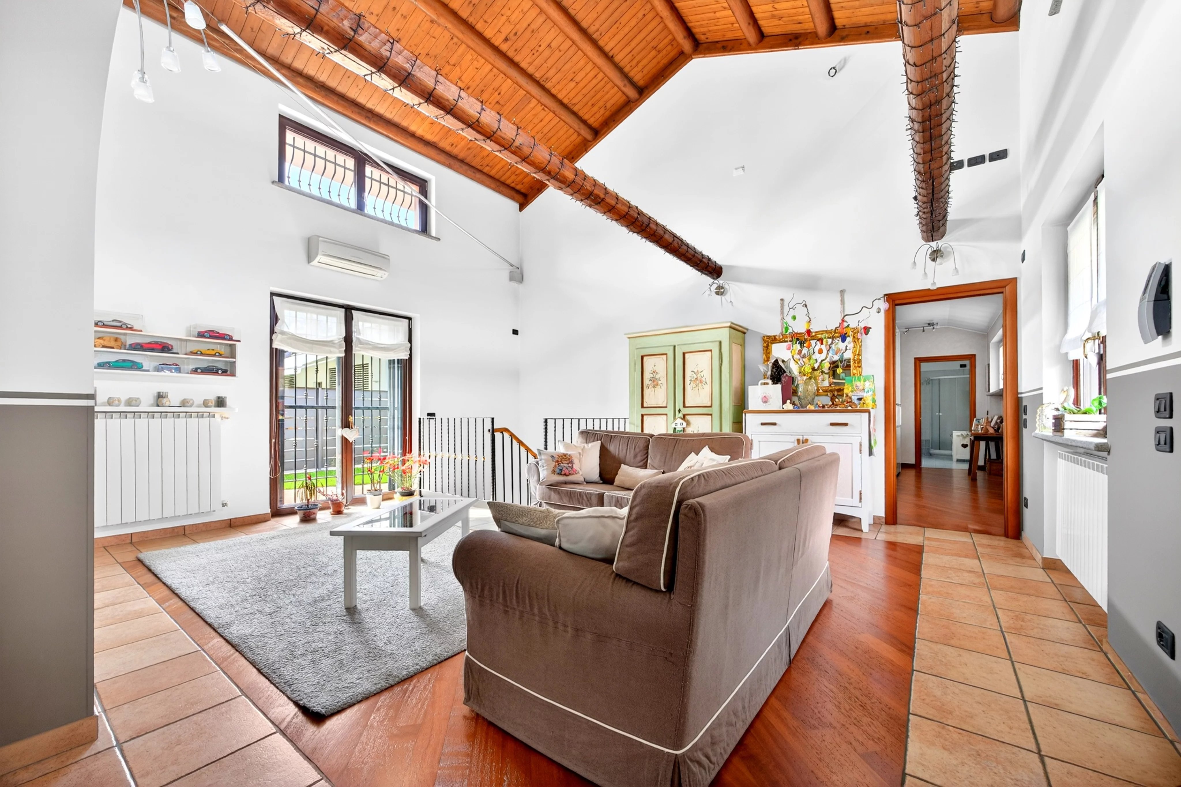 L'ingresso principale conduce a un ampio salone con zona pranzo, valorizzato da soffitti alti con travi a vista che donano calore e fascino; la cucina abitabile a vista è perfettamente integrata nel living. La zona notte è composta da tre camere da letto accoglienti, con la camera matrimoniale che vanta una cabina armadio dedicata e un bagno en-suite. Al piano interrato troviamo la taverna indipendente, uno spazio versatile di 60 mq con ingresso proprio, ideale come sala hobby o zona relax, completo di lavanderia e locali tecnici.