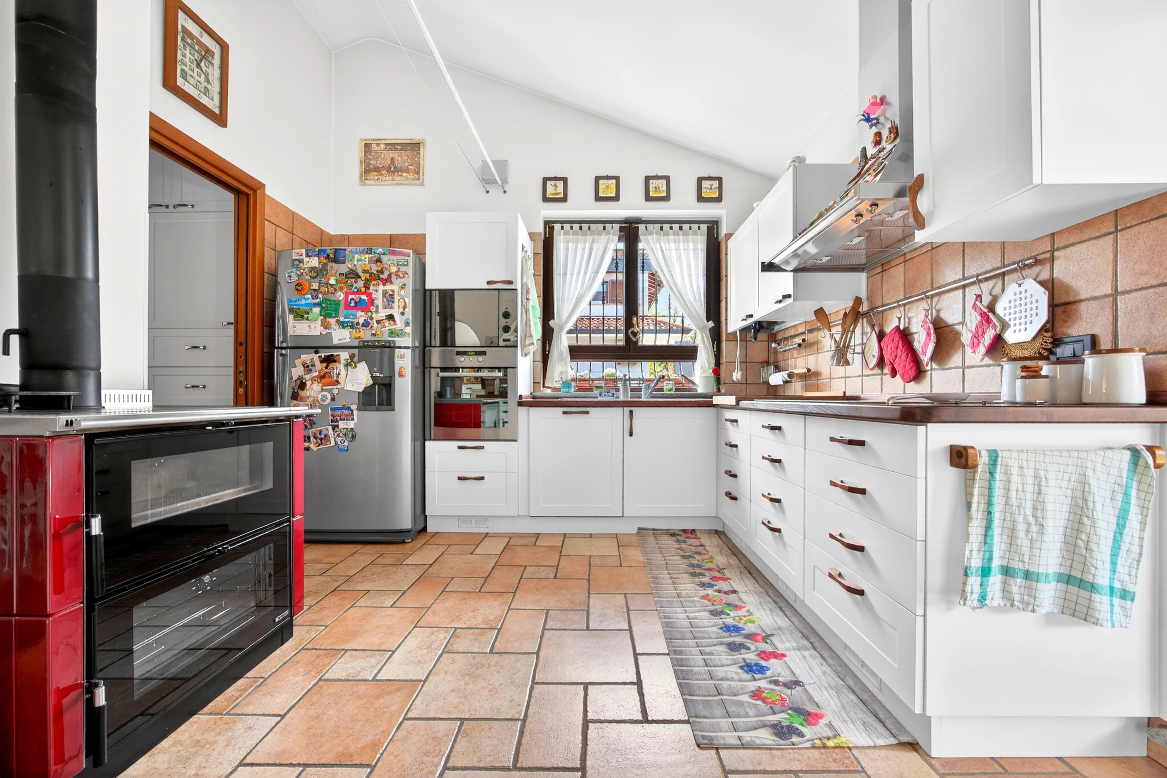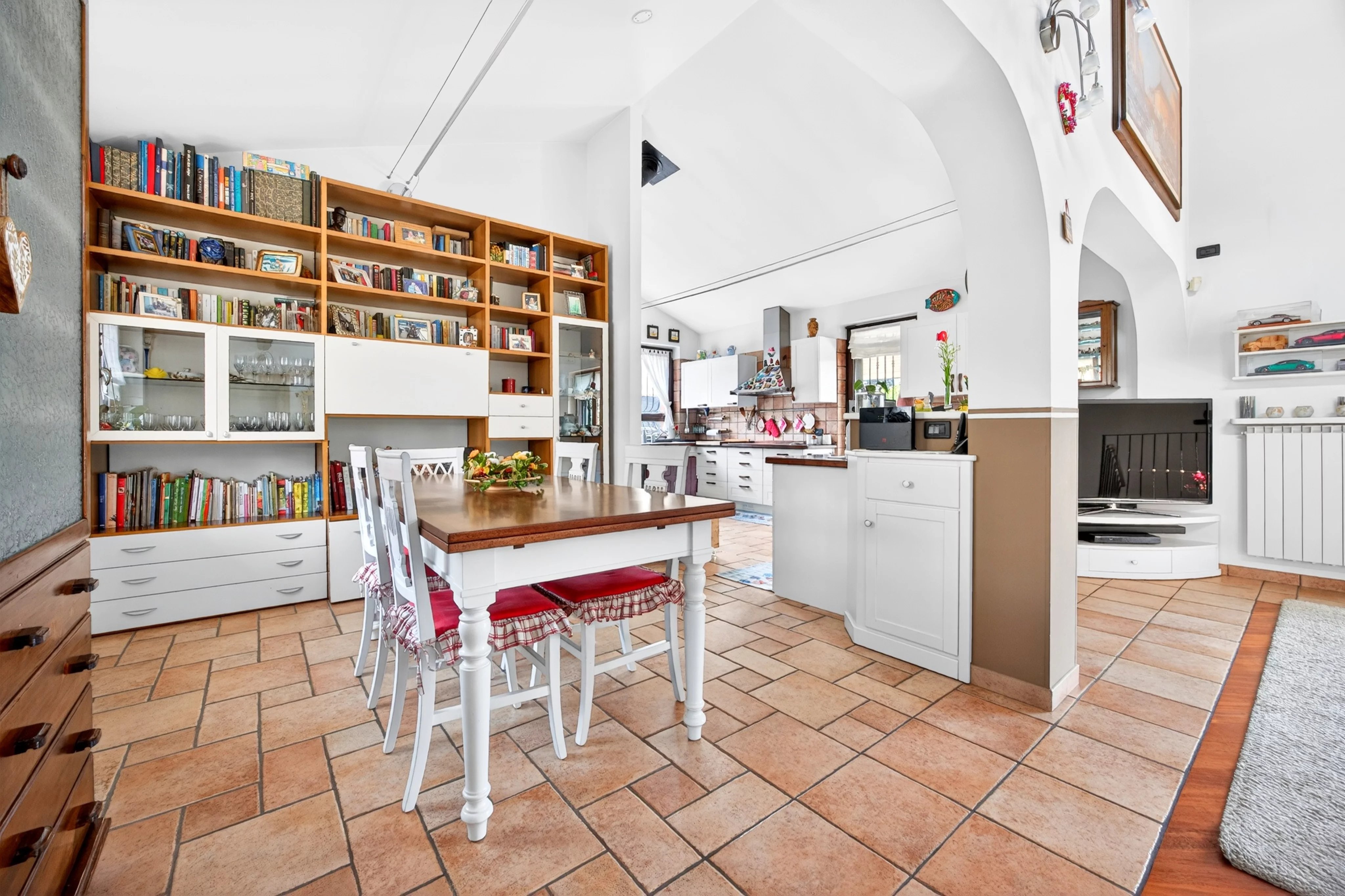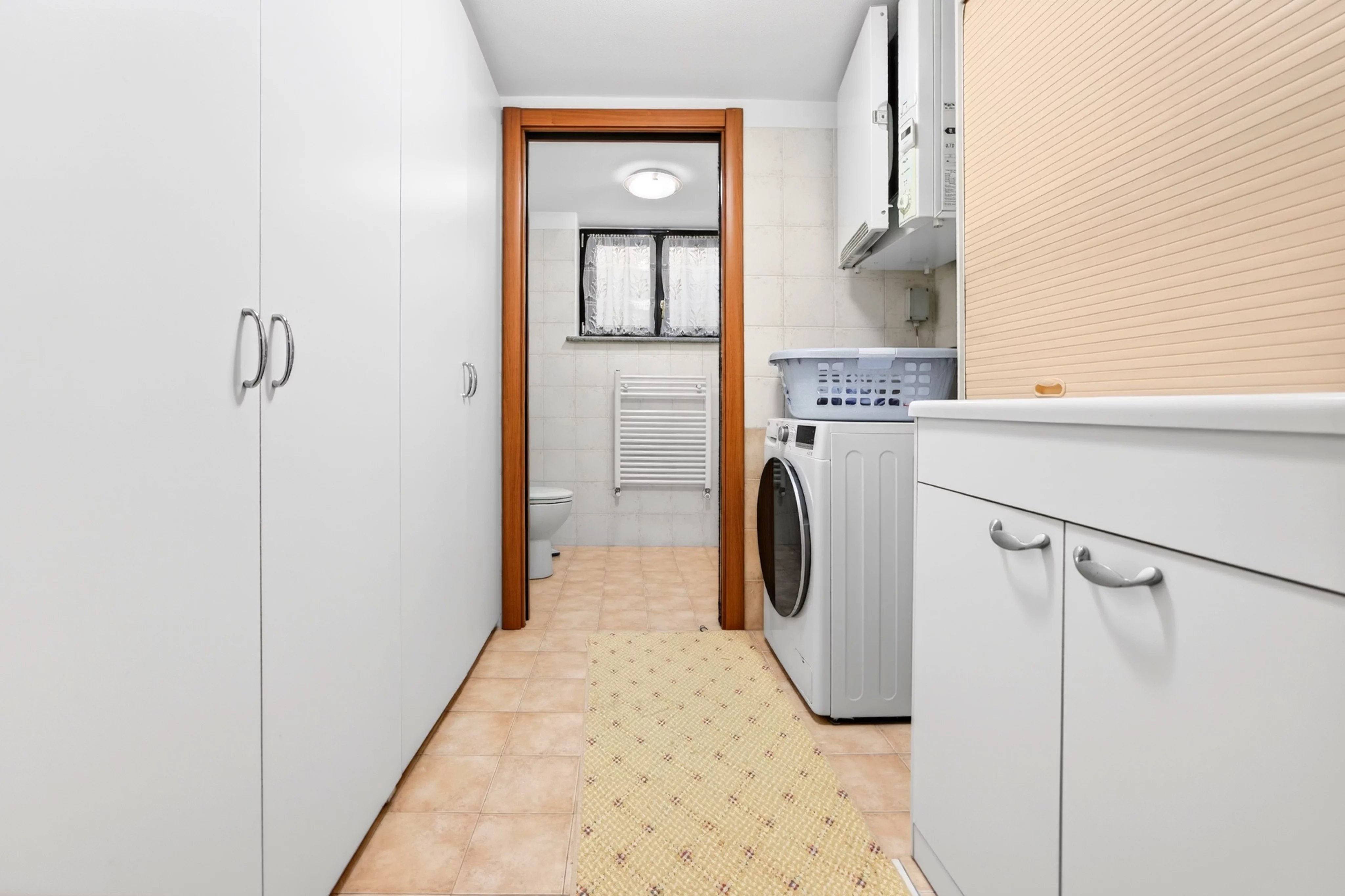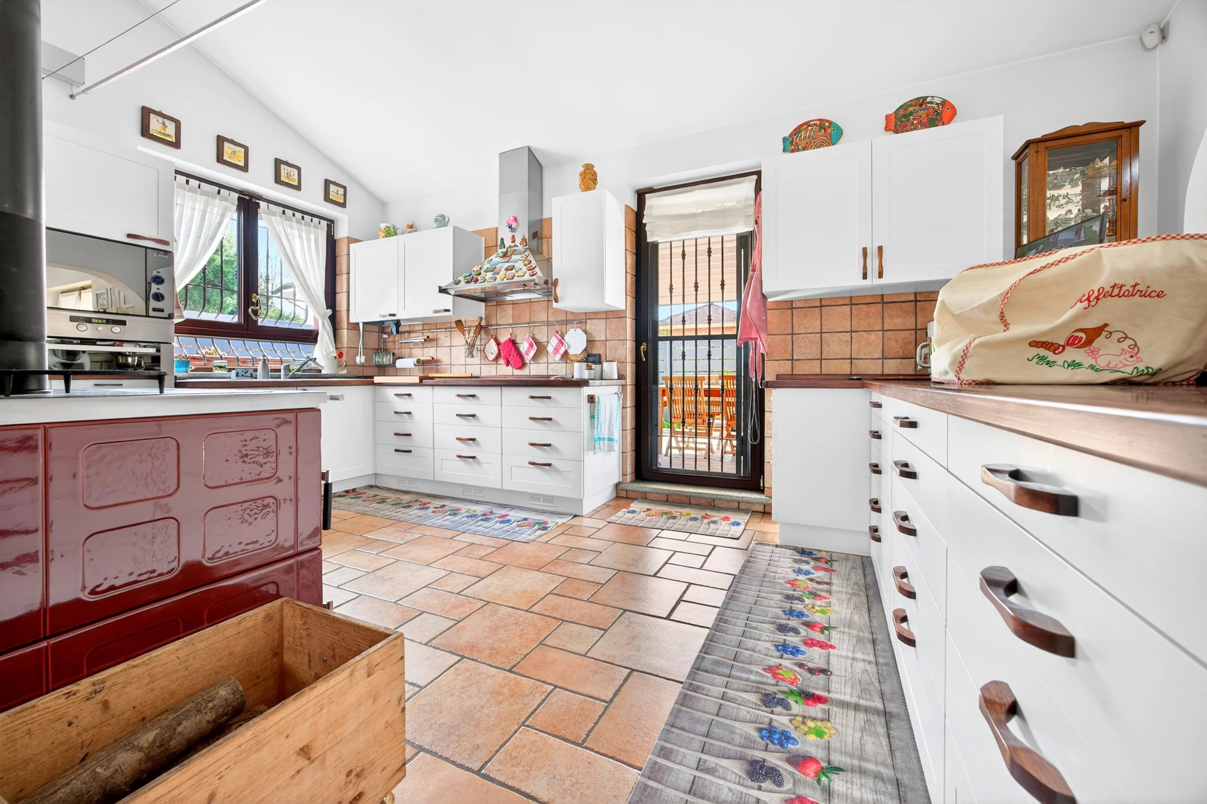 L'ingresso principale conduce a un ampio salone con zona pranzo, valorizzato da soffitti alti con travi a vista che donano calore e fascino; la cucina abitabile a vista è perfettamente integrata nel living. La zona notte è composta da tre camere da letto accoglienti, con la camera matrimoniale che vanta una cabina armadio dedicata e un bagno en-suite. Al piano interrato troviamo la taverna indipendente, uno spazio versatile di 60 mq con ingresso proprio, ideale come sala hobby o zona relax, completo di lavanderia e locali tecnici.