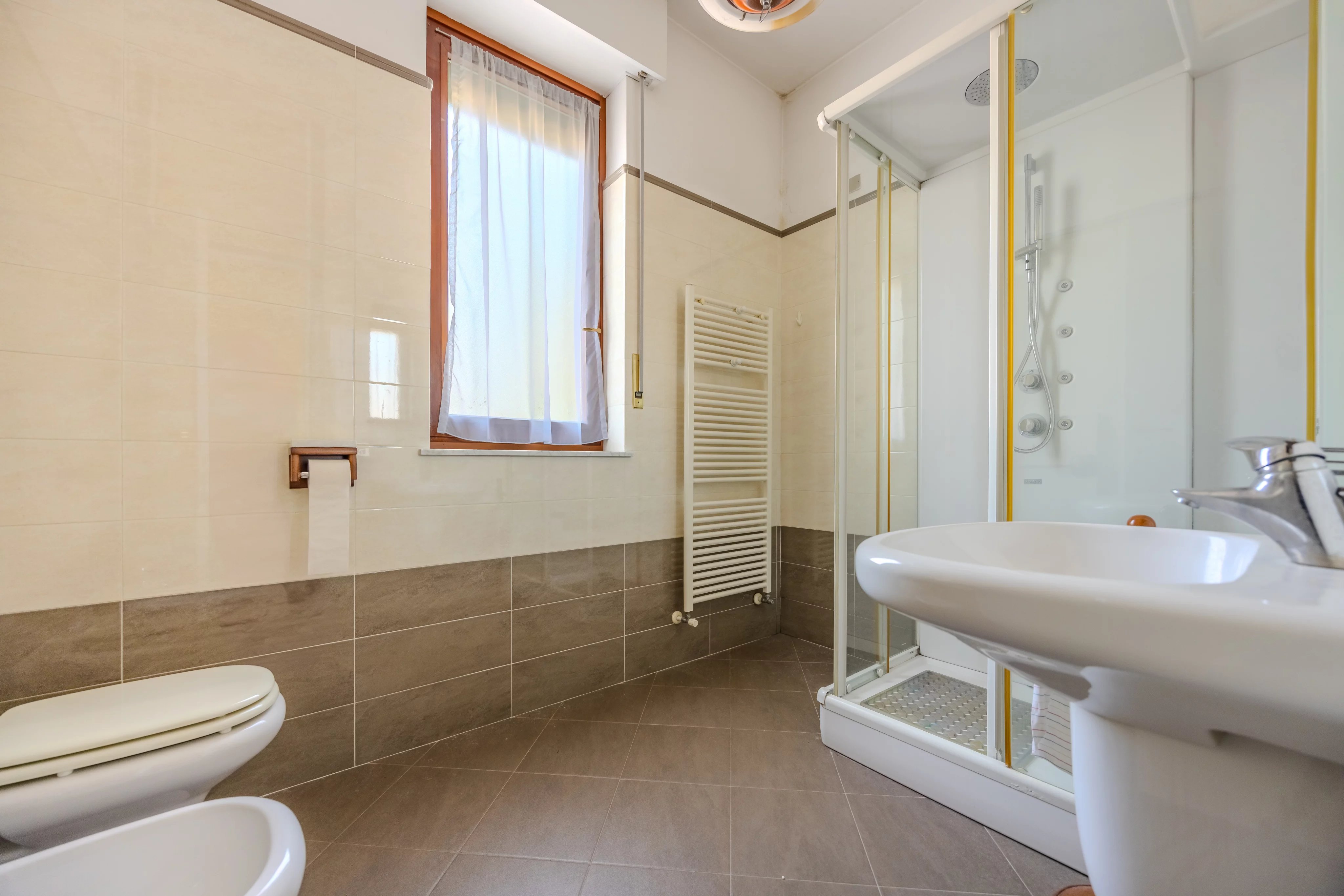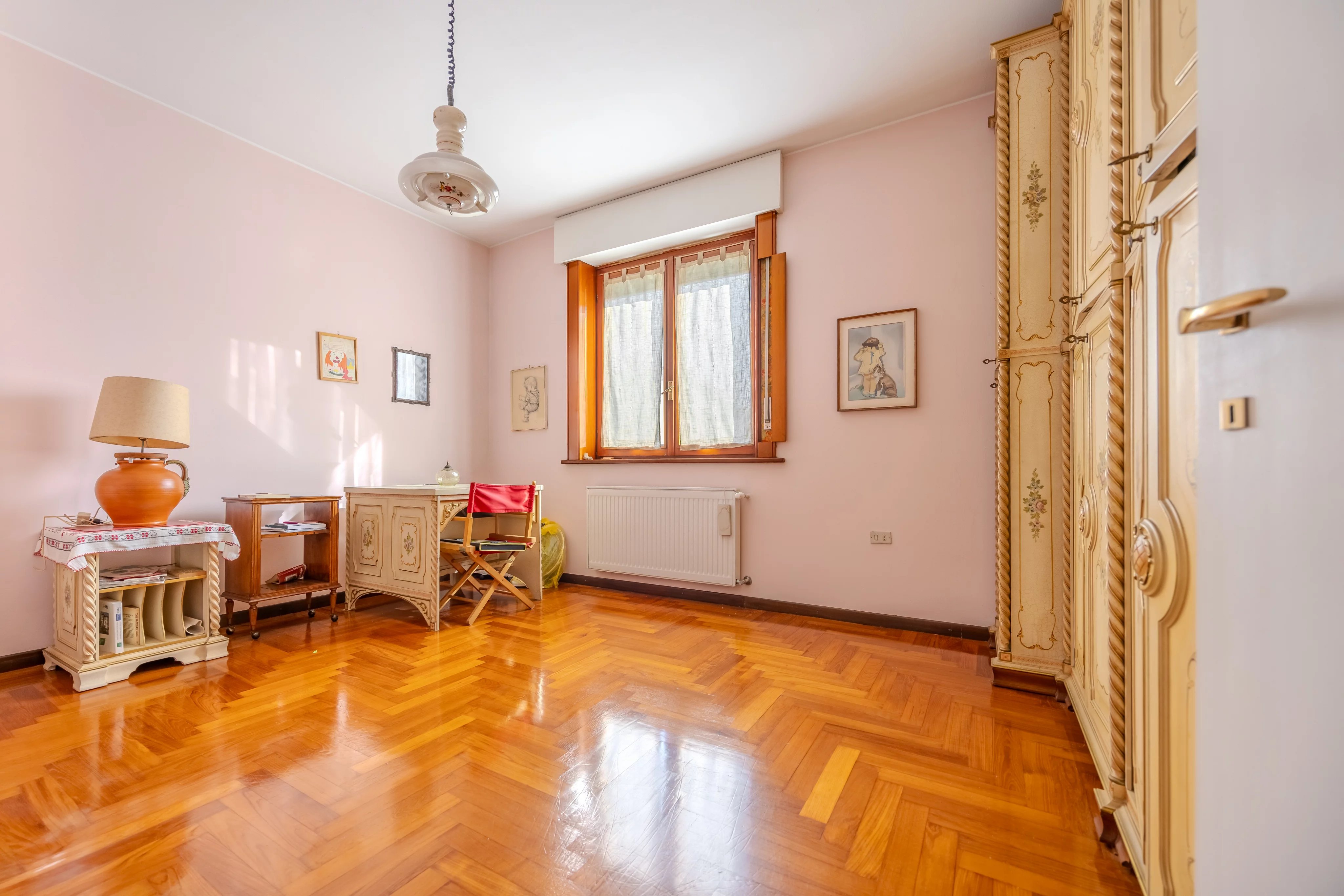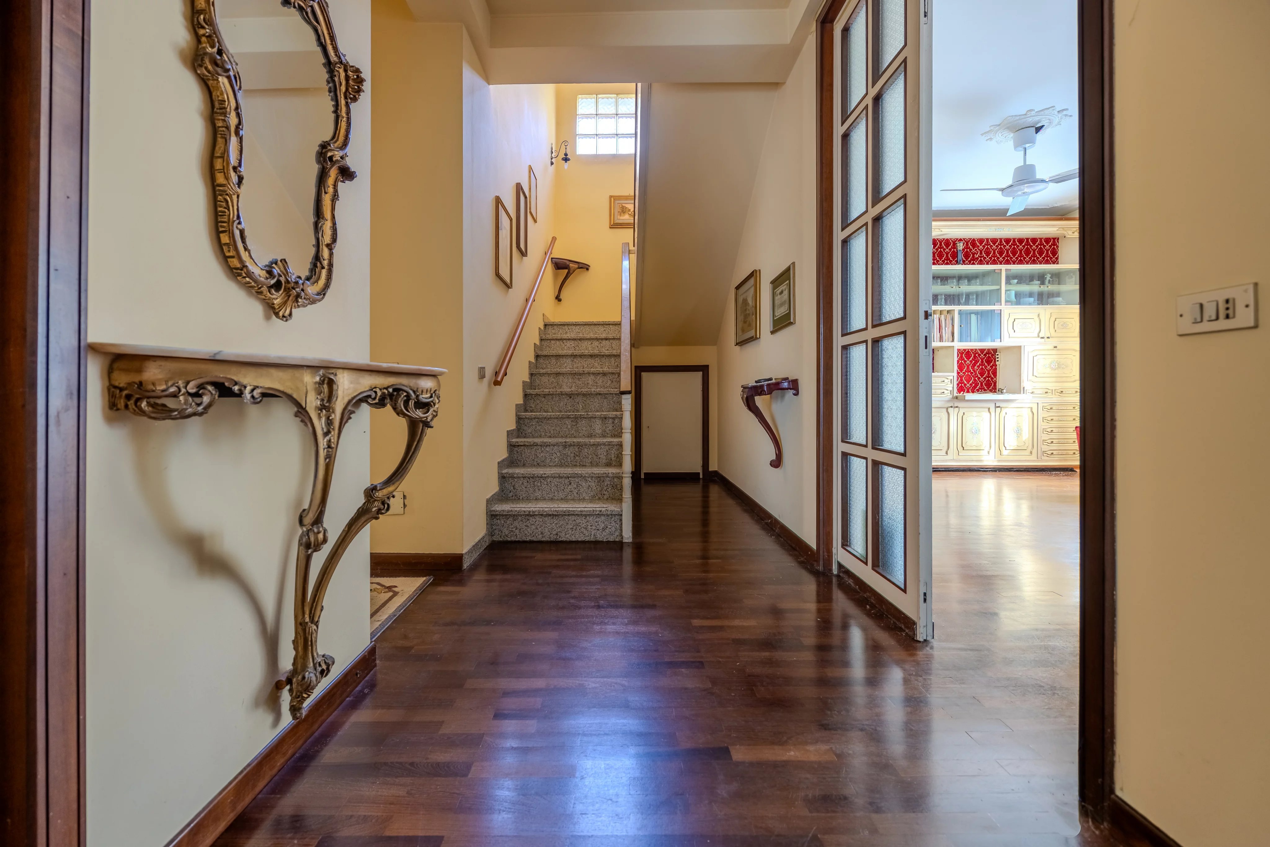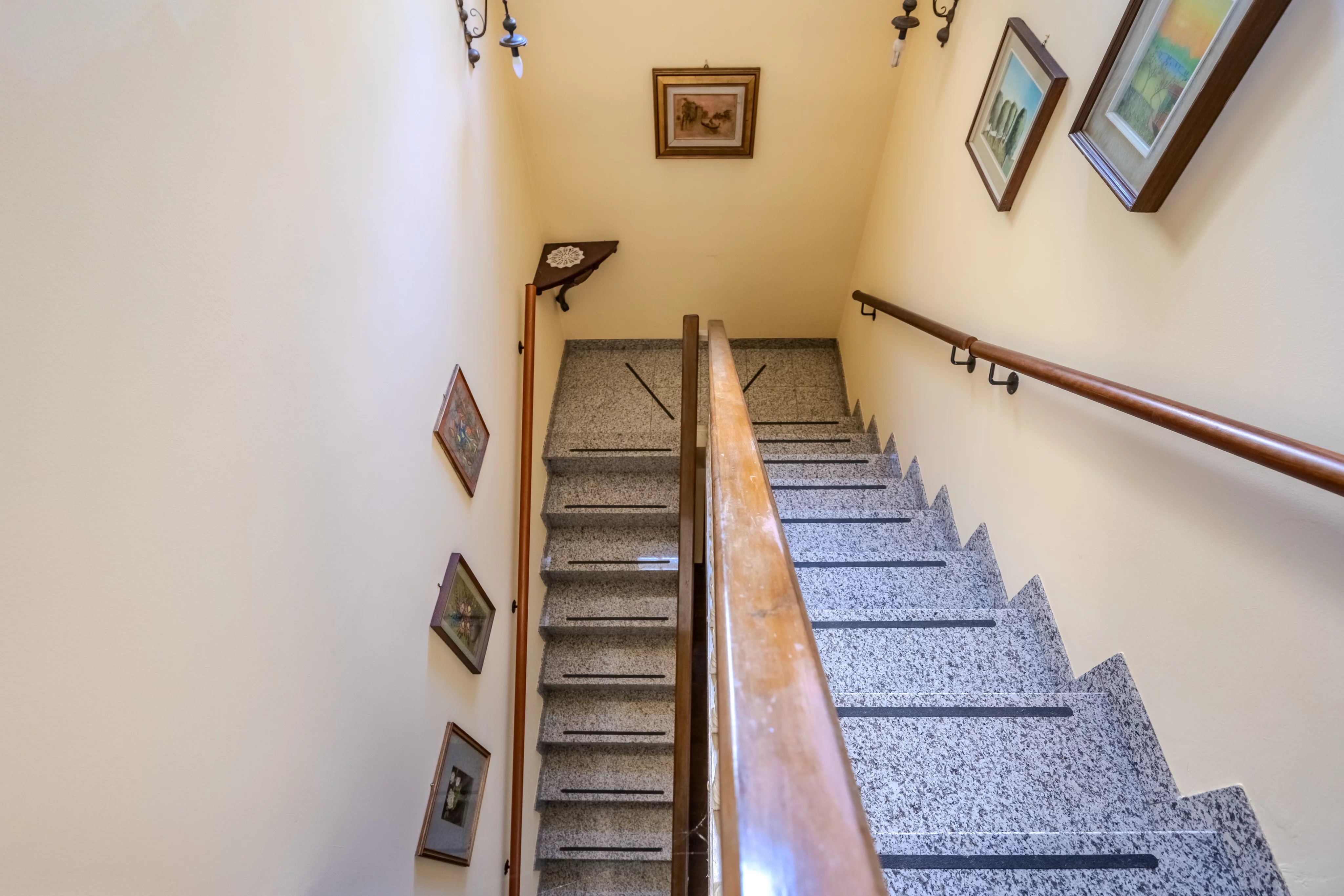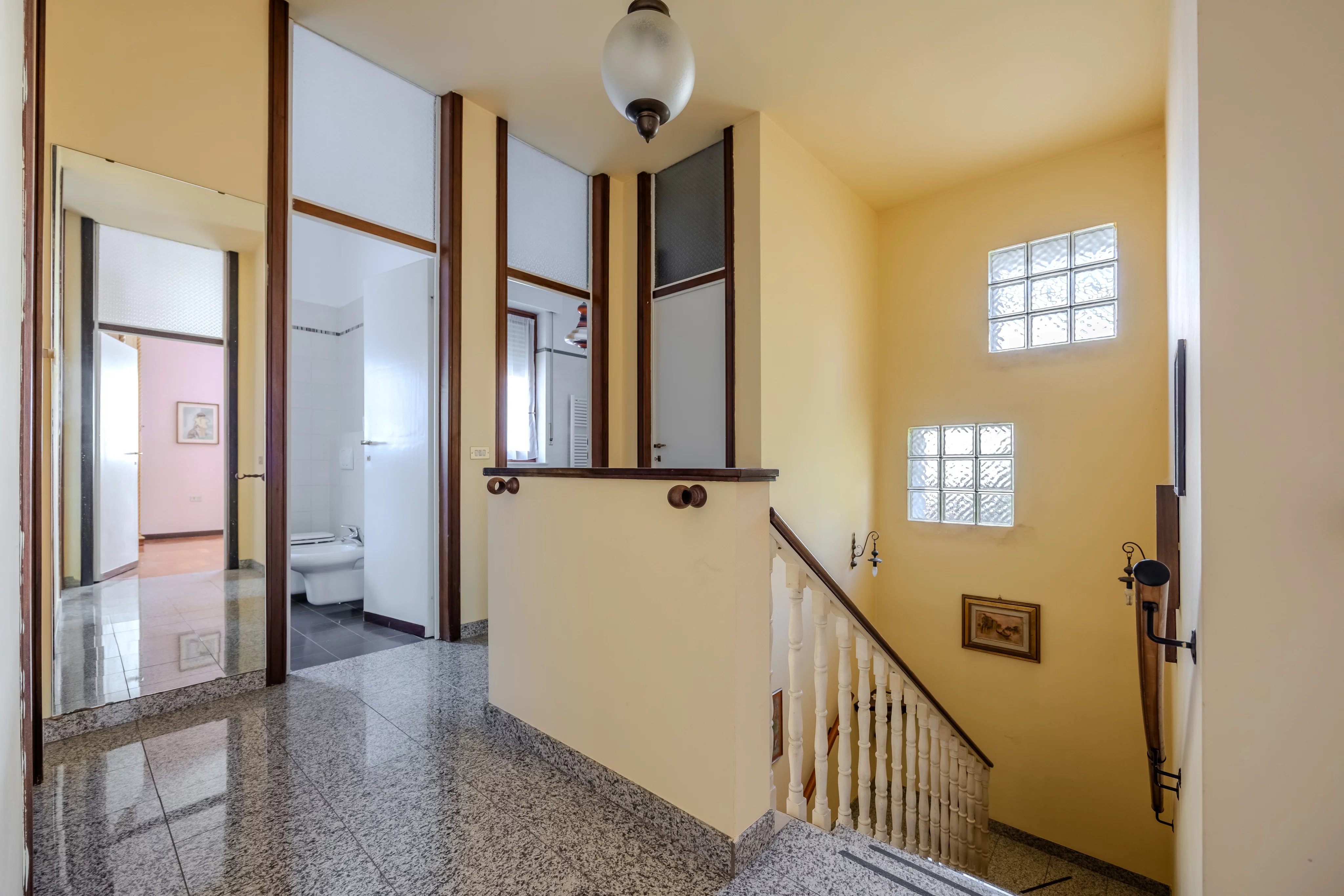 Una comoda scala conduce al primo piano, interamente dedicato alla zona notte. Qui si trovano tre generose camere da letto, tutte di ottima metratura, servite da doppi servizi finestrati e un pratico ripostiglio.